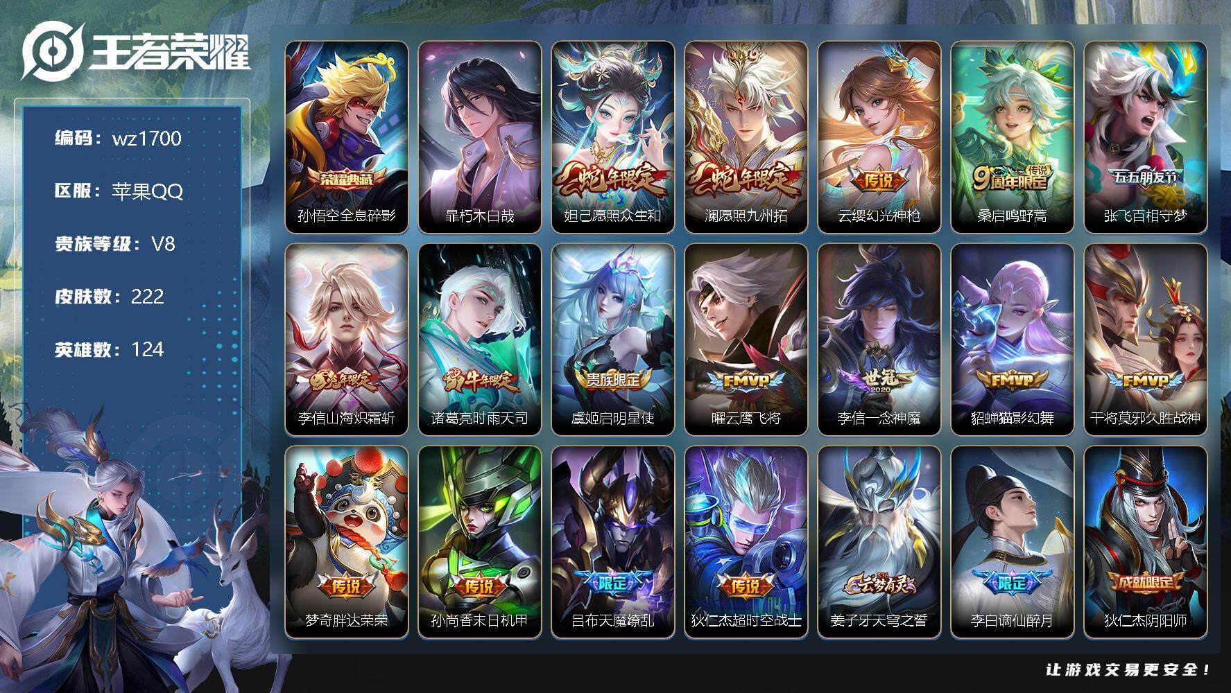 【游戏多多】 【可二次实名】【wz1700】【商品标题】:苹果Q-V8-永恒钻石I段位-124英雄-222皮肤-1典藏-0珍品无双-0无双-1珍品传说-16传说-58史诗 【荣耀典藏】:孙悟空全息碎影 【珍品传说】:暃朽木白哉 【传说皮肤】:妲己愿照众生和,澜愿照九州拓,云缨幻光神枪,桑启鸣野蒿,张飞百相守梦,李信山海炽霜斩,诸葛亮时雨天司,虞姬启明星使,曜云鹰飞将,李信一念神魔,貂蝉猫影幻舞,干将莫邪久胜战神,梦奇胖达荣荣,孙尚香末日机甲,吕布天魔缭乱,狄仁杰超时空战士 【限定皮肤】:姜子牙天穹之誓,李白谪仙醉月,狄仁杰阴阳师,赵云皇家上将,孙尚香蔷薇恋人,庄周玄嵩,孙膑天狼运算者,吕布天魔缭乱,吕布御风骁将,夏侯惇朔风刀,马可波罗山海玄木吟,狄仁杰魔术师,狄仁杰万华元夜,达摩沙漠行僧,项羽海滩派对,老夫子醍醐杖,程咬金演武夺筹,兰陵王金庭之子,后羿如梦令,张飞百相守梦,李元芳银河之约,李元芳云中旅人,虞姬启明星使,钟馗驱傩正仪,东皇太一逐梦之光,鬼谷子原初探秘者,诸葛亮时雨天司,苏烈千军破阵,弈星混沌棋,梦奇顽趣,沈梦溪星空之诺,沈梦溪大漠名商,明世隐疑决卦,裴擒虎李小龙,裴擒虎擒涛扼浪,云中君纤云弄巧,云中君时之祈愿,李信山海炽霜斩,盾山御銮,猪八戒西部大镖客,上官婉儿梁祝,嫦娥如梦令,嫦娥拒霜思,鲁班大师探海日志,桑启海盐诗旅,暃星界游侠,艾琳女武神,阿古朵江河有灵,张良古海寻踪,蒙犽百解令,鬼谷子天穹祈灯,刘邦剑破天穹 【年限皮肤】:吕布御风骁将,诸葛亮时雨天司,庄周玄嵩,马可波罗山海玄木吟,李信山海炽霜斩 【赛季限定】:夏侯惇朔风刀,狄仁杰万华元夜,达摩沙漠行僧,老夫子醍醐杖,程咬金演武夺筹,兰陵王金庭之子,张良古海寻踪,李元芳云中旅人,钟馗驱傩正仪,鬼谷子原初探秘者,苏烈千军破阵,弈星混沌棋,梦奇顽趣,沈梦溪大漠名商,明世隐疑决卦,裴擒虎擒涛扼浪,盾山御銮,鲁班大师探海日志,桑启海盐诗旅,鬼谷子天穹祈灯,刘邦剑破天穹,姜子牙天穹之誓 【战令限定】:李元芳银河之约,沈梦溪星空之诺,猪八戒西部大镖客,暃星界游侠 【史诗皮肤】:鲁班七号电玩小子,露娜紫霞仙子,赵云皇家上将,赵云未来纪元,貂蝉圣诞恋歌,狄仁杰魔术师,廉颇地狱岩魂,宫本武藏鬼剑武藏,孙尚香蔷薇恋人,孙尚香水果甜心,嬴政暗夜贵公子,妲己魅力维加斯,妲己女仆咖啡,墨子金属风暴,吕布圣诞狂欢,曹操幽灵船长,李白千年之狐,张飞乱世虎臣,花木兰水晶猎龙者,刘邦德古拉伯爵,夏侯惇乘风破浪,小乔缤纷独角兽,诸葛亮黄金分割率,亚瑟心灵战警,雅典娜冰冠公主,安琪拉心灵骇客,铠曙光守护者,蔡文姬舞动绿茵,刘禅天才门将,程咬金功夫厨神,阿轲节奏热浪,东皇太一逐梦之光,孙策猫狗日记,伽罗箭羽风息,狄仁杰鹰眼统帅,上官婉儿梁祝,李元芳银河之约,庄周玄嵩,嫦娥如梦令,后羿如梦令,不知火舞魅语,橘右京修罗,裴擒虎李小龙,云中君纤云弄巧,孙膑天狼运算者,吕布御风骁将,沈梦溪月团寄思,钟馗乐园奇幻夜,嫦娥拒霜思,云中君时之祈愿,梦奇顽趣,暃星界游侠,马可波罗山海玄木吟,阿古朵江河有灵,蒙犽百解令,李白谪仙醉月,牛魔星界战将,孙膑茶境仙 【其他皮肤】:项羽海滩派对,韩信街头霸王,露娜哥特玫瑰,达摩大发明家,赵云忍炎影,芈月红桃皇后,艾琳女武神,程咬金星际陆战队,白起白色死神,扁鹊化身博士,扁鹊救世之瞳,孙膑天使之翼,妲己少女阿狸,典韦黄金武士,亚瑟死亡骑士,达摩拳王,花木兰兔女郎,张飞五福同心,甄姬花好人间,宫本武藏万象初新,后羿阿尔法小队,狄仁杰阴阳师,刘备纽约教父,刘备汉昭烈帝,关羽龙腾万里,钟无艳海滩丽影,宫本武藏霸王丸,狂铁命运角斗场,老夫子功夫老勺,牛魔制霸全明星,孙尚香沉稳之力,李白敏锐之力,鬼谷子幻乐之宴,苏烈坚韧之力,庄周奇妙博物学,吕布野性能量,盾山御銮,孙膑归虚梦演,沈梦溪鲨炮海盗猫,姜子牙炽热元素使,夏侯惇朔风刀,沈梦溪星空之诺,弈星混沌棋,哪吒次元突破,鲁班七号黑桃队长,明世隐疑决卦,盾山圆桌骑士,老夫子醍醐杖,猪八戒西部大镖客,鬼谷子原初探秘者,狄仁杰万华元夜,杨戬次元傲视,露娜瓷语鉴心,程咬金演武夺筹,张良缤纷绘卷,钟馗驱傩正仪,鲁班大师乓乓大师,苏烈千军破阵,达摩沙漠行僧,程咬金无双福将,刘邦虎啸剑宗,兰陵王金庭之子,米莱狄契约魔法,沈梦溪大漠名商,蒙犽胡桃狂想曲,蒙恬蔚蓝守将,李元芳云中旅人,桑启海盐诗旅,海月幻泉雾影,猪八戒潮玩探月行,牛魔牛运亨通,赵怀真太极少年,裴擒虎擒涛扼浪,太乙真人劲辣红锅,鲁班大师探海日志,李元芳妄想特派,张良古海寻踪,海月王牌新星,亚连破局者,鬼谷子天穹祈灯,朵莉亚金色潮汐,廉颇功夫炙烤,亚瑟鸿运当头,刘邦剑破天穹,大司命暗都幽影,貂蝉长夏之忆,姜子牙天穹之誓,苍苍林狼骑,太乙真人谧流熔炉,典韦铁骨偃魂,马超访茗客,姜子牙星梦巡礼,达摩爆裂喵拳,少司缘灵