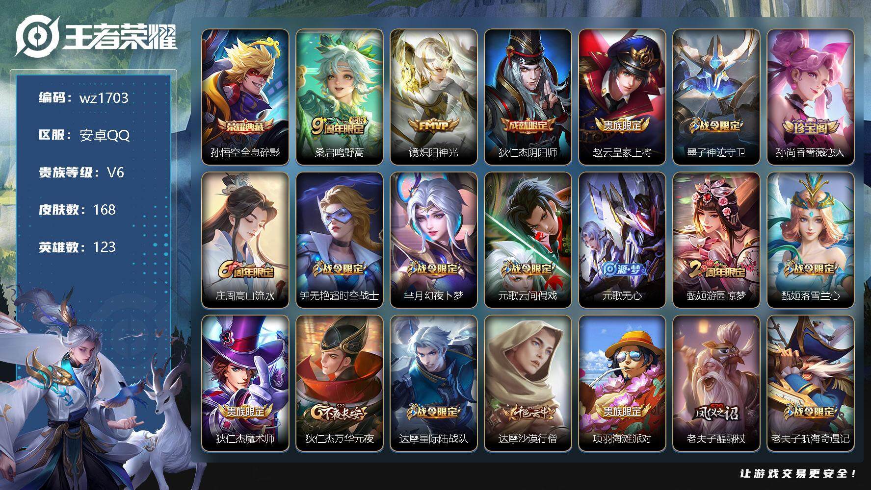 【游戏多多】 【可二次实名】【wz1703】【商品标题】:安卓Q-V6-至尊星耀IV段位-123英雄-168皮肤-1典藏-0珍品无双-0无双-0珍品传说-2传说-57史诗 【荣耀典藏】:孙悟空全息碎影 【传说皮肤】:桑启鸣野蒿,镜炽阳神光 【限定皮肤】:狄仁杰阴阳师,赵云皇家上将,墨子神迹守卫,孙尚香蔷薇恋人,庄周高山流水,钟无艳超时空战士,芈月幻夜卜梦,元歌云间偶戏,元歌无心,甄姬游园惊梦,甄姬落雪兰心,狄仁杰魔术师,狄仁杰万华元夜,达摩星际陆战队,达摩沙漠行僧,项羽海滩派对,老夫子醍醐杖,老夫子航海奇遇记,程咬金演武夺筹,韩信傲雪梅枪,兰陵王金庭之子,亚瑟潮玩骑士王,孙悟空大圣娶亲,后羿圣弓游侠,李元芳云中旅人,钟馗驱傩正仪,干将莫邪真爱魔法,雅典娜单词大作战,鬼谷子原初探秘者,鬼谷子五谷丰年,黄忠火炮绅士,苏烈千军破阵,沈梦溪大漠名商,裴擒虎李小龙,裴擒虎擒涛扼浪,米莱狄胡桃异想国,云中君纤云弄巧,伽罗天狼溯光者,猪八戒猪悟能,嫦娥暖冬兔眠,蒙犽狂想玩偶喵,鲁班大师探海日志,桑启海盐诗旅,暃星界游侠,张良古海寻踪,鬼谷子天穹祈灯,姬小满妄想食味,沈梦溪龙舞盛年,鲁班七号蔬乡物语,李元芳蔬乡物语,刘邦剑破天穹,程咬金群星魔术团 【赛季限定】:狄仁杰万华元夜,达摩沙漠行僧,老夫子醍醐杖,程咬金演武夺筹,兰陵王金庭之子,张良古海寻踪,李元芳云中旅人,钟馗驱傩正仪,鬼谷子原初探秘者,苏烈千军破阵,沈梦溪大漠名商,裴擒虎擒涛扼浪,鲁班大师探海日志,桑启海盐诗旅,鬼谷子天穹祈灯,刘邦剑破天穹 【战令限定】:墨子神迹守卫,钟无艳超时空战士,芈月幻夜卜梦,元歌云间偶戏,甄姬落雪兰心,达摩星际陆战队,老夫子航海奇遇记,亚瑟潮玩骑士王,后羿圣弓游侠,干将莫邪真爱魔法,雅典娜单词大作战,黄忠火炮绅士,米莱狄胡桃异想国,嫦娥暖冬兔眠,蒙犽狂想玩偶喵,暃星界游侠,鲁班七号蔬乡物语,李元芳蔬乡物语 【史诗皮肤】:鲁班七号电玩小子,项羽苍穹之光,阿轲暗夜猫娘,赵云嘻哈天王,赵云皇家上将,赵云未来纪元,貂蝉圣诞恋歌,甄姬冰雪圆舞曲,王昭君偶像歌手,狄仁杰魔术师,宫本武藏鬼剑武藏,孙尚香蔷薇恋人,孙尚香水果甜心,嬴政暗夜贵公子,嬴政摇滚巨星,妲己魅力维加斯,妲己女仆咖啡,墨子龙骑士,墨子金属风暴,吕布圣诞狂欢,曹操幽灵船长,刘邦德古拉伯爵,小乔缤纷独角兽,兰陵王暗隐猎兽者,诸葛亮黄金分割率,甄姬游园惊梦,亚瑟心灵战警,雅典娜冰冠公主,安琪拉心灵骇客,刘禅天才门将,李元芳逐浪之夏,程咬金功夫厨神,白起星夜王子,阿轲节奏热浪,孙策猫狗日记,孙悟空大圣娶亲,狄仁杰鹰眼统帅,蒙犽狂想玩偶喵,裴擒虎李小龙,云中君纤云弄巧,元歌云间偶戏,米莱狄胡桃异想国,老夫子航海奇遇记,伽罗天狼溯光者,干将莫邪真爱魔法,安琪拉时之奇旅,猪八戒猪悟能,庄周高山流水,黄忠火炮绅士,韩信傲雪梅枪,钟无艳超时空战士,鬼谷子五谷丰年,元歌无心,暃星界游侠,姬小满妄想食味,鲁班七号蔬乡物语,黄忠怒海争锋 【其他皮肤】:项羽海滩派对,韩信教廷特使,阿轲爱心护理,达摩大发明家,赵云白执事,赵云忍炎影,牛魔西部大镖客,扁鹊化身博士,扁鹊救世之瞳,安琪拉玩偶对对碰,孙膑天使之翼,妲己少女阿狸,典韦黄金武士,亚瑟死亡骑士,达摩拳王,甄姬花好人间,狄仁杰阴阳师,刘备纽约教父,钟无艳海滩丽影,王昭君幻想奇妙夜,老夫子功夫老勺,孙尚香沉稳之力,李白敏锐之力,鬼谷子幻乐之宴,苏烈坚韧之力,明世隐虹云星官,庄周奇妙博物学,小乔丁香结,孙膑归虚梦演,沈梦溪鲨炮海盗猫,哪吒次元突破,老夫子醍醐杖,狂铁特工战影,鬼谷子原初探秘者,雅典娜单词大作战,狄仁杰万华元夜,亚瑟潮玩骑士王,刘禅秘密基地,杨戬次元傲视,露娜瓷语鉴心,达摩星际陆战队,程咬金演武夺筹,张良缤纷绘卷,盘古重装意志,钟馗驱傩正仪,墨子神迹守卫,鲁班大师乓乓大师,苏烈千军破阵,后羿圣弓游侠,妲己紫罗兰之誓,达摩沙漠行僧,芈月幻夜卜梦,程咬金无双福将,兰陵王金庭之子,沈梦溪大漠名商,甄姬落雪兰心,李元芳云中旅人,桑启海盐诗旅,嫦娥暖冬兔眠,猪八戒潮玩探月行,赵怀真太极少年,裴擒虎擒涛扼浪,太乙真人劲辣红锅,鲁班大师探海日志,李元芳妄想特派,张良古海寻踪,后羿完美运算,鬼谷子天穹祈灯,廉颇功夫炙烤,沈梦溪龙舞盛年,李元芳蔬乡物语,刘邦剑破天穹,程咬金群星魔术团,东皇太一噬灭天穹,苍苍林狼骑,太乙真人谧流熔炉,姜子牙星梦巡礼,钟馗虚灵犬护,苏烈春野闲踪,张良灵野札记,阿古朵布丁狗之约,露娜命运加冕,甄姬逆浪荇歌,鲁班七号福禄兄弟,高渐离金属狂潮,钟无艳生化警戒,曹操死神来了,孙膑未来旅行,孙悟空西部大镖客,周瑜海军大将,后羿精灵王,李白范海辛,李元芳特种部队,刘邦圣殿之光,关羽天启骑士,蔡文姬蔷薇王座,苍维京掠夺者,女娲尼罗河女神,裴擒虎街头旋风,弈星踏雪寻梅,米莱狄精准探案法,盾山极