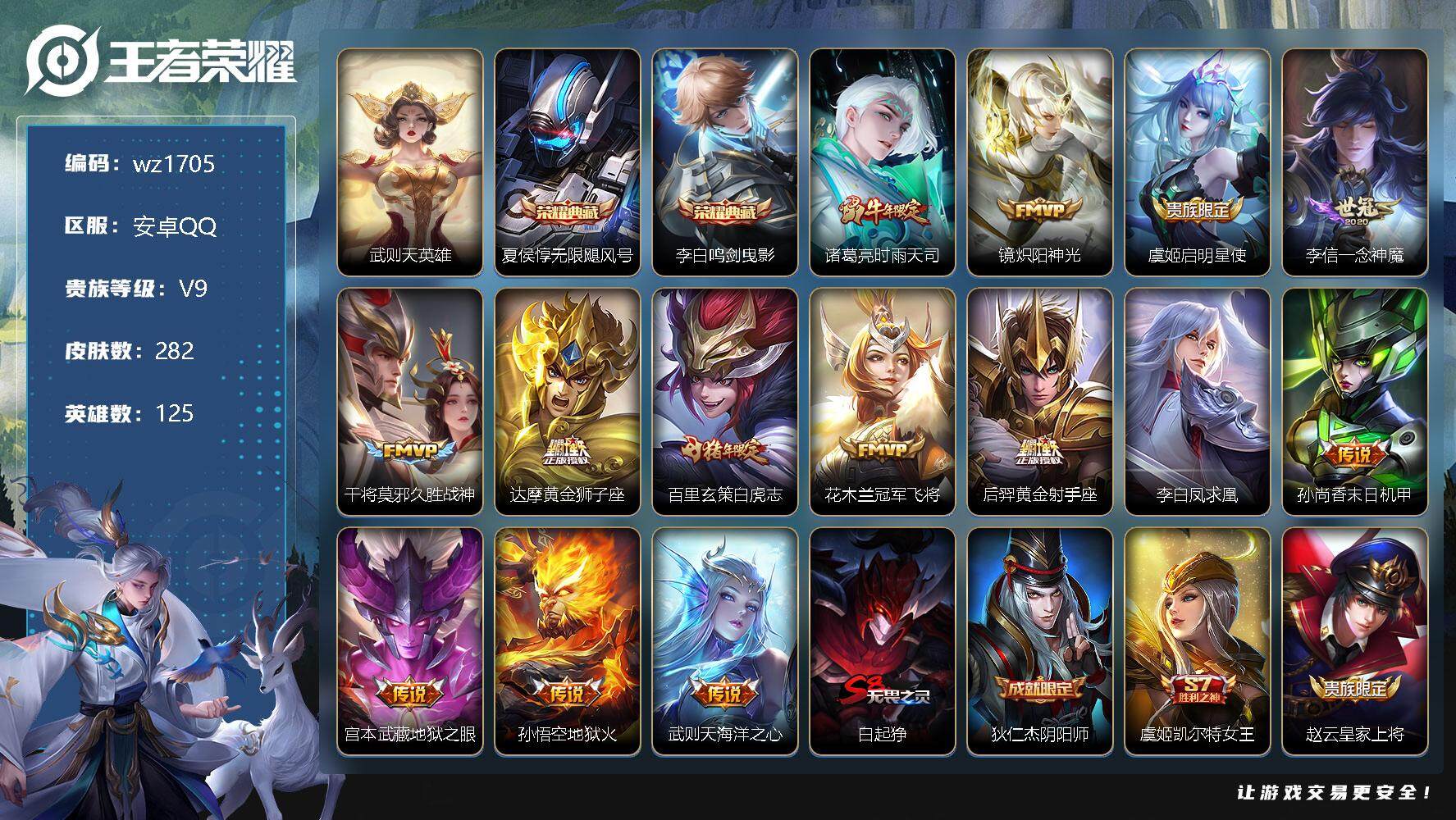 【游戏多多】 【可二次实名】【wz1705】【商品标题】:安卓Q-V9-至尊星耀III段位-125英雄-282皮肤-2典藏-0珍品无双-0无双-0珍品传说-14传说-92史诗 【荣耀典藏】:武则天英雄,夏侯惇无限飓风号,李白鸣剑曳影 【传说皮肤】:诸葛亮时雨天司,镜炽阳神光,虞姬启明星使,李信一念神魔,干将莫邪久胜战神,达摩黄金狮子座,百里玄策白虎志,花木兰冠军飞将,后羿黄金射手座,李白凤求凰,孙尚香末日机甲,宫本武藏地狱之眼,孙悟空地狱火,武则天海洋之心 【限定皮肤】:白起狰,狄仁杰阴阳师,虞姬凯尔特女王,赵云皇家上将,赵云引擎之心,墨子神迹守卫,嬴政白昼王子,鲁班七号狮舞东方,庄周高山流水,高渐离玩趣恶龙,阿轲迷踪丽影,扁鹊炼金王,白起夜都怪侠,芈月重明,芈月白晶晶,芈月幻夜卜梦,吕布猎兽之王,周瑜赤莲之焰,元歌云间偶戏,夏侯惇朔风刀,甄姬游园惊梦,曹操烛龙,典韦穷奇,典韦蓝屏警告,马可波罗逐梦之星,马可波罗暗影游猎,狄仁杰魔术师,狄仁杰万华元夜,达摩星际陆战队,达摩沙漠行僧,项羽海滩派对,项羽霸王别姬,老夫子航海奇遇记,关羽冰锋战神,安琪拉魔法小厨娘,程咬金演武夺筹,刘邦夺宝奇兵,韩信逐梦之影,王昭君凤凰于飞,兰陵王驯魔猎人,兰陵王金庭之子,花木兰青春决赛季,亚瑟潮玩骑士王,孙悟空至尊宝,孙悟空孙行者,牛魔御旌,牛魔奔雷神使,后羿圣弓游侠,李元芳银河之约,李元芳云中旅人,虞姬霸王别姬,虞姬启明星使,钟馗神迹守卫,钟馗驱傩正仪,杨玉环遇见飞天,女娲朔望之晖,干将莫邪冰霜恋舞曲,干将莫邪真爱魔法,雅典娜单词大作战,雅典娜黎明之约,蔡文姬繁星吟游,太乙真人饕餮,鬼谷子原初探秘者,诸葛亮时雨天司,黄忠火炮绅士,铠青龙志,苏烈千军破阵,百里玄策白虎志,百里玄策原初追逐者,百里守约朱雀志,弈星混沌棋,沈梦溪星空之诺,沈梦溪大漠名商,明世隐疑决卦,明世隐吟游魔法,裴擒虎李小龙,裴擒虎擒涛扼浪,狂铁御狮,米莱狄御霄,米莱狄胡桃异想国,云中君纤云弄巧,盾山御銮,猪八戒西部大镖客,猪八戒猪悟能,上官婉儿梁祝,嫦娥拒霜思,蒙犽狂想玩偶喵,鲁班大师探海日志,桑启海盐诗旅,张良古海寻踪,鬼谷子天穹祈灯,刘邦剑破天穹 【年限皮肤】:百里玄策白虎志,百里守约朱雀志,铠青龙志,王昭君凤凰于飞,李白凤求凰,牛魔奔雷神使,诸葛亮时雨天司,马超神威 【赛季限定】:扁鹊炼金王,白起狰,芈月重明,夏侯惇朔风刀,曹操烛龙,典韦穷奇,狄仁杰万华元夜,达摩沙漠行僧,程咬金演武夺筹,兰陵王金庭之子,张良古海寻踪,牛魔御旌,李元芳云中旅人,虞姬凯尔特女王,钟馗驱傩正仪,雅典娜黎明之约,太乙真人饕餮,鬼谷子原初探秘者,苏烈千军破阵,百里玄策原初追逐者,弈星混沌棋,沈梦溪大漠名商,明世隐疑决卦,裴擒虎擒涛扼浪,狂铁御狮,米莱狄御霄,盾山御銮,鲁班大师探海日志,桑启海盐诗旅,鬼谷子天穹祈灯,刘邦剑破天穹 【战令限定】:墨子神迹守卫,嬴政白昼王子,鲁班七号狮舞东方,阿轲迷踪丽影,白起夜都怪侠,芈月幻夜卜梦,吕布猎兽之王,周瑜赤莲之焰,元歌云间偶戏,典韦蓝屏警告,马可波罗暗影游猎,达摩星际陆战队,老夫子航海奇遇记,刘邦夺宝奇兵,兰陵王驯魔猎人,亚瑟潮玩骑士王,后羿圣弓游侠,李元芳银河之约,钟馗神迹守卫,女娲朔望之晖,干将莫邪真爱魔法,雅典娜单词大作战,黄忠火炮绅士,沈梦溪星空之诺,明世隐吟游魔法,米莱狄胡桃异想国,猪八戒西部大镖客,蒙犽狂想玩偶喵 【史诗皮肤】:鲁班七号电玩小子,项羽苍穹之光,阿轲暗夜猫娘,赵云皇家上将,赵云未来纪元,貂蝉圣诞恋歌,甄姬冰雪圆舞曲,王昭君偶像歌手,狄仁杰魔术师,廉颇地狱岩魂,宫本武藏鬼剑武藏,孙尚香水果甜心,嬴政摇滚巨星,妲己魅力维加斯,妲己女仆咖啡,墨子龙骑士,墨子金属风暴,吕布圣诞狂欢,刘禅绅士熊喵,曹操幽灵船长,李白千年之狐,吕布末日机甲,安琪拉魔法小厨娘,张飞乱世虎臣,韩信白龙吟,项羽霸王别姬,虞姬霸王别姬,关羽冰锋战神,王昭君凤凰于飞,孙悟空至尊宝,赵云引擎之心,花木兰水晶猎龙者,刘邦德古拉伯爵,韩信逐梦之影,夏侯惇乘风破浪,小乔缤纷独角兽,兰陵王暗隐猎兽者,诸葛亮黄金分割率,甄姬游园惊梦,马可波罗逐梦之星,亚瑟心灵战警,雅典娜冰冠公主,安琪拉心灵骇客,花木兰青春决赛季,百里守约特工魅影,铠曙光守护者,蔡文姬舞动绿茵,刘禅天才门将,李元芳逐浪之夏,程咬金功夫厨神,白起星夜王子,阿轲节奏热浪,杨玉环遇见飞天,嬴政白昼王子,孙策猫狗日记,铠青龙志,百里守约朱雀志,干将莫邪冰霜恋舞曲,典韦蓝屏警告,伽罗箭羽风息,鲁班七号狮舞东方,狄仁杰鹰眼统帅,公孙离无限星赏官,兰陵王驯魔猎人,上官婉儿梁祝,蔡文姬繁星吟游,李元芳银河之约,娜可露露晚萤,阿轲迷踪丽影,橘右京修罗,马超神威,马可波罗暗影游猎,蒙犽狂想玩偶喵,百里玄策原初追逐者,裴擒虎李小龙,云中君纤云弄巧,元歌云间偶戏,