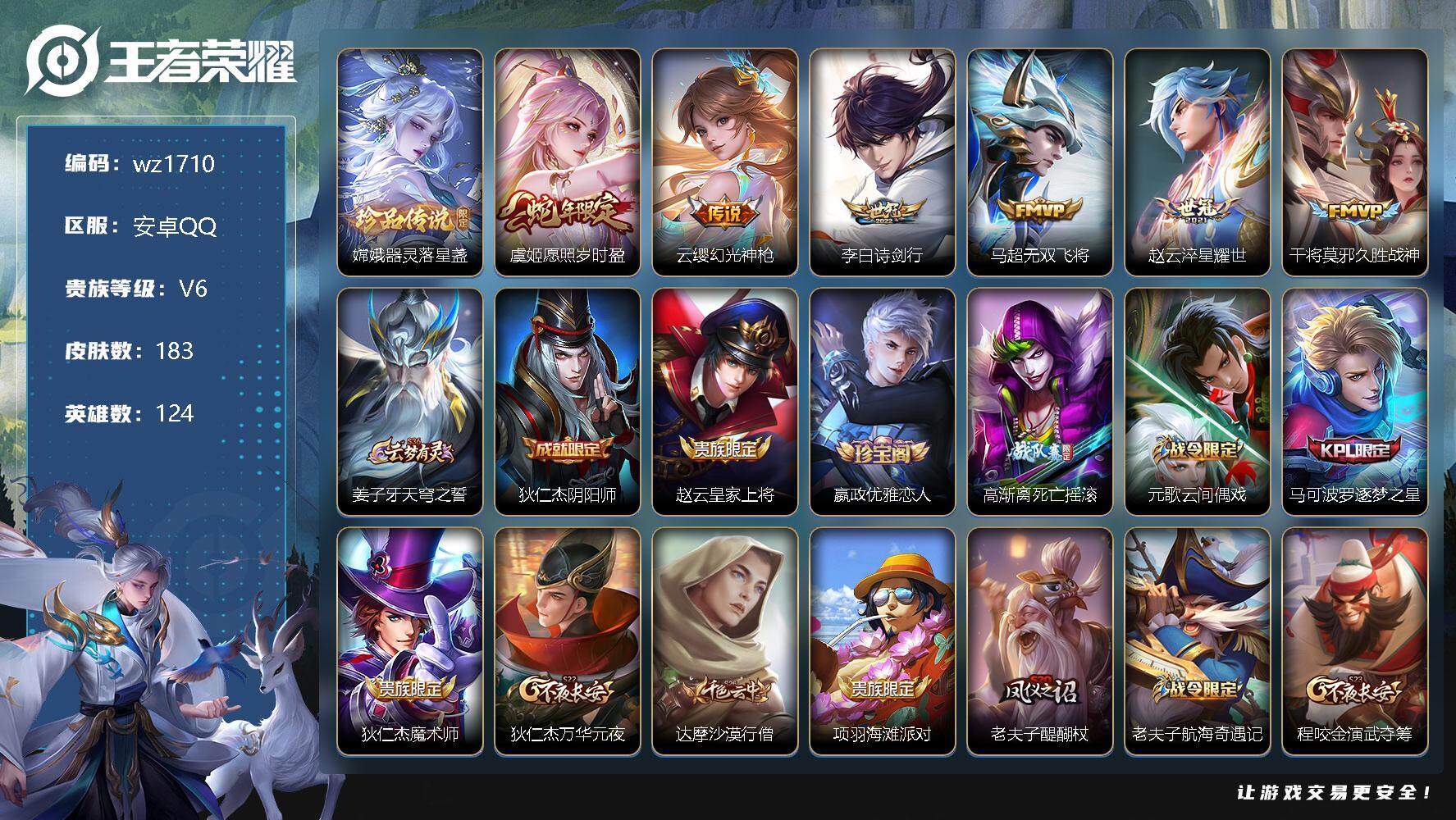 【游戏多多】 【可二次实名】【wz1710】【商品标题】:安卓Q-V6-最强王者段位-124英雄-183皮肤-0典藏-0珍品无双-0无双-1珍品传说-6传说-52史诗 【珍品传说】:嫦娥器灵落星盏 【传说皮肤】:虞姬愿照岁时盈,云缨幻光神枪,李白诗剑行,马超无双飞将,赵云淬星耀世,干将莫邪久胜战神 【限定皮肤】:姜子牙天穹之誓,狄仁杰阴阳师,赵云皇家上将,嬴政优雅恋人,高渐离死亡摇滚,元歌云间偶戏,马可波罗逐梦之星,狄仁杰魔术师,狄仁杰万华元夜,达摩沙漠行僧,项羽海滩派对,老夫子醍醐杖,老夫子航海奇遇记,程咬金演武夺筹,兰陵王金庭之子,亚瑟潮玩骑士王,孙悟空大圣娶亲,孙悟空孙行者,李元芳云中旅人,钟馗驱傩正仪,干将莫邪胡桃夹子,雅典娜单词大作战,太乙真人华丽摇滚,鬼谷子原初探秘者,鬼谷子五谷丰年,苏烈千军破阵,百里玄策原初追逐者,梦奇顽趣,沈梦溪大漠名商,明世隐疑决卦,裴擒虎李小龙,裴擒虎擒涛扼浪,云中君纤云弄巧,上官婉儿梁祝,嫦娥拒霜思,嫦娥暖冬兔眠,蒙犽狂想玩偶喵,鲁班大师探海日志,桑启海盐诗旅,暃星界游侠,阿古朵江河有灵,张良古海寻踪,蒙犽百解令,蒙恬荣光圣徽,高渐离燃音魔法,妲己灵卜魔法,鬼谷子天穹祈灯,刘邦剑破天穹 【赛季限定】:狄仁杰万华元夜,达摩沙漠行僧,老夫子醍醐杖,程咬金演武夺筹,兰陵王金庭之子,张良古海寻踪,李元芳云中旅人,钟馗驱傩正仪,鬼谷子原初探秘者,苏烈千军破阵,百里玄策原初追逐者,梦奇顽趣,沈梦溪大漠名商,明世隐疑决卦,裴擒虎擒涛扼浪,鲁班大师探海日志,桑启海盐诗旅,鬼谷子天穹祈灯,蒙恬荣光圣徽,刘邦剑破天穹,姜子牙天穹之誓 【战令限定】:元歌云间偶戏,老夫子航海奇遇记,亚瑟潮玩骑士王,雅典娜单词大作战,嫦娥暖冬兔眠,蒙犽狂想玩偶喵,暃星界游侠,高渐离燃音魔法,妲己灵卜魔法 【史诗皮肤】:鲁班七号电玩小子,项羽苍穹之光,赵云皇家上将,赵云未来纪元,甄姬冰雪圆舞曲,狄仁杰魔术师,宫本武藏鬼剑武藏,孙尚香水果甜心,嬴政优雅恋人,嬴政摇滚巨星,妲己魅力维加斯,妲己女仆咖啡,墨子金属风暴,吕布圣诞狂欢,曹操幽灵船长,李白千年之狐,张飞乱世虎臣,韩信白龙吟,花木兰水晶猎龙者,刘邦德古拉伯爵,夏侯惇乘风破浪,小乔缤纷独角兽,马可波罗逐梦之星,亚瑟心灵战警,百里守约特工魅影,蔡文姬舞动绿茵,刘禅天才门将,李元芳逐浪之夏,程咬金功夫厨神,阿轲节奏热浪,孙悟空大圣娶亲,狄仁杰鹰眼统帅,上官婉儿梁祝,小乔青蛇,橘右京修罗,孙尚香时之恋人,蒙犽狂想玩偶喵,百里玄策原初追逐者,裴擒虎李小龙,云中君纤云弄巧,元歌云间偶戏,老夫子航海奇遇记,孙悟空孙行者,嫦娥拒霜思,鬼谷子五谷丰年,梦奇顽趣,暃星界游侠,阿古朵江河有灵,蒙犽百解令,妲己灵卜魔法,高渐离燃音魔法,蒙恬荣光圣徽,黄忠百相守梦 【其他皮肤】:项羽海滩派对,韩信教廷特使,韩信街头霸王,露娜哥特玫瑰,达摩大发明家,赵云忍炎影,白起白色死神,牛魔西部大镖客,扁鹊化身博士,安琪拉玩偶对对碰,妲己少女阿狸,典韦黄金武士,亚瑟死亡骑士,达摩拳王,花木兰兔女郎,张飞五福同心,甄姬花好人间,刘备万事如意,狄仁杰阴阳师,刘备纽约教父,高渐离死亡摇滚,关羽龙腾万里,钟无艳海滩丽影,宫本武藏霸王丸,老夫子功夫老勺,孙尚香沉稳之力,诸葛亮掌控之力,鬼谷子幻乐之宴,太乙真人华丽摇滚,苏烈坚韧之力,大乔守护之力,明世隐虹云星官,庄周奇妙博物学,吕布野性能量,孙膑归虚梦演,沈梦溪鲨炮海盗猫,姜子牙炽热元素使,哪吒次元突破,明世隐疑决卦,盾山圆桌骑士,老夫子醍醐杖,狂铁特工战影,鬼谷子原初探秘者,雅典娜单词大作战,狄仁杰万华元夜,亚瑟潮玩骑士王,刘禅秘密基地,程咬金演武夺筹,张良缤纷绘卷,盘古重装意志,钟馗驱傩正仪,鲁班大师乓乓大师,苏烈千军破阵,干将莫邪胡桃夹子,达摩沙漠行僧,程咬金无双福将,刘邦虎啸剑宗,兰陵王金庭之子,刘禅唤灵魔甲,沈梦溪大漠名商,蒙恬蔚蓝守将,李元芳云中旅人,刘备潮玩造梦师,桑启海盐诗旅,嫦娥暖冬兔眠,海月幻泉雾影,猪八戒潮玩探月行,牛魔牛运亨通,白起乐园追猎者,赵怀真太极少年,裴擒虎擒涛扼浪,太乙真人劲辣红锅,莱西奥西部游侠,鲁班大师探海日志,姬小满零食大作战,李元芳妄想特派,哪吒热血海滩,张良古海寻踪,钟无艳聚星闪耀,亚连破局者,曹操决胜大满贯,后羿完美运算,鬼谷子天穹祈灯,妲己灵卜魔法,海诺时空谍影,嫦娥漠中幻影,朵莉亚金色潮汐,廉颇功夫炙烤,钟无艳春野之旅,刘邦剑破天穹,姜子牙天穹之誓,东皇太一噬灭天穹,太乙真人谧流熔炉,姜子牙星梦巡礼,甄姬逆浪荇歌,高渐离金属狂潮,项羽帝国元帅,貂蝉异域舞娘,老夫子潮流仙人,狄仁杰锦衣卫,曹操超能战警,小乔万圣前夜,孙悟空西部大镖客,周瑜海军大将,后羿精灵王,刘禅英喵野望,李白范海辛,刘邦圣殿之光,虞姬加勒比小姐,关羽天启骑士,夏侯惇战争骑士,马可波罗激