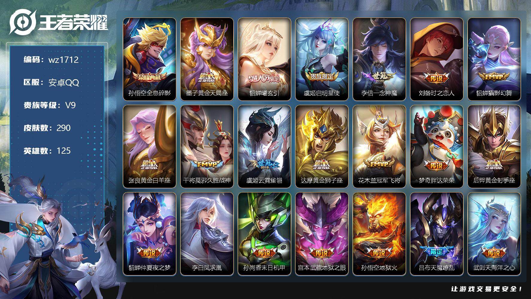 【游戏多多】 【可二次实名】【wz1712】【商品标题】:安卓Q-V9-至尊星耀IV段位-125英雄-290皮肤-1典藏-0珍品无双-0无双-0珍品传说-21传说-84史诗 【荣耀典藏】:孙悟空全息碎影 【传说皮肤】:墨子黄金天蝎座,貂蝉曦玄引,虞姬启明星使,李信一念神魔,刘备时之恋人,貂蝉猫影幻舞,张良黄金白羊座,干将莫邪久胜战神,虞姬云霓雀翎,达摩黄金狮子座,花木兰冠军飞将,梦奇胖达荣荣,后羿黄金射手座,貂蝉仲夏夜之梦,李白凤求凰,孙尚香末日机甲,宫本武藏地狱之眼,孙悟空地狱火,吕布天魔缭乱,武则天海洋之心,狄仁杰超时空战士 【限定皮肤】:姜子牙天穹之誓,狄仁杰阴阳师,赵云皇家上将,赵云龙胆,妲己时之彼端,孙尚香蔷薇恋人,鲁班七号狮舞东方,阿轲迷踪丽影,吕布天魔缭乱,吕布猎兽之王,周瑜赤莲之焰,夏侯惇朔风刀,曹操天狼征服者,典韦蓝屏警告,马可波罗暗影游猎,狄仁杰魔术师,项羽海滩派对,老夫子醍醐杖,程咬金演武夺筹,刘邦夺宝奇兵,韩信飞衡,兰陵王驯魔猎人,孙悟空至尊宝,孙悟空大圣娶亲,牛魔御旌,后羿如梦令,李元芳银河之约,虞姬启明星使,钟馗神迹守卫,钟馗驱傩正仪,女娲朔望之晖,雅典娜单词大作战,蔡文姬繁星吟游,鬼谷子原初探秘者,黄忠烈魂,铠青龙志,弈星混沌棋,沈梦溪星空之诺,明世隐疑决卦,裴擒虎天狼狩猎者,裴擒虎李小龙,米莱狄御霄,盾山御銮,猪八戒西部大镖客,上官婉儿梁祝,上官婉儿天狼绘梦者,蒙犽狂想玩偶喵,裴擒虎梅西,高渐离燃音魔法,妲己灵卜魔法,鬼谷子天穹祈灯,伽罗琥珀纪元,貂蝉曦玄引,沈梦溪龙舞盛年,鲁班七号蔬乡物语,李元芳蔬乡物语,刘邦剑破天穹,刘备异域游侠 【年限皮肤】:铠青龙志,李白凤求凰,韩信飞衡,马超神威,黄忠烈魂,赵云龙胆 【赛季限定】:夏侯惇朔风刀,老夫子醍醐杖,程咬金演武夺筹,牛魔御旌,钟馗驱傩正仪,鬼谷子原初探秘者,弈星混沌棋,明世隐疑决卦,米莱狄御霄,盾山御銮,鬼谷子天穹祈灯,刘邦剑破天穹,姜子牙天穹之誓 【战令限定】:鲁班七号狮舞东方,阿轲迷踪丽影,吕布猎兽之王,周瑜赤莲之焰,典韦蓝屏警告,马可波罗暗影游猎,刘邦夺宝奇兵,兰陵王驯魔猎人,李元芳银河之约,钟馗神迹守卫,女娲朔望之晖,雅典娜单词大作战,沈梦溪星空之诺,猪八戒西部大镖客,蒙犽狂想玩偶喵,高渐离燃音魔法,妲己灵卜魔法,鲁班七号蔬乡物语,李元芳蔬乡物语 【史诗皮肤】:鲁班七号电玩小子,项羽苍穹之光,露娜紫霞仙子,赵云皇家上将,赵云未来纪元,貂蝉圣诞恋歌,甄姬冰雪圆舞曲,王昭君偶像歌手,狄仁杰魔术师,廉颇地狱岩魂,宫本武藏鬼剑武藏,孙尚香蔷薇恋人,孙尚香水果甜心,嬴政暗夜贵公子,嬴政摇滚巨星,妲己魅力维加斯,妲己女仆咖啡,墨子金属风暴,吕布圣诞狂欢,刘禅绅士熊喵,曹操幽灵船长,李白千年之狐,吕布末日机甲,张飞乱世虎臣,韩信白龙吟,孙悟空至尊宝,花木兰水晶猎龙者,刘邦德古拉伯爵,夏侯惇乘风破浪,小乔缤纷独角兽,兰陵王暗隐猎兽者,诸葛亮黄金分割率,亚瑟心灵战警,雅典娜冰冠公主,安琪拉心灵骇客,百里守约特工魅影,铠曙光守护者,蔡文姬舞动绿茵,裴擒虎梅西,刘禅天才门将,李元芳逐浪之夏,程咬金功夫厨神,白起星夜王子,阿轲节奏热浪,孙策猫狗日记,大乔猫狗日记,铠青龙志,孙悟空大圣娶亲,典韦蓝屏警告,伽罗箭羽风息,裴擒虎天狼狩猎者,鲁班七号狮舞东方,狄仁杰鹰眼统帅,公孙离无限星赏官,兰陵王驯魔猎人,上官婉儿梁祝,曹操天狼征服者,蔡文姬繁星吟游,李元芳银河之约,娜可露露晚萤,韩信飞衡,妲己时之彼端,后羿如梦令,大乔白蛇,小乔青蛇,不知火舞魅语,阿轲迷踪丽影,橘右京修罗,瑶遇见神鹿,马超神威,赵云龙胆,黄忠烈魂,孙尚香时之恋人,上官婉儿天狼绘梦者,马可波罗暗影游猎,蒙犽狂想玩偶喵,裴擒虎李小龙,沈梦溪月团寄思,妲己灵卜魔法,高渐离燃音魔法,伽罗琥珀纪元,鲁班七号蔬乡物语,扁鹊灵蛊蚀心,黄忠百相守梦,公孙离涂山容容 【其他皮肤】:项羽海滩派对,韩信教廷特使,韩信街头霸王,露娜哥特玫瑰,阿轲爱心护理,达摩大发明家,赵云白执事,赵云忍炎影,芈月红桃皇后,程咬金星际陆战队,白起白色死神,牛魔西部大镖客,武则天东方不败,扁鹊化身博士,扁鹊救世之瞳,宫本武藏未来纪元,安琪拉玩偶对对碰,孙膑天使之翼,姜子牙时尚教父,妲己少女阿狸,典韦黄金武士,亚瑟死亡骑士,达摩拳王,花木兰兔女郎,张飞五福同心,甄姬花好人间,刘备万事如意,宫本武藏万象初新,后羿阿尔法小队,狄仁杰阴阳师,刘备汉昭烈帝,关羽龙腾万里,钟无艳海滩丽影,宫本武藏霸王丸,王昭君幻想奇妙夜,狂铁命运角斗场,老夫子功夫老勺,孙尚香沉稳之力,诸葛亮掌控之力,李白敏锐之力,鬼谷子幻乐之宴,苏烈坚韧之力,大乔守护之力,项羽科学大爆炸,米莱狄御霄,吕布猎兽之王,明世隐虹云星官,张良幽兰居士,庄周奇妙博物学,牛魔御旌,女娲朔望之晖,小乔丁香结,吕布野性能量