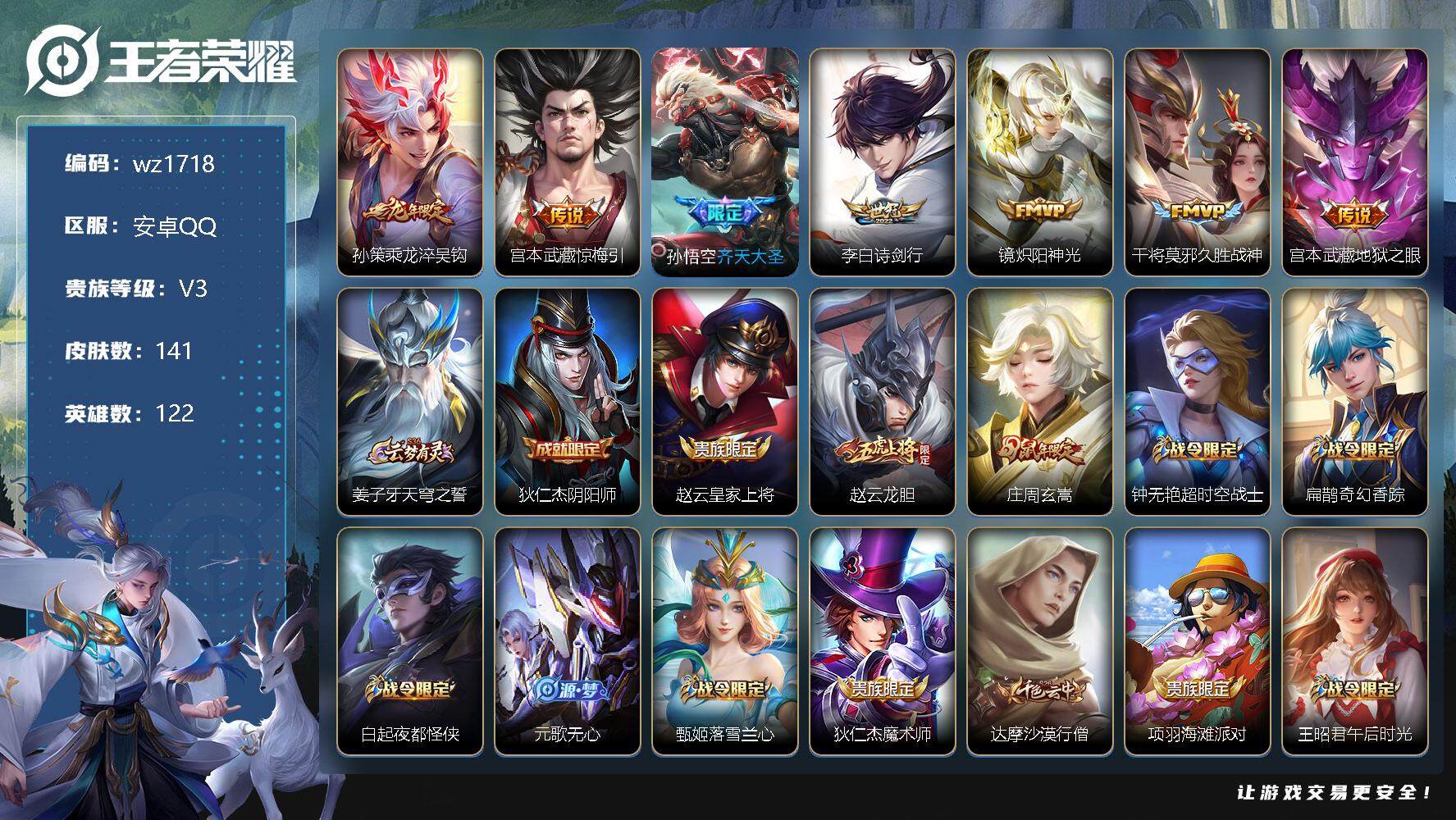 【游戏多多】 【可二次实名】【wz1718】【商品标题】:安卓Q-V3-永恒钻石V段位-122英雄-141皮肤-0典藏-0珍品无双-0无双-0珍品传说-7传说-39史诗 【传说皮肤】:孙策乘龙淬吴钩,宫本武藏惊梅引,孙悟空齐天大圣,李白诗剑行,镜炽阳神光,干将莫邪久胜战神,宫本武藏地狱之眼 【限定皮肤】:姜子牙天穹之誓,狄仁杰阴阳师,赵云皇家上将,赵云龙胆,庄周玄嵩,钟无艳超时空战士,扁鹊奇幻香踪,白起夜都怪侠,元歌无心,甄姬落雪兰心,狄仁杰魔术师,达摩沙漠行僧,项羽海滩派对,王昭君午后时光,兰陵王金庭之子,孙悟空齐天大圣,李元芳云中旅人,钟馗驱傩正仪,杨戬潮玩骑兵,干将莫邪胡桃夹子,鬼谷子五谷丰年,苏烈千军破阵,梦奇顽趣,沈梦溪大漠名商,明世隐吟游魔法,裴擒虎擒涛扼浪,狂铁电玩高手,云中君纤云弄巧,嫦娥拒霜思,嫦娥暖冬兔眠,西施玲珑珍味,鲁班大师探海日志,桑启海盐诗旅,暃星界游侠,戈娅驭风魔法,阿古朵江河有灵,张良古海寻踪,鬼谷子天穹祈灯,孙策乘龙淬吴钩,百里玄策超元猎域,刘邦剑破天穹,周瑜熔金海岸 【年限皮肤】:庄周玄嵩,赵云龙胆,孙策乘龙淬吴钩 【赛季限定】:达摩沙漠行僧,兰陵王金庭之子,张良古海寻踪,李元芳云中旅人,钟馗驱傩正仪,苏烈千军破阵,梦奇顽趣,沈梦溪大漠名商,裴擒虎擒涛扼浪,鲁班大师探海日志,桑启海盐诗旅,鬼谷子天穹祈灯,刘邦剑破天穹,姜子牙天穹之誓 【战令限定】:钟无艳超时空战士,扁鹊奇幻香踪,白起夜都怪侠,甄姬落雪兰心,王昭君午后时光,杨戬潮玩骑兵,明世隐吟游魔法,狂铁电玩高手,嫦娥暖冬兔眠,西施玲珑珍味,暃星界游侠,戈娅驭风魔法 【史诗皮肤】:阿轲暗夜猫娘,赵云皇家上将,赵云未来纪元,甄姬冰雪圆舞曲,狄仁杰魔术师,廉颇地狱岩魂,宫本武藏鬼剑武藏,孙尚香水果甜心,嬴政摇滚巨星,妲己魅力维加斯,墨子金属风暴,吕布末日机甲,花木兰水晶猎龙者,夏侯惇乘风破浪,百里守约特工魅影,铠曙光守护者,程咬金功夫厨神,白起星夜王子,孙策猫狗日记,狄仁杰鹰眼统帅,娜可露露晚萤,庄周玄嵩,橘右京修罗,赵云龙胆,云中君纤云弄巧,嫦娥拒霜思,夏洛特永昼,明世隐吟游魔法,狂铁电玩高手,钟无艳超时空战士,鬼谷子五谷丰年,元歌无心,梦奇顽趣,暃星界游侠,扁鹊奇幻香踪,刘禅电玩爆裂旋风,戈娅驭风魔法,阿古朵江河有灵,百里玄策超元猎域 【其他皮肤】:项羽海滩派对,韩信教廷特使,韩信街头霸王,露娜哥特玫瑰,达摩大发明家,白起白色死神,牛魔西部大镖客,扁鹊化身博士,扁鹊救世之瞳,宫本武藏未来纪元,妲己少女阿狸,典韦黄金武士,亚瑟死亡骑士,花木兰兔女郎,宫本武藏万象初新,后羿阿尔法小队,狄仁杰阴阳师,刘备纽约教父,墨子进击墨子号,钟无艳海滩丽影,宫本武藏霸王丸,老夫子功夫老勺,孙尚香沉稳之力,李白敏锐之力,鬼谷子幻乐之宴,苏烈坚韧之力,小乔丁香结,吕布野性能量,孙膑归虚梦演,沈梦溪鲨炮海盗猫,姜子牙炽热元素使,哪吒次元突破,盾山圆桌骑士,狂铁特工战影,刘禅秘密基地,钟馗驱傩正仪,鲁班大师乓乓大师,苏烈千军破阵,干将莫邪胡桃夹子,达摩沙漠行僧,程咬金无双福将,白起夜都怪侠,兰陵王金庭之子,刘禅唤灵魔甲,王昭君午后时光,沈梦溪大漠名商,蒙犽胡桃狂想曲,蒙恬蔚蓝守将,甄姬落雪兰心,李元芳云中旅人,戈娅危途狂花,刘备潮玩造梦师,桑启海盐诗旅,嫦娥暖冬兔眠,猪八戒潮玩探月行,牛魔牛运亨通,白起乐园追猎者,裴擒虎擒涛扼浪,杨戬潮玩骑兵,太乙真人劲辣红锅,鲁班大师探海日志,西施玲珑珍味,李元芳妄想特派,哪吒热血海滩,张良古海寻踪,钟无艳聚星闪耀,海月王牌新星,亚连破局者,后羿完美运算,鬼谷子天穹祈灯,嫦娥漠中幻影,廉颇功夫炙烤,钟无艳春野之旅,刘邦剑破天穹,姜子牙天穹之誓,周瑜熔金海岸,盘古敬我三分,鲁班七号福禄兄弟,项羽帝国元帅,王昭君精灵公主,曹操超能战警,孙膑未来旅行,后羿精灵王,蔡文姬蔷薇王座,马可波罗激情绿茵,黄忠芝加哥教父,鬼谷子阿摩司公爵,铠龙域领主,百里守约绝影神枪,裴擒虎街头旋风,李信灼热之刃,云中君荷鲁斯之眼,镜冰刃幻境,司空震启蛰,桑启画中游 【内测皮肤】:狂铁特工战影,干将莫邪胡桃夹子 【营地ID】:1823791185