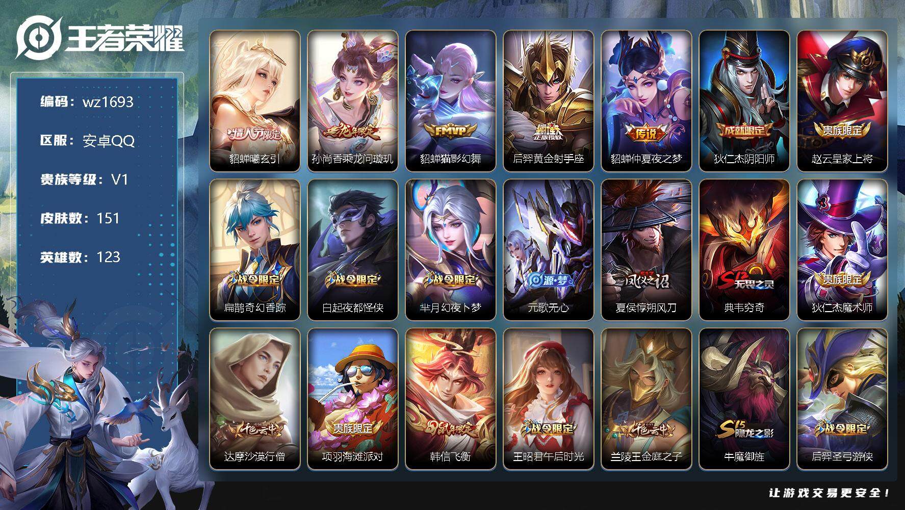 【游戏多多】 【可二次实名】【wz1693】【商品标题】:安卓Q-V1-荣耀黄金III段位-123英雄-151皮肤-0典藏-0珍品无双-0无双-0珍品传说-5传说-33史诗 【传说皮肤】:貂蝉曦玄引,孙尚香乘龙问璇玑,貂蝉猫影幻舞,后羿黄金射手座,貂蝉仲夏夜之梦 【限定皮肤】:狄仁杰阴阳师,赵云皇家上将,扁鹊奇幻香踪,白起夜都怪侠,芈月幻夜卜梦,元歌无心,夏侯惇朔风刀,典韦穷奇,狄仁杰魔术师,达摩沙漠行僧,项羽海滩派对,韩信飞衡,王昭君午后时光,兰陵王金庭之子,牛魔御旌,后羿圣弓游侠,李元芳云中旅人,钟馗驱傩正仪,杨戬潮玩骑兵,干将莫邪真爱魔法,鬼谷子原初探秘者,鬼谷子五谷丰年,黄忠火炮绅士,苏烈千军破阵,弈星混沌棋,沈梦溪大漠名商,明世隐疑决卦,明世隐吟游魔法,裴擒虎擒涛扼浪,狂铁御狮,狂铁电玩高手,米莱狄御霄,瑶山海碧波行,盾山御銮,上官婉儿梁祝,嫦娥拒霜思,鲁班大师探海日志,桑启海盐诗旅,艾琳女武神,阿古朵江河有灵,张良古海寻踪,高渐离燃音魔法,妲己灵卜魔法,鬼谷子天穹祈灯,大乔乘龙忆丹青,孙尚香乘龙问璇玑,貂蝉曦玄引,刘邦剑破天穹,周瑜熔金海岸 【年限皮肤】:韩信飞衡,瑶山海碧波行,大乔乘龙忆丹青,孙尚香乘龙问璇玑 【赛季限定】:夏侯惇朔风刀,典韦穷奇,达摩沙漠行僧,兰陵王金庭之子,张良古海寻踪,牛魔御旌,李元芳云中旅人,钟馗驱傩正仪,鬼谷子原初探秘者,苏烈千军破阵,弈星混沌棋,沈梦溪大漠名商,明世隐疑决卦,裴擒虎擒涛扼浪,狂铁御狮,米莱狄御霄,盾山御銮,鲁班大师探海日志,桑启海盐诗旅,鬼谷子天穹祈灯,刘邦剑破天穹 【战令限定】:扁鹊奇幻香踪,白起夜都怪侠,芈月幻夜卜梦,王昭君午后时光,后羿圣弓游侠,杨戬潮玩骑兵,干将莫邪真爱魔法,黄忠火炮绅士,明世隐吟游魔法,狂铁电玩高手,高渐离燃音魔法,妲己灵卜魔法 【史诗皮肤】:赵云皇家上将,貂蝉圣诞恋歌,甄姬冰雪圆舞曲,狄仁杰魔术师,宫本武藏鬼剑武藏,孙尚香水果甜心,嬴政摇滚巨星,刘禅绅士熊喵,花木兰水晶猎龙者,刘邦德古拉伯爵,小乔缤纷独角兽,亚瑟心灵战警,雅典娜冰冠公主,安琪拉心灵骇客,白起星夜王子,阿轲节奏热浪,狄仁杰鹰眼统帅,上官婉儿梁祝,韩信飞衡,干将莫邪真爱魔法,沈梦溪月团寄思,嫦娥拒霜思,黄忠火炮绅士,明世隐吟游魔法,貂蝉唤灵魅影,狂铁电玩高手,鬼谷子五谷丰年,元歌无心,瑶山海碧波行,扁鹊奇幻香踪,阿古朵江河有灵,妲己灵卜魔法,高渐离燃音魔法,大乔乘龙忆丹青 【其他皮肤】:项羽海滩派对,韩信教廷特使,艾琳女武神,白起白色死神,扁鹊化身博士,安琪拉玩偶对对碰,妲己少女阿狸,达摩拳王,花木兰兔女郎,甄姬花好人间,刘备万事如意,狄仁杰阴阳师,刘备纽约教父,刘备汉昭烈帝,李元芳黑猫爱糖果,关羽龙腾万里,钟无艳海滩丽影,老夫子功夫老勺,孙尚香沉稳之力,典韦穷奇,李白敏锐之力,鬼谷子幻乐之宴,狂铁御狮,大乔守护之力,米莱狄御霄,明世隐虹云星官,牛魔御旌,盾山御銮,沈梦溪鲨炮海盗猫,姜子牙炽热元素使,夏侯惇朔风刀,弈星混沌棋,明世隐疑决卦,鬼谷子原初探秘者,刘禅秘密基地,钟馗驱傩正仪,鲁班大师乓乓大师,苏烈千军破阵,后羿圣弓游侠,马可波罗潮玩牛仔,达摩沙漠行僧,芈月幻夜卜梦,白起夜都怪侠,兰陵王金庭之子,刘禅唤灵魔甲,王昭君午后时光,沈梦溪大漠名商,蒙犽胡桃狂想曲,蒙恬蔚蓝守将,李元芳云中旅人,桑启海盐诗旅,海月幻泉雾影,猪八戒潮玩探月行,裴擒虎擒涛扼浪,杨戬潮玩骑兵,太乙真人劲辣红锅,莱西奥西部游侠,鲁班大师探海日志,李元芳妄想特派,张良古海寻踪,钟无艳聚星闪耀,后羿完美运算,鬼谷子天穹祈灯,妲己灵卜魔法,朵莉亚金色潮汐,廉颇功夫炙烤,钟无艳春野之旅,刘邦剑破天穹,貂蝉长夏之忆,周瑜熔金海岸,苍苍林狼骑,典韦铁骨偃魂,苏烈春野闲踪,张良灵野札记,鲁班七号福禄兄弟,高渐离金属狂潮,露娜绯红之刃,貂蝉异域舞娘,曹操超能战警,小乔万圣前夜,孙悟空西部大镖客,后羿精灵王,李元芳特种部队,虞姬加勒比小姐,蔡文姬蔷薇王座,马可波罗激情绿茵,苍维京掠夺者,诸葛亮星航指挥官,黄忠芝加哥教父,大乔伊势巫女,干将莫邪第七人偶,鬼谷子阿摩司公爵,铠龙域领主,苏烈爱与和平,明世隐占星师,公孙离花间舞,杨玉环霓裳曲,裴擒虎街头旋风,米莱狄精准探案法,元歌午夜歌剧院,司马懿魇语军师,伽罗花见巫女,李信灼热之刃,上官婉儿修竹墨客,嫦娥露花倒影,猪八戒年年有余,瑶森,云中君荷鲁斯之眼,曜归虚梦演,西施归虚梦演,镜冰刃幻境,阿古朵熊喵少女,澜孤猎 【内测皮肤】:艾琳女武神 【营地ID】:348205472