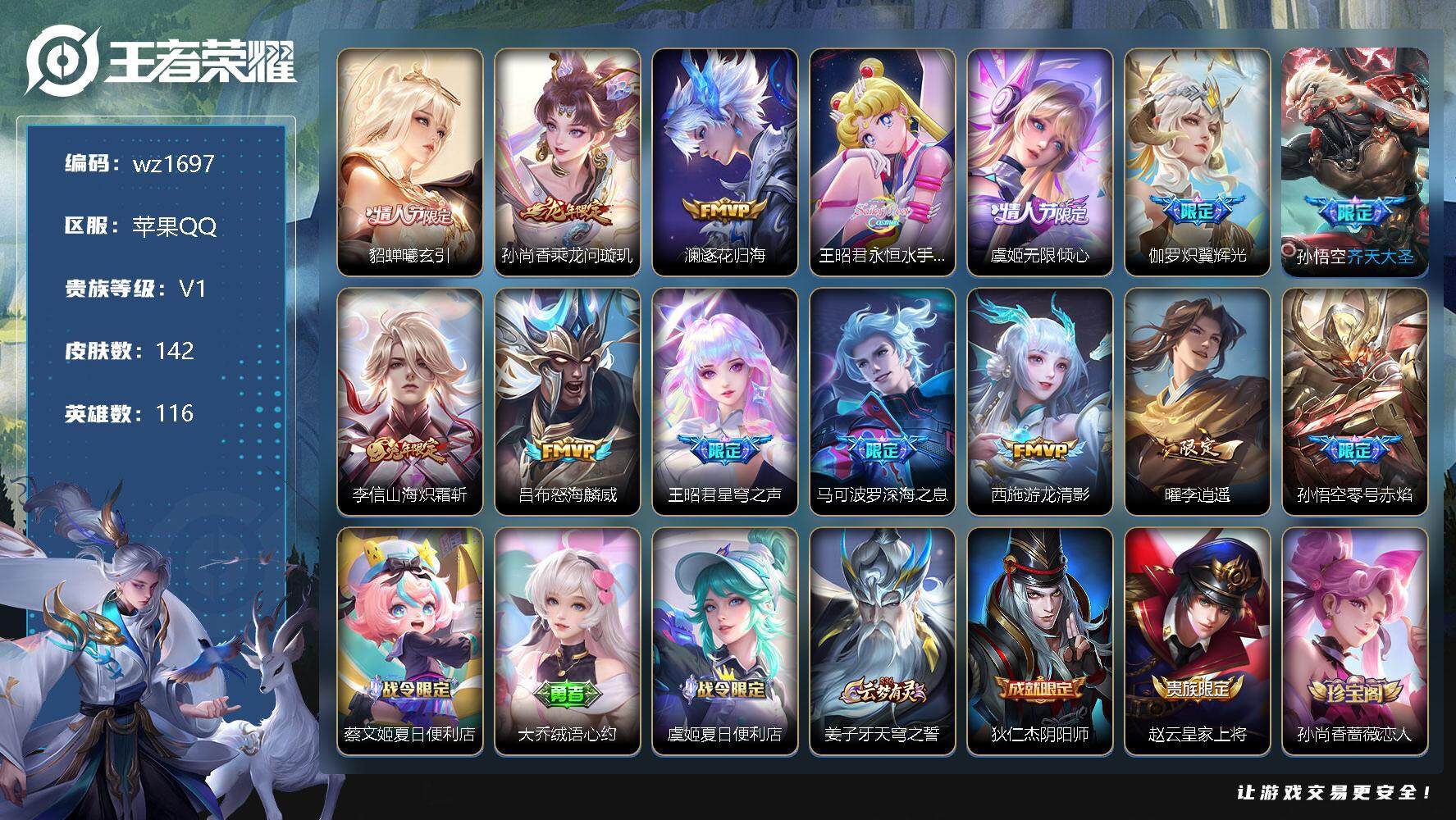 【游戏多多】 【可二次实名】【wz1697】【商品标题】:苹果Q-V1-永恒钻石V段位-116英雄-142皮肤-0典藏-0珍品无双-0无双-0珍品传说-14传说-43史诗 【传说皮肤】:貂蝉曦玄引,孙尚香乘龙问璇玑,澜逐花归海,王昭君永恒水手月亮,虞姬无限倾心,伽罗炽翼辉光,孙悟空齐天大圣,李信山海炽霜斩,吕布怒海麟威,王昭君星穹之声,马可波罗深海之息,西施游龙清影,曜李逍遥 ,孙悟空零号赤焰 【限定皮肤】:蔡文姬夏日便利店,大乔绒语心约,虞姬夏日便利店,姜子牙天穹之誓,狄仁杰阴阳师,赵云皇家上将,孙尚香蔷薇恋人,钟无艳超时空战士,元歌无心,甄姬落雪兰心,马可波罗深海之息,马可波罗山海玄木吟,狄仁杰魔术师,达摩沙漠行僧,项羽海滩派对,王昭君午后时光,王昭君星穹之声,兰陵王金庭之子,孙悟空零号赤焰,孙悟空齐天大圣,李元芳匿光侦查者,李元芳云中旅人,虞姬无限倾心,钟馗驱傩正仪,鬼谷子五谷丰年,苏烈千军破阵,沈梦溪大漠名商,裴擒虎擒涛扼浪,狂铁电玩高手,云中君纤云弄巧,李信山海炽霜斩,伽罗炽翼辉光,上官婉儿梁祝,上官婉儿神器万象笔,嫦娥拒霜思,曜李逍遥 ,西施至美乘鲤谣,鲁班大师探海日志,桑启海盐诗旅,阿古朵江河有灵,张良古海寻踪,王昭君永恒水手月亮,蒙犽百解令,鬼谷子天穹祈灯,伽罗琥珀纪元,孙尚香乘龙问璇玑,貂蝉曦玄引,刘邦剑破天穹,程咬金群星魔术团,刘备异域游侠,周瑜熔金海岸 【年限皮肤】:马可波罗山海玄木吟,李信山海炽霜斩,伽罗炽翼辉光,孙尚香乘龙问璇玑 【赛季限定】:达摩沙漠行僧,兰陵王金庭之子,张良古海寻踪,李元芳云中旅人,钟馗驱傩正仪,苏烈千军破阵,沈梦溪大漠名商,裴擒虎擒涛扼浪,鲁班大师探海日志,桑启海盐诗旅,鬼谷子天穹祈灯,刘邦剑破天穹,姜子牙天穹之誓 【战令限定】:蔡文姬夏日便利店,虞姬夏日便利店,钟无艳超时空战士,甄姬落雪兰心,王昭君午后时光,狂铁电玩高手 【史诗皮肤】:鲁班七号电玩小子,赵云皇家上将,赵云未来纪元,狄仁杰魔术师,廉颇地狱岩魂,宫本武藏鬼剑武藏,孙尚香蔷薇恋人,孙尚香水果甜心,妲己魅力维加斯,妲己女仆咖啡,墨子龙骑士,墨子金属风暴,曹操幽灵船长,花木兰水晶猎龙者,刘邦德古拉伯爵,小乔缤纷独角兽,兰陵王暗隐猎兽者,雅典娜冰冠公主,安琪拉心灵骇客,百里守约特工魅影,李元芳逐浪之夏,白起星夜王子,孙策猫狗日记,狄仁杰鹰眼统帅,上官婉儿梁祝,不知火舞魅语,橘右京修罗,云中君纤云弄巧,嫦娥拒霜思,狂铁电玩高手,钟无艳超时空战士,鬼谷子五谷丰年,上官婉儿神器万象笔,元歌无心,马可波罗山海玄木吟,刘禅电玩爆裂旋风,百里守约真我赫兹,李元芳匿光侦查者,阿古朵江河有灵,西施至美乘鲤谣,蒙犽百解令,伽罗琥珀纪元,蔡文姬夏日便利店 【其他皮肤】:项羽海滩派对,韩信街头霸王,阿轲爱心护理,赵云忍炎影,白起白色死神,扁鹊化身博士,安琪拉玩偶对对碰,亚瑟死亡骑士,花木兰兔女郎,张飞五福同心,刘备万事如意,宫本武藏万象初新,狄仁杰阴阳师,墨子进击墨子号,钟无艳海滩丽影,孙尚香沉稳之力,苏烈坚韧之力,大乔守护之力,小乔丁香结,哪吒次元突破,盾山圆桌骑士,狂铁特工战影,张良缤纷绘卷,钟馗驱傩正仪,鲁班大师乓乓大师,苏烈千军破阵,达摩沙漠行僧,刘邦虎啸剑宗,兰陵王金庭之子,刘禅唤灵魔甲,王昭君午后时光,沈梦溪大漠名商,蒙犽胡桃狂想曲,蒙恬蔚蓝守将,甄姬落雪兰心,李元芳云中旅人,戈娅危途狂花,刘备潮玩造梦师,桑启海盐诗旅,猪八戒潮玩探月行,牛魔牛运亨通,白起乐园追猎者,裴擒虎擒涛扼浪,太乙真人劲辣红锅,鲁班大师探海日志,李元芳妄想特派,张良古海寻踪,钟无艳聚星闪耀,海月王牌新星,亚连破局者,兰陵王幻夜行动,曹操决胜大满贯,程咬金暖冬絮语,鬼谷子天穹祈灯,朵莉亚金色潮汐,亚瑟鸿运当头,刘邦剑破天穹,盘古经纬探寻者,程咬金群星魔术团,大司命暗都幽影,刘备异域游侠,姜子牙天穹之誓,周瑜熔金海岸,虞姬夏日便利店,大乔绒语心约,东皇太一噬灭天穹,吕布逐霄战戟,东皇太一金福满堂,鲁班七号福禄兄弟,高渐离金属狂潮,狄仁杰锦衣卫,孙悟空西部大镖客,刘禅英喵野望,雅典娜战争女神,干将莫邪第七人偶,铠龙域领主,梦奇美梦成真,司马懿魇语军师,瑶森,曜归虚梦演,西施归虚梦演,澜孤猎,司空震启蛰,金蝉前尘,桑启画中游 【内测皮肤】:孙尚香蔷薇恋人,狂铁特工战影 【营地ID】:1713991402