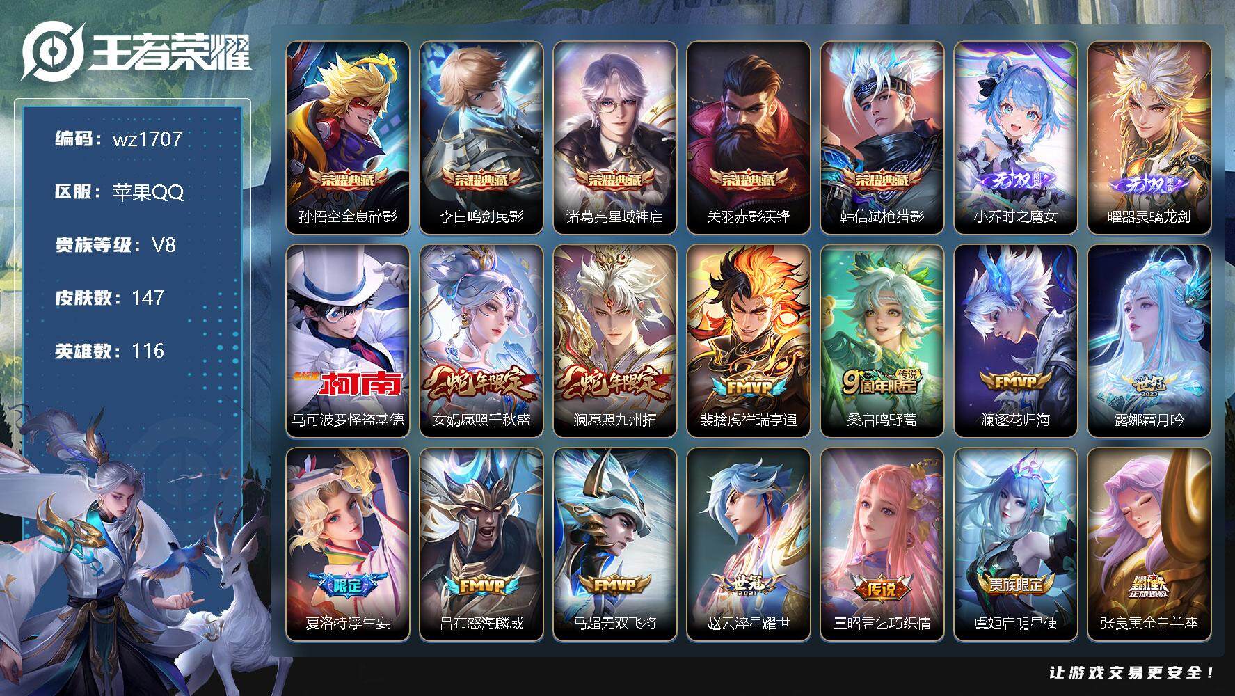 【游戏多多】 【可二次实名】【wz1707】【商品标题】:苹果Q-V8-至尊星耀II段位-116英雄-147皮肤-5典藏-0珍品无双-2无双-1珍品传说-13传说-38史诗 【英雄全皮】:影全皮 【荣耀典藏】:孙悟空全息碎影,李白鸣剑曳影,诸葛亮星域神启,关羽赤影疾锋,韩信弑枪猎影 【无双皮肤】:小乔时之魔女,曜器灵螭龙剑 【珍品传说】:马可波罗怪盗基德 【传说皮肤】:女娲愿照千秋盛,澜愿照九州拓,裴擒虎祥瑞亨通,桑启鸣野蒿,澜逐花归海,露娜霜月吟,夏洛特浮生妄,吕布怒海麟威,马超无双飞将,赵云淬星耀世,王昭君乞巧织情,虞姬启明星使,张良黄金白羊座 【限定皮肤】:姜子牙天穹之誓,狄仁杰阴阳师,赵云皇家上将,赵云引擎之心,典韦岱宗,狄仁杰魔术师,项羽海滩派对,孙悟空至尊宝,虞姬启明星使,夏洛特浮生妄,小乔时之魔女,鲁班七号蔬乡物语,刘邦剑破天穹,镜青焰无极,项羽苍威无极 【年限皮肤】:典韦岱宗 【赛季限定】:刘邦剑破天穹,姜子牙天穹之誓 【战令限定】:鲁班七号蔬乡物语,镜青焰无极,项羽苍威无极 【史诗皮肤】:赵云皇家上将,赵云未来纪元,貂蝉圣诞恋歌,王昭君偶像歌手,狄仁杰魔术师,宫本武藏鬼剑武藏,孙尚香水果甜心,嬴政摇滚巨星,妲己魅力维加斯,刘禅绅士熊喵,李白千年之狐,吕布末日机甲,孙悟空至尊宝,赵云引擎之心,花木兰水晶猎龙者,夏侯惇乘风破浪,兰陵王暗隐猎兽者,诸葛亮黄金分割率,雅典娜冰冠公主,百里守约特工魅影,铠曙光守护者,李元芳逐浪之夏,程咬金功夫厨神,白起星夜王子,阿轲节奏热浪,孙策猫狗日记,狄仁杰鹰眼统帅,典韦岱宗,瑶遇见神鹿,杨戬天秀启明,鲁班七号蔬乡物语,镜青焰无极,亚连破空之剑,百里守约百相守梦,孙膑茶境仙,阿轲化蝶舞,刘禅鸭鸭历险记,狂铁龙之律动 【其他皮肤】:项羽海滩派对,韩信教廷特使,韩信街头霸王,露娜哥特玫瑰,赵云忍炎影,牛魔西部大镖客,扁鹊救世之瞳,宫本武藏未来纪元,典韦黄金武士,亚瑟死亡骑士,达摩拳王,张飞五福同心,甄姬花好人间,刘备万事如意,后羿阿尔法小队,狄仁杰阴阳师,刘备汉昭烈帝,关羽龙腾万里,钟无艳海滩丽影,狂铁命运角斗场,小乔丁香结,沈梦溪鲨炮海盗猫,蒙恬蔚蓝守将,海月幻泉雾影,亚连破局者,刘邦剑破天穹,项羽苍威无极,姜子牙天穹之誓,孙悟空神迹守卫,东皇太一噬灭天穹,老夫子百相守梦,干将莫邪雾都夜雨,苍苍林狼骑,太乙真人谧流熔炉,典韦铁骨偃魂,马超访茗客,影魅影绮裳,西施雪境奇遇,姜子牙星梦巡礼,达摩爆裂喵拳,少司缘灵卦秘语,戈娅玫蓝誓约,刘备浪漫序章,钟馗虚灵犬护,沈梦溪鸭鸭历险记,苏烈春野闲踪,张良灵野札记,阿古朵布丁狗之约,露娜命运加冕,白起死霸装,甄姬逆浪荇歌,莱西奥踏浪烽翎,亚瑟荣光之誓,鲁班七号福禄兄弟,鲁班七号木偶奇遇记,高渐离金属狂潮,露娜绯红之刃,花木兰剑舞者,老夫子潮流仙人,孙膑未来旅行,后羿精灵王,兰陵王隐刃,李白范海辛,钟馗地府判官,虞姬加勒比小姐,关羽天启骑士,马可波罗激情绿茵,苍维京掠夺者,哪吒三太子,黄忠芝加哥教父,干将莫邪第七人偶,鬼谷子阿摩司公爵,铠龙域领主,百里守约绝影神枪,百里玄策威尼斯狂欢,公孙离花间舞,裴擒虎街头旋风,弈星踏雪寻梅,元歌午夜歌剧院,司马懿魇语军师,伽罗花见巫女,李信灼热之刃,嫦娥露花倒影,澜孤猎,司空震启蛰,云缨赤焰之缨,金蝉前尘,暃碧珀绯影 【营地ID】:1642314554
