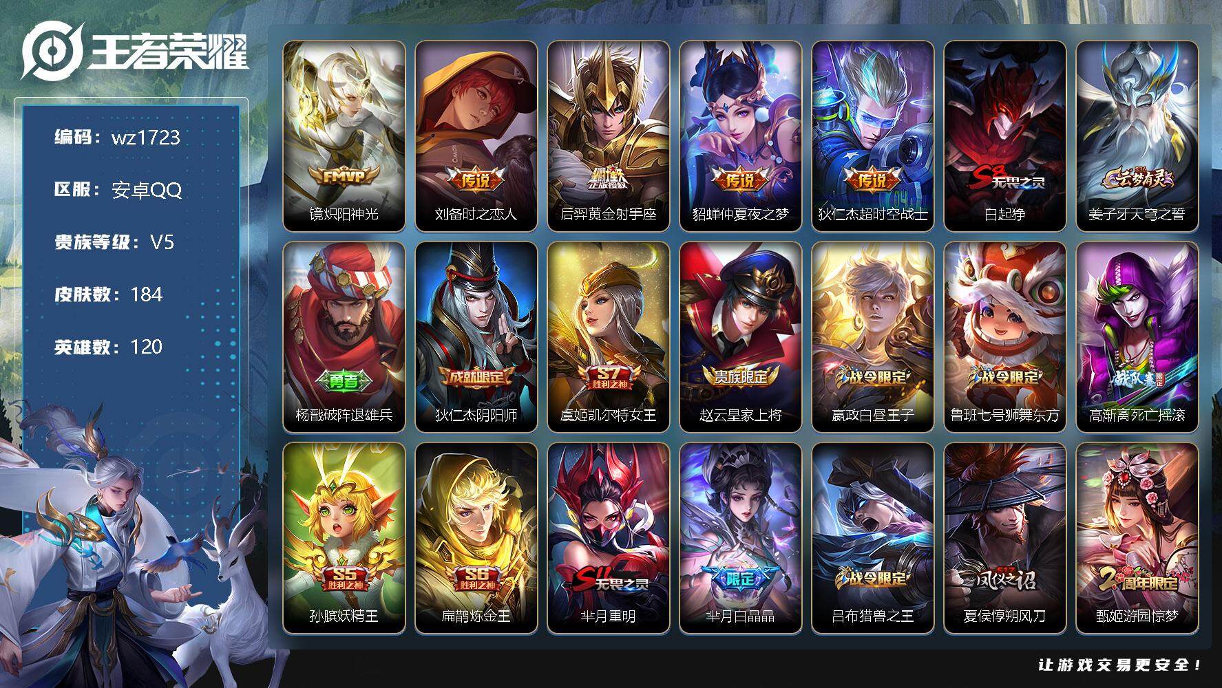 【游戏多多】 【可二次实名】【wz1723】【商品标题】:安卓Q-V5-永恒钻石III段位-120英雄-184皮肤-0典藏-0珍品无双-0无双-0珍品传说-5传说-35史诗 【英雄全皮】:蒙恬全皮 【传说皮肤】:镜炽阳神光,刘备时之恋人,后羿黄金射手座,貂蝉仲夏夜之梦,狄仁杰超时空战士 【限定皮肤】:白起狰,姜子牙天穹之誓,杨戬破阵退雄兵,狄仁杰阴阳师,虞姬凯尔特女王,赵云皇家上将,嬴政白昼王子,鲁班七号狮舞东方,高渐离死亡摇滚,孙膑妖精王,扁鹊炼金王,芈月重明,芈月白晶晶,吕布猎兽之王,夏侯惇朔风刀,甄姬游园惊梦,曹操烛龙,典韦穷奇,马可波罗逐梦之星,狄仁杰魔术师,狄仁杰万华元夜,达摩沙漠行僧,项羽海滩派对,关羽冰锋战神,程咬金演武夺筹,牛魔御旌,李元芳云中旅人,钟馗神迹守卫,钟馗驱傩正仪,雅典娜黎明之约,太乙真人饕餮,太乙真人华丽摇滚,鬼谷子原初探秘者,鬼谷子五谷丰年,百里玄策原初追逐者,弈星混沌棋,梦奇顽趣,沈梦溪大漠名商,明世隐疑决卦,裴擒虎擒涛扼浪,狂铁御狮,米莱狄御霄,盾山御銮,鲁班大师探海日志,桑启海盐诗旅,阿古朵江河有灵,张良古海寻踪,蒙犽百解令,蒙恬荣光圣徽,高渐离燃音魔法,妲己灵卜魔法,鬼谷子天穹祈灯,姬小满妄想食味,沈梦溪龙舞盛年,刘邦剑破天穹,程咬金群星魔术团,周瑜熔金海岸 【赛季限定】:孙膑妖精王,扁鹊炼金王,白起狰,芈月重明,夏侯惇朔风刀,曹操烛龙,典韦穷奇,狄仁杰万华元夜,达摩沙漠行僧,程咬金演武夺筹,张良古海寻踪,牛魔御旌,李元芳云中旅人,虞姬凯尔特女王,钟馗驱傩正仪,雅典娜黎明之约,太乙真人饕餮,鬼谷子原初探秘者,百里玄策原初追逐者,弈星混沌棋,梦奇顽趣,沈梦溪大漠名商,明世隐疑决卦,裴擒虎擒涛扼浪,狂铁御狮,米莱狄御霄,盾山御銮,鲁班大师探海日志,桑启海盐诗旅,鬼谷子天穹祈灯,蒙恬荣光圣徽,刘邦剑破天穹,姜子牙天穹之誓 【战令限定】:嬴政白昼王子,鲁班七号狮舞东方,吕布猎兽之王,钟馗神迹守卫,高渐离燃音魔法,妲己灵卜魔法 【史诗皮肤】:露娜紫霞仙子,赵云皇家上将,赵云未来纪元,甄姬冰雪圆舞曲,狄仁杰魔术师,宫本武藏鬼剑武藏,孙尚香水果甜心,妲己魅力维加斯,妲己女仆咖啡,墨子金属风暴,吕布末日机甲,韩信白龙吟,关羽冰锋战神,花木兰水晶猎龙者,甄姬游园惊梦,马可波罗逐梦之星,铠曙光守护者,刘禅天才门将,李元芳逐浪之夏,程咬金功夫厨神,嬴政白昼王子,鲁班七号狮舞东方,狄仁杰鹰眼统帅,公孙离无限星赏官,百里玄策原初追逐者,芈月白晶晶,雅典娜黎明之约,鬼谷子五谷丰年,梦奇顽趣,莱西奥末日机甲,阿古朵江河有灵,蒙犽百解令,妲己灵卜魔法,高渐离燃音魔法,蒙恬荣光圣徽,姬小满妄想食味 【其他皮肤】:项羽海滩派对,韩信教廷特使,韩信街头霸王,露娜哥特玫瑰,阿轲致命风华,阿轲爱心护理,赵云忍炎影,芈月红桃皇后,程咬金爱与正义,白起白色死神,扁鹊化身博士,姜子牙时尚教父,妲己少女阿狸,典韦黄金武士,亚瑟死亡骑士,达摩拳王,花木兰兔女郎,张飞五福同心,甄姬花好人间,刘备万事如意,宫本武藏万象初新,后羿阿尔法小队,狄仁杰阴阳师,刘备纽约教父,高渐离死亡摇滚,孙膑妖精王,刘备汉昭烈帝,扁鹊炼金王,关羽龙腾万里,虞姬凯尔特女王,墨子进击墨子号,白起狰,钟无艳海滩丽影,太乙真人饕餮,宫本武藏霸王丸,曹操烛龙,王昭君幻想奇妙夜,芈月重明,老夫子功夫老勺,孙尚香沉稳之力,典韦穷奇,诸葛亮掌控之力,鬼谷子幻乐之宴,狂铁御狮,安琪拉如懿,太乙真人华丽摇滚,大乔守护之力,米莱狄御霄,吕布猎兽之王,明世隐虹云星官,牛魔御旌,钟馗神迹守卫,盾山御銮,孙膑归虚梦演,沈梦溪鲨炮海盗猫,姜子牙炽热元素使,夏侯惇朔风刀,弈星混沌棋,哪吒次元突破,明世隐疑决卦,盾山圆桌骑士,狂铁特工战影,鬼谷子原初探秘者,狄仁杰万华元夜,刘禅秘密基地,程咬金演武夺筹,张良缤纷绘卷,钟馗驱傩正仪,鲁班大师乓乓大师,达摩沙漠行僧,程咬金无双福将,沈梦溪大漠名商,蒙恬蔚蓝守将,李元芳云中旅人,桑启海盐诗旅,猪八戒潮玩探月行,裴擒虎擒涛扼浪,太乙真人劲辣红锅,莱西奥西部游侠,鲁班大师探海日志,姬小满零食大作战,李元芳妄想特派,张良古海寻踪,钟无艳聚星闪耀,后羿完美运算,鬼谷子天穹祈灯,妲己灵卜魔法,廉颇功夫炙烤,亚瑟鸿运当头,沈梦溪龙舞盛年,刘邦剑破天穹,程咬金群星魔术团,杨戬破阵退雄兵,姜子牙天穹之誓,周瑜熔金海岸,盘古敬我三分,东皇太一噬灭天穹,鲁班七号福禄兄弟,高渐离金属狂潮,项羽帝国元帅,露娜绯红之刃,貂蝉异域舞娘,花木兰剑舞者,狄仁杰锦衣卫,曹操死神来了,小乔万圣前夜,孙悟空西部大镖客,周瑜海军大将,后羿精灵王,刘禅英喵野望,兰陵王隐刃,李白范海辛,李元芳特种部队,刘邦圣殿之光,关羽天启骑士,蔡文姬蔷薇王座,夏侯惇战争骑士,马可波罗激情绿茵,苍维京掠夺者,黄忠芝加哥教父,干将莫邪第七