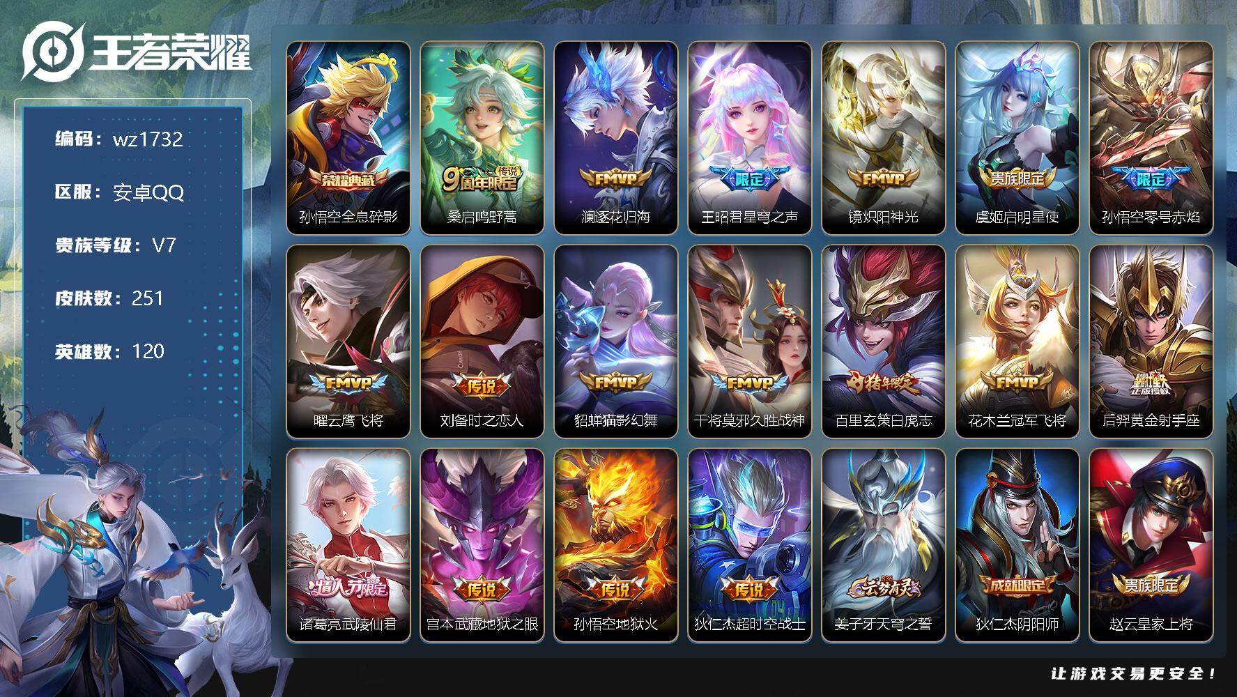 【游戏多多】 【可二次实名】【wz1732】【商品标题】:安卓Q-V7-永恒钻石V段位-120英雄-251皮肤-1典藏-0珍品无双-0无双-0珍品传说-17传说-72史诗 【荣耀典藏】:孙悟空全息碎影 【传说皮肤】:桑启鸣野蒿,澜逐花归海,王昭君星穹之声,镜炽阳神光,虞姬启明星使,孙悟空零号赤焰,曜云鹰飞将,刘备时之恋人,貂蝉猫影幻舞,干将莫邪久胜战神,百里玄策白虎志,花木兰冠军飞将,后羿黄金射手座,诸葛亮武陵仙君,宫本武藏地狱之眼,孙悟空地狱火,狄仁杰超时空战士 【限定皮肤】:姜子牙天穹之誓,狄仁杰阴阳师,赵云皇家上将,嬴政优雅恋人,嬴政白昼王子,鲁班七号狮舞东方,高渐离死亡摇滚,阿轲迷踪丽影,孙膑天狼运算者,芈月重明,吕布猎兽之王,周瑜赤莲之焰,元歌云间偶戏,元歌无心,夏侯惇朔风刀,曹操烛龙,曹操天狼征服者,典韦穷奇,典韦蓝屏警告,马可波罗暗影游猎,狄仁杰魔术师,狄仁杰万华元夜,达摩星际陆战队,达摩沙漠行僧,项羽海滩派对,老夫子醍醐杖,关羽冰锋战神,程咬金演武夺筹,露娜一生所爱,刘邦夺宝奇兵,王昭君凤凰于飞,王昭君星穹之声,兰陵王驯魔猎人,兰陵王金庭之子,亚瑟潮玩骑士王,孙悟空美猴王,孙悟空至尊宝,孙悟空大圣娶亲,孙悟空零号赤焰,牛魔御旌,李元芳银河之约,李元芳云中旅人,虞姬启明星使,钟馗神迹守卫,钟馗驱傩正仪,杨玉环遇见飞天,女娲朔望之晖,雅典娜单词大作战,雅典娜黎明之约,蔡文姬繁星吟游,太乙真人饕餮,太乙真人华丽摇滚,鬼谷子原初探秘者,鬼谷子五谷丰年,诸葛亮武陵仙君,苏烈千军破阵,百里玄策白虎志,百里玄策原初追逐者,弈星混沌棋,梦奇顽趣,沈梦溪星空之诺,沈梦溪大漠名商,明世隐疑决卦,裴擒虎天狼狩猎者,裴擒虎李小龙,裴擒虎擒涛扼浪,狂铁御狮,米莱狄御霄,米莱狄胡桃异想国,云中君纤云弄巧,盾山御銮,猪八戒西部大镖客,猪八戒猪悟能,上官婉儿梁祝,上官婉儿天狼绘梦者,嫦娥拒霜思,蒙犽狂想玩偶喵,鲁班大师探海日志,桑启海盐诗旅,艾琳女武神,张良古海寻踪,蒙恬荣光圣徽,鬼谷子天穹祈灯,刘邦剑破天穹,周瑜熔金海岸 【年限皮肤】:百里玄策白虎志,孙悟空美猴王,王昭君凤凰于飞,马超神威 【赛季限定】:芈月重明,夏侯惇朔风刀,曹操烛龙,典韦穷奇,狄仁杰万华元夜,达摩沙漠行僧,老夫子醍醐杖,程咬金演武夺筹,兰陵王金庭之子,张良古海寻踪,牛魔御旌,李元芳云中旅人,钟馗驱傩正仪,雅典娜黎明之约,太乙真人饕餮,鬼谷子原初探秘者,苏烈千军破阵,百里玄策原初追逐者,弈星混沌棋,梦奇顽趣,沈梦溪大漠名商,明世隐疑决卦,裴擒虎擒涛扼浪,狂铁御狮,米莱狄御霄,盾山御銮,鲁班大师探海日志,桑启海盐诗旅,鬼谷子天穹祈灯,蒙恬荣光圣徽,刘邦剑破天穹,姜子牙天穹之誓 【战令限定】:嬴政白昼王子,鲁班七号狮舞东方,阿轲迷踪丽影,吕布猎兽之王,周瑜赤莲之焰,元歌云间偶戏,典韦蓝屏警告,马可波罗暗影游猎,达摩星际陆战队,刘邦夺宝奇兵,兰陵王驯魔猎人,亚瑟潮玩骑士王,李元芳银河之约,钟馗神迹守卫,女娲朔望之晖,雅典娜单词大作战,沈梦溪星空之诺,米莱狄胡桃异想国,猪八戒西部大镖客,蒙犽狂想玩偶喵 【史诗皮肤】:露娜紫霞仙子,赵云皇家上将,赵云未来纪元,貂蝉圣诞恋歌,甄姬冰雪圆舞曲,狄仁杰魔术师,廉颇地狱岩魂,宫本武藏鬼剑武藏,孙尚香水果甜心,嬴政优雅恋人,嬴政暗夜贵公子,妲己魅力维加斯,妲己女仆咖啡,墨子金属风暴,吕布圣诞狂欢,刘禅绅士熊喵,曹操幽灵船长,李白千年之狐,吕布末日机甲,关羽冰锋战神,王昭君凤凰于飞,孙悟空至尊宝,花木兰水晶猎龙者,刘邦德古拉伯爵,夏侯惇乘风破浪,小乔缤纷独角兽,兰陵王暗隐猎兽者,亚瑟心灵战警,安琪拉心灵骇客,百里守约特工魅影,铠曙光守护者,李元芳逐浪之夏,白起星夜王子,阿轲节奏热浪,杨玉环遇见飞天,嬴政白昼王子,孙策猫狗日记,露娜一生所爱,孙悟空大圣娶亲,典韦蓝屏警告,伽罗箭羽风息,裴擒虎天狼狩猎者,鲁班七号狮舞东方,狄仁杰鹰眼统帅,公孙离无限星赏官,兰陵王驯魔猎人,上官婉儿梁祝,曹操天狼征服者,蔡文姬繁星吟游,李元芳银河之约,娜可露露晚萤,阿轲迷踪丽影,马超神威,孙尚香时之恋人,上官婉儿天狼绘梦者,马可波罗暗影游猎,蒙犽狂想玩偶喵,百里玄策原初追逐者,裴擒虎李小龙,云中君纤云弄巧,孙膑天狼运算者,元歌云间偶戏,米莱狄胡桃异想国,猪八戒猪悟能,嫦娥拒霜思,雅典娜黎明之约,澜赏金猎手,貂蝉唤灵魅影,鬼谷子五谷丰年,元歌无心,梦奇顽趣,蒙恬荣光圣徽 【其他皮肤】:项羽海滩派对,韩信教廷特使,韩信街头霸王,阿轲致命风华,阿轲爱心护理,达摩大发明家,赵云忍炎影,艾琳女武神,白起白色死神,扁鹊化身博士,宫本武藏未来纪元,安琪拉玩偶对对碰,姜子牙时尚教父,妲己少女阿狸,典韦黄金武士,亚瑟死亡骑士,达摩拳王,孙悟空美猴王,花木兰兔女郎,张飞五福同心,甄姬花好人间,刘备万事如意,宫本