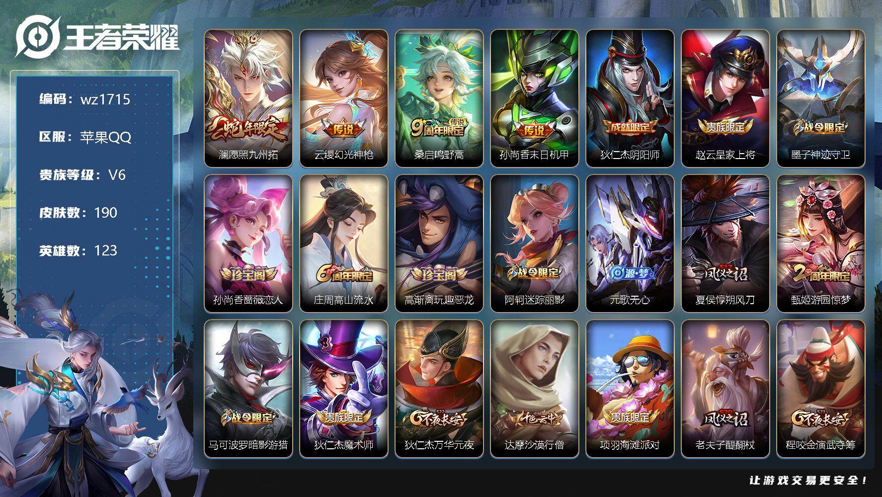 【游戏多多】 【可二次实名】【wz1715】【商品标题】:苹果Q-V6-永恒钻石II段位-123英雄-190皮肤-0典藏-0珍品无双-0无双-0珍品传说-4传说-45史诗 【英雄全皮】:影全皮 【传说皮肤】:澜愿照九州拓,云缨幻光神枪,桑启鸣野蒿,孙尚香末日机甲 【限定皮肤】:狄仁杰阴阳师,赵云皇家上将,墨子神迹守卫,孙尚香蔷薇恋人,庄周高山流水,高渐离玩趣恶龙,阿轲迷踪丽影,元歌无心,夏侯惇朔风刀,甄姬游园惊梦,马可波罗暗影游猎,狄仁杰魔术师,狄仁杰万华元夜,达摩沙漠行僧,项羽海滩派对,老夫子醍醐杖,程咬金演武夺筹,刘邦夺宝奇兵,兰陵王金庭之子,孙悟空至尊宝,李元芳云中旅人,钟馗驱傩正仪,蔡文姬繁星吟游,鬼谷子原初探秘者,鬼谷子五谷丰年,苏烈千军破阵,弈星混沌棋,沈梦溪大漠名商,明世隐疑决卦,裴擒虎李小龙,裴擒虎擒涛扼浪,云中君纤云弄巧,盾山御銮,猪八戒西部大镖客,猪八戒猪悟能,上官婉儿梁祝,嫦娥拒霜思,鲁班大师探海日志,桑启海盐诗旅,阿古朵江河有灵,张良古海寻踪,蒙犽百解令,鬼谷子天穹祈灯,沈梦溪龙舞盛年,刘邦剑破天穹,程咬金群星魔术团,刘备异域游侠,周瑜熔金海岸 【赛季限定】:夏侯惇朔风刀,狄仁杰万华元夜,达摩沙漠行僧,老夫子醍醐杖,程咬金演武夺筹,兰陵王金庭之子,张良古海寻踪,李元芳云中旅人,钟馗驱傩正仪,鬼谷子原初探秘者,苏烈千军破阵,弈星混沌棋,沈梦溪大漠名商,明世隐疑决卦,裴擒虎擒涛扼浪,盾山御銮,鲁班大师探海日志,桑启海盐诗旅,鬼谷子天穹祈灯,刘邦剑破天穹 【战令限定】:墨子神迹守卫,阿轲迷踪丽影,马可波罗暗影游猎,刘邦夺宝奇兵,猪八戒西部大镖客 【史诗皮肤】:赵云皇家上将,赵云未来纪元,貂蝉圣诞恋歌,甄姬冰雪圆舞曲,狄仁杰魔术师,宫本武藏鬼剑武藏,孙尚香蔷薇恋人,孙尚香水果甜心,嬴政暗夜贵公子,妲己魅力维加斯,墨子金属风暴,吕布圣诞狂欢,曹操幽灵船长,吕布末日机甲,孙悟空至尊宝,花木兰水晶猎龙者,夏侯惇乘风破浪,甄姬游园惊梦,安琪拉心灵骇客,百里守约特工魅影,蔡文姬舞动绿茵,刘禅天才门将,程咬金功夫厨神,白起星夜王子,阿轲节奏热浪,狄仁杰鹰眼统帅,上官婉儿梁祝,蔡文姬繁星吟游,阿轲迷踪丽影,瑶遇见神鹿,孙尚香时之恋人,马可波罗暗影游猎,裴擒虎李小龙,云中君纤云弄巧,猪八戒猪悟能,庄周高山流水,嫦娥拒霜思,夏洛特永昼,鬼谷子五谷丰年,元歌无心,阿古朵江河有灵,蒙犽百解令,周瑜雪夜绮愿,牛魔星界战将,黄忠百相守梦 【其他皮肤】:项羽海滩派对,韩信教廷特使,韩信街头霸王,阿轲爱心护理,赵云忍炎影,程咬金爱与正义,牛魔西部大镖客,扁鹊化身博士,宫本武藏未来纪元,姜子牙时尚教父,妲己少女阿狸,典韦黄金武士,亚瑟死亡骑士,花木兰兔女郎,张飞五福同心,甄姬花好人间,宫本武藏万象初新,后羿阿尔法小队,狄仁杰阴阳师,刘备纽约教父,刘备汉昭烈帝,关羽龙腾万里,钟无艳海滩丽影,王昭君幻想奇妙夜,狂铁命运角斗场,老夫子功夫老勺,孙尚香沉稳之力,鬼谷子幻乐之宴,大乔守护之力,项羽科学大爆炸,明世隐虹云星官,小乔丁香结,吕布野性能量,盾山御銮,高渐离玩趣恶龙,沈梦溪鲨炮海盗猫,姜子牙炽热元素使,夏侯惇朔风刀,弈星混沌棋,哪吒次元突破,鲁班七号黑桃队长,明世隐疑决卦,刘邦夺宝奇兵,盾山圆桌骑士,老夫子醍醐杖,猪八戒西部大镖客,狂铁特工战影,廉颇无尽征程,鬼谷子原初探秘者,狄仁杰万华元夜,刘禅秘密基地,露娜瓷语鉴心,程咬金演武夺筹,张良缤纷绘卷,钟馗驱傩正仪,墨子神迹守卫,苏烈千军破阵,妲己紫罗兰之誓,达摩沙漠行僧,程咬金无双福将,兰陵王金庭之子,沈梦溪大漠名商,蒙恬蔚蓝守将,李元芳云中旅人,刘备潮玩造梦师,桑启海盐诗旅,海月幻泉雾影,猪八戒潮玩探月行,赵怀真太极少年,裴擒虎擒涛扼浪,鲁班大师探海日志,李元芳妄想特派,张良古海寻踪,后羿完美运算,程咬金暖冬絮语,鬼谷子天穹祈灯,海诺时空谍影,嫦娥漠中幻影,廉颇功夫炙烤,亚瑟鸿运当头,沈梦溪龙舞盛年,扁鹊无尽旅途,刘邦剑破天穹,盘古经纬探寻者,程咬金群星魔术团,大司命暗都幽影,刘备异域游侠,周瑜熔金海岸,盘古敬我三分,东皇太一噬灭天穹,苍苍林狼骑,太乙真人谧流熔炉,典韦铁骨偃魂,影魅影绮裳,姜子牙星梦巡礼,达摩爆裂喵拳,少司缘灵卦秘语,戈娅玫蓝誓约,钟馗虚灵犬护,露娜命运加冕,姬小满小满鸭,白起死霸装,鲁班七号福禄兄弟,鲁班七号木偶奇遇记,高渐离金属狂潮,露娜绯红之刃,钟无艳生化警戒,老夫子潮流仙人,狄仁杰锦衣卫,小乔万圣前夜,孙膑未来旅行,孙悟空西部大镖客,刘禅英喵野望,兰陵王隐刃,钟馗地府判官,李元芳特种部队,虞姬加勒比小姐,夏侯惇战争骑士,雅典娜战争女神,马可波罗激情绿茵,苍维京掠夺者,黄忠芝加哥教父,东皇太一东海龙王,鬼谷子阿摩司公爵,铠龙域领主,百里守约绝影神枪,苏烈爱与和平,梦奇美梦成真,裴擒虎街头旋风,