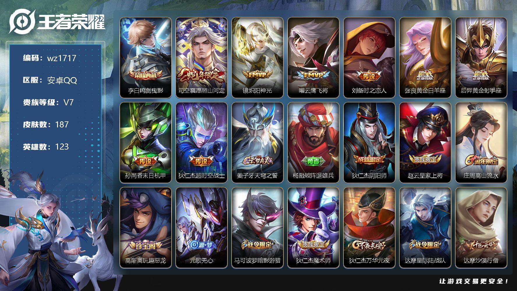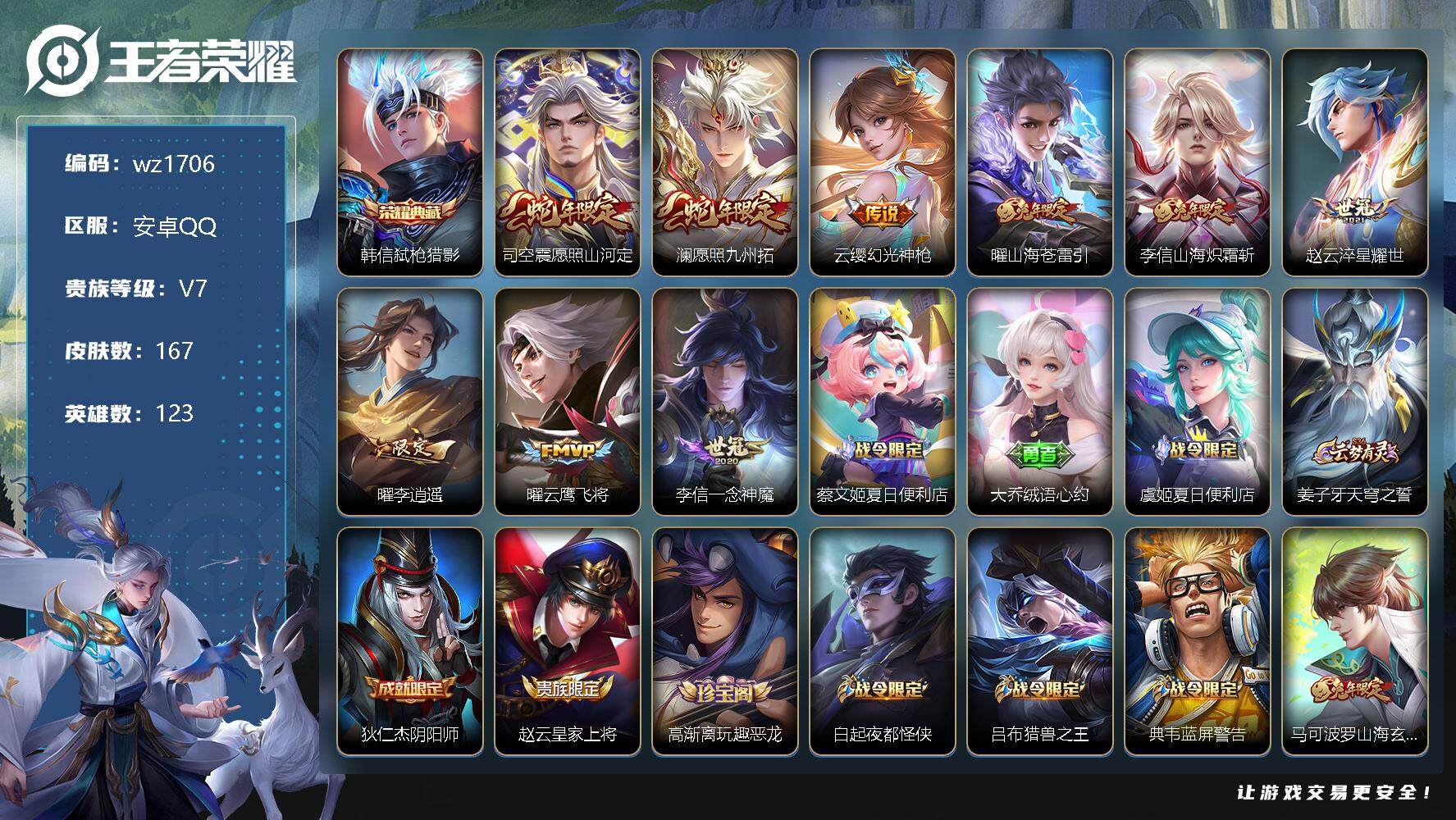 【游戏多多】 【可二次实名】【wz1706】【商品标题】:安卓Q-V7-永恒钻石II段位-123英雄-167皮肤-1典藏-0珍品无双-0无双-0珍品传说-9传说-42史诗 【英雄全皮】:李信全皮 【荣耀典藏】:韩信弑枪猎影 【传说皮肤】:司空震愿照山河定,澜愿照九州拓,云缨幻光神枪,曜山海苍雷引,李信山海炽霜斩,赵云淬星耀世,曜李逍遥 ,曜云鹰飞将,李信一念神魔 【限定皮肤】:蔡文姬夏日便利店,大乔绒语心约,虞姬夏日便利店,姜子牙天穹之誓,狄仁杰阴阳师,赵云皇家上将,高渐离玩趣恶龙,白起夜都怪侠,吕布猎兽之王,典韦蓝屏警告,马可波罗山海玄木吟,狄仁杰魔术师,达摩沙漠行僧,项羽海滩派对,韩信傲雪梅枪,王昭君午后时光,兰陵王金庭之子,李元芳云中旅人,鬼谷子五谷丰年,苏烈千军破阵,沈梦溪星空之诺,沈梦溪大漠名商,明世隐吟游魔法,裴擒虎擒涛扼浪,狂铁电玩高手,云中君时之祈愿,李信山海炽霜斩,上官婉儿梁祝,嫦娥暖冬兔眠,曜李逍遥 ,曜山海苍雷引,鲁班大师探海日志,桑启海盐诗旅,暃星界游侠,阿古朵江河有灵,张良古海寻踪,高渐离燃音魔法,妲己灵卜魔法,鬼谷子天穹祈灯,沈梦溪龙舞盛年,鲁班七号蔬乡物语,李元芳蔬乡物语,刘邦剑破天穹,镜青焰无极,项羽苍威无极,海诺心动手记,刘备异域游侠,周瑜熔金海岸 【年限皮肤】:马可波罗山海玄木吟,李信山海炽霜斩,曜山海苍雷引 【赛季限定】:达摩沙漠行僧,兰陵王金庭之子,张良古海寻踪,李元芳云中旅人,苏烈千军破阵,沈梦溪大漠名商,裴擒虎擒涛扼浪,鲁班大师探海日志,桑启海盐诗旅,鬼谷子天穹祈灯,刘邦剑破天穹,姜子牙天穹之誓 【战令限定】:蔡文姬夏日便利店,虞姬夏日便利店,白起夜都怪侠,吕布猎兽之王,典韦蓝屏警告,王昭君午后时光,沈梦溪星空之诺,明世隐吟游魔法,狂铁电玩高手,嫦娥暖冬兔眠,暃星界游侠,高渐离燃音魔法,妲己灵卜魔法,鲁班七号蔬乡物语,李元芳蔬乡物语,镜青焰无极,项羽苍威无极 【史诗皮肤】:露娜紫霞仙子,赵云皇家上将,甄姬冰雪圆舞曲,狄仁杰魔术师,宫本武藏鬼剑武藏,孙尚香水果甜心,妲己女仆咖啡,曹操幽灵船长,花木兰水晶猎龙者,刘邦德古拉伯爵,诸葛亮黄金分割率,百里守约特工魅影,李元芳逐浪之夏,程咬金功夫厨神,典韦蓝屏警告,伽罗箭羽风息,狄仁杰鹰眼统帅,上官婉儿梁祝,韩信傲雪梅枪,云中君时之祈愿,澜赏金猎手,明世隐吟游魔法,狂铁电玩高手,弈星滕王阁序,鬼谷子五谷丰年,暃星界游侠,马可波罗山海玄木吟,阿古朵江河有灵,妲己灵卜魔法,高渐离燃音魔法,鲁班七号蔬乡物语,镜青焰无极,海诺心动手记,蔡文姬夏日便利店,大司命东方月初,姬小满战舞者,廉颇撼地雄心,亚连破空之剑,孙膑茶境仙,赵怀真器灵浮梦炉,亚连糖绘人间,苍狼魂孤将,阿轲化蝶舞 【其他皮肤】:项羽海滩派对,赵云忍炎影,芈月红桃皇后,白起白色死神,孙膑天使之翼,亚瑟死亡骑士,宫本武藏万象初新,后羿阿尔法小队,狄仁杰阴阳师,刘备纽约教父,李元芳黑猫爱糖果,关羽龙腾万里,老夫子功夫老勺,孙尚香沉稳之力,李白敏锐之力,苏烈坚韧之力,吕布猎兽之王,小乔丁香结,吕布野性能量,高渐离玩趣恶龙,沈梦溪鲨炮海盗猫,沈梦溪星空之诺,哪吒次元突破,盾山圆桌骑士,狂铁特工战影,露娜瓷语鉴心,鲁班大师乓乓大师,苏烈千军破阵,达摩沙漠行僧,刘邦虎啸剑宗,白起夜都怪侠,兰陵王金庭之子,米莱狄契约魔法,王昭君午后时光,沈梦溪大漠名商,蒙犽胡桃狂想曲,蒙恬蔚蓝守将,李元芳云中旅人,戈娅危途狂花,刘备潮玩造梦师,桑启海盐诗旅,嫦娥暖冬兔眠,牛魔牛运亨通,裴擒虎擒涛扼浪,莱西奥西部游侠,鲁班大师探海日志,张良古海寻踪,海月王牌新星,亚连破局者,曹操决胜大满贯,后羿完美运算,鬼谷子天穹祈灯,妲己灵卜魔法,朵莉亚金色潮汐,亚瑟鸿运当头,沈梦溪龙舞盛年,钟无艳春野之旅,李元芳蔬乡物语,刘邦剑破天穹,项羽苍威无极,刘备异域游侠,姜子牙天穹之誓,周瑜熔金海岸,虞姬夏日便利店,大乔绒语心约,孙悟空神迹守卫,盘古敬我三分,东皇太一噬灭天穹,太乙真人谧流熔炉,马超访茗客,西施雪境奇遇,姜子牙星梦巡礼,东皇太一金福满堂,达摩爆裂喵拳,少司缘灵卦秘语,明世隐景韶洛都,戈娅玫蓝誓约,露娜绯红之刃,貂蝉异域舞娘,老夫子潮流仙人,程咬金华尔街大亨,狄仁杰锦衣卫,曹操超能战警,张良一千零一夜,孙悟空西部大镖客,钟馗地府判官,马可波罗激情绿茵,苍维京掠夺者,杨戬埃及法老,黄忠芝加哥教父,东皇太一东海龙王,干将莫邪第七人偶,百里守约绝影神枪,百里玄策威尼斯狂欢,梦奇美梦成真,公孙离花间舞,裴擒虎街头旋风,弈星踏雪寻梅,元歌午夜歌剧院,孙策海之征途,司马懿魇语军师,李信灼热之刃,上官婉儿修竹墨客,盘古创世神祝,瑶森,曜归虚梦演,马超幸存者,西施归虚梦演,蒙犽归虚梦演,镜冰刃幻境,蒙恬秩序猎龙将,司空震启蛰,云缨赤焰之缨,金蝉前尘,桑启画中游 【内测