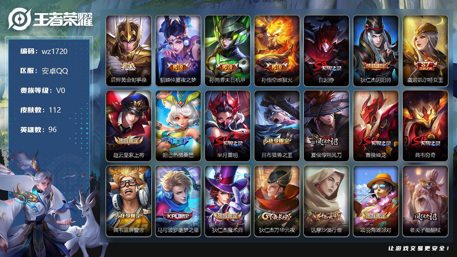 【游戏多多】 【可二次实名】【wz1720】【商品标题】:安卓Q-V0-尊贵铂金IV段位-96英雄-112皮肤-0典藏-0珍品无双-0无双-0珍品传说-4传说-25史诗 【传说皮肤】:后羿黄金射手座,貂蝉仲夏夜之梦,孙尚香末日机甲,孙悟空地狱火 【限定皮肤】:白起狰,狄仁杰阴阳师,虞姬凯尔特女王,赵云皇家上将,妲己热情桑巴,芈月重明,吕布猎兽之王,夏侯惇朔风刀,曹操烛龙,典韦穷奇,典韦蓝屏警告,马可波罗逐梦之星,狄仁杰魔术师,狄仁杰万华元夜,达摩沙漠行僧,项羽海滩派对,老夫子醍醐杖,关羽冰锋战神,程咬金演武夺筹,露娜一生所爱,韩信逐梦之影,兰陵王金庭之子,牛魔御旌,钟馗驱傩正仪,杨玉环遇见飞天,女娲朔望之晖,太乙真人饕餮,鬼谷子原初探秘者,公孙离蜜橘之夏,沈梦溪大漠名商,狂铁御狮,米莱狄御霄,鲁班大师探海日志,桑启海盐诗旅,鬼谷子天穹祈灯 【赛季限定】:白起狰,芈月重明,夏侯惇朔风刀,曹操烛龙,典韦穷奇,狄仁杰万华元夜,达摩沙漠行僧,老夫子醍醐杖,程咬金演武夺筹,兰陵王金庭之子,牛魔御旌,虞姬凯尔特女王,钟馗驱傩正仪,太乙真人饕餮,鬼谷子原初探秘者,沈梦溪大漠名商,狂铁御狮,米莱狄御霄,鲁班大师探海日志,桑启海盐诗旅,鬼谷子天穹祈灯 【战令限定】:吕布猎兽之王,典韦蓝屏警告,女娲朔望之晖 【史诗皮肤】:露娜紫霞仙子,赵云皇家上将,貂蝉圣诞恋歌,王昭君偶像歌手,狄仁杰魔术师,孙尚香水果甜心,妲己女仆咖啡,墨子金属风暴,李白千年之狐,妲己热情桑巴,韩信白龙吟,关羽冰锋战神,花木兰水晶猎龙者,刘邦德古拉伯爵,韩信逐梦之影,小乔缤纷独角兽,诸葛亮黄金分割率,马可波罗逐梦之星,亚瑟心灵战警,百里守约特工魅影,公孙离蜜橘之夏,杨玉环遇见飞天,露娜一生所爱,典韦蓝屏警告,狄仁杰鹰眼统帅 【其他皮肤】:项羽海滩派对,韩信教廷特使,韩信街头霸王,露娜哥特玫瑰,阿轲爱心护理,扁鹊化身博士,姜子牙时尚教父,妲己少女阿狸,亚瑟死亡骑士,达摩拳王,花木兰兔女郎,甄姬花好人间,刘备万事如意,宫本武藏万象初新,后羿阿尔法小队,狄仁杰阴阳师,刘备纽约教父,刘备汉昭烈帝,关羽龙腾万里,虞姬凯尔特女王,白起狰,钟无艳海滩丽影,太乙真人饕餮,曹操烛龙,芈月重明,孙尚香沉稳之力,典韦穷奇,鬼谷子幻乐之宴,狂铁御狮,安琪拉如懿,苏烈坚韧之力,米莱狄御霄,吕布猎兽之王,张良幽兰居士,庄周奇妙博物学,牛魔御旌,女娲朔望之晖,小乔丁香结,夏侯惇朔风刀,哪吒次元突破,老夫子醍醐杖,鬼谷子原初探秘者,狄仁杰万华元夜,程咬金演武夺筹,钟馗驱傩正仪,达摩沙漠行僧,刘邦虎啸剑宗,兰陵王金庭之子,沈梦溪大漠名商,桑启海盐诗旅,鲁班大师探海日志,曹操决胜大满贯,鬼谷子天穹祈灯,鲁班七号木偶奇遇记,露娜绯红之刃,王昭君精灵公主,小乔万圣前夜,孙悟空西部大镖客,后羿精灵王,刘禅英喵野望,兰陵王隐刃,李白范海辛,钟馗地府判官,李元芳特种部队,刘邦圣殿之光,关羽天启骑士,蔡文姬蔷薇王座,夏侯惇战争骑士,雅典娜战争女神,马可波罗激情绿茵,诸葛亮星航指挥官,大乔伊势巫女,东皇太一东海龙王,干将莫邪第七人偶,铠龙域领主,百里守约绝影神枪,百里玄策威尼斯狂欢,梦奇美梦成真,公孙离花间舞,元歌午夜歌剧院,伽罗花见巫女,李信灼热之刃,瑶森 【营地ID】:353890131