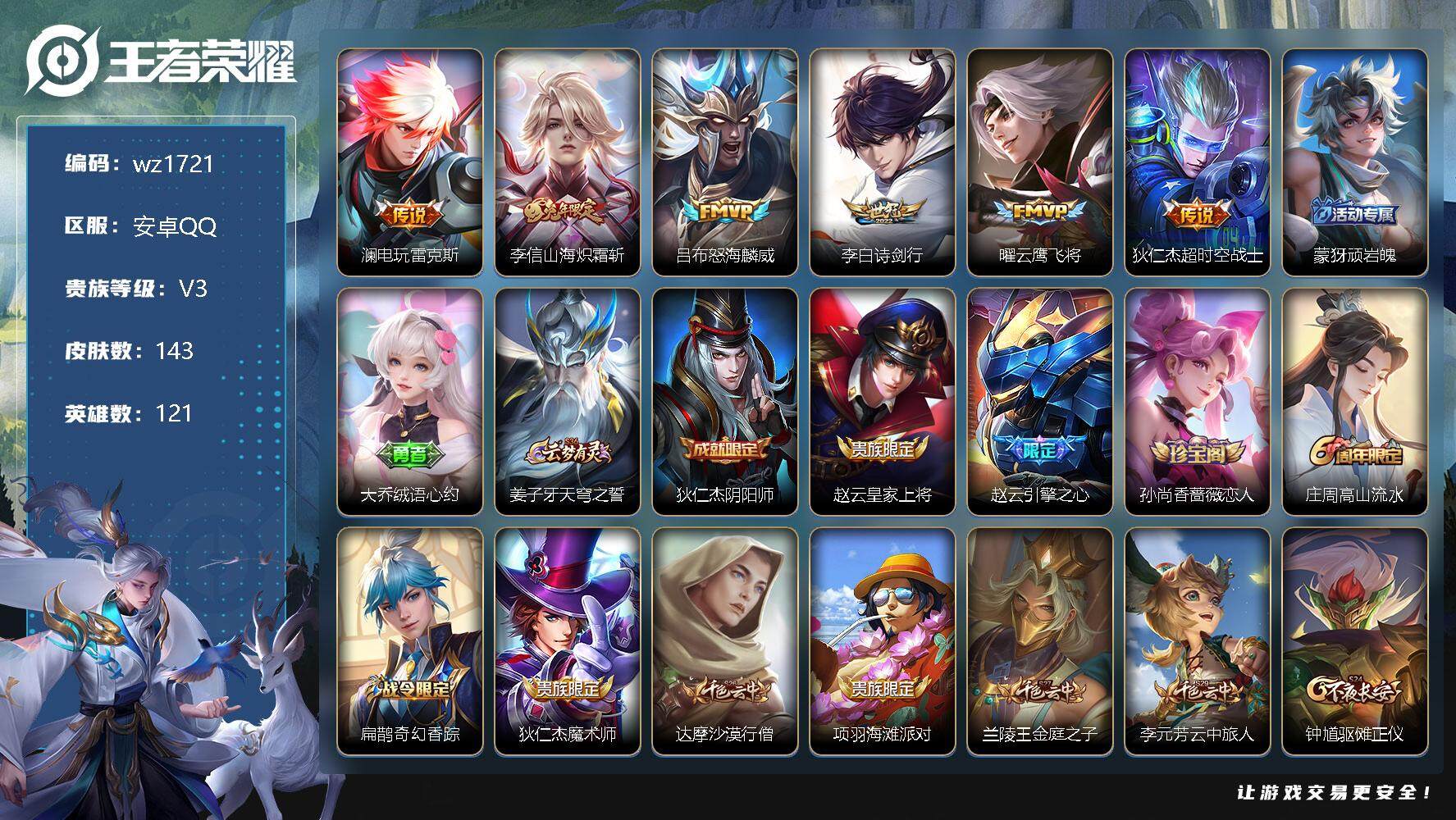 【游戏多多】 【可二次实名】【wz1721】【商品标题】:安卓Q-V3-永恒钻石IV段位-121英雄-143皮肤-0典藏-0珍品无双-0无双-0珍品传说-6传说-45史诗 【传说皮肤】:澜电玩雷克斯,李信山海炽霜斩,吕布怒海麟威,李白诗剑行,曜云鹰飞将,狄仁杰超时空战士 【限定皮肤】:蒙犽顽岩魄,大乔绒语心约,姜子牙天穹之誓,狄仁杰阴阳师,赵云皇家上将,赵云引擎之心,孙尚香蔷薇恋人,庄周高山流水,扁鹊奇幻香踪,狄仁杰魔术师,达摩沙漠行僧,项羽海滩派对,兰陵王金庭之子,李元芳云中旅人,钟馗驱傩正仪,杨戬潮玩骑兵,女娲朔望之晖,鬼谷子五谷丰年,苏烈千军破阵,百里玄策原初追逐者,梦奇顽趣,沈梦溪大漠名商,裴擒虎擒涛扼浪,李信山海炽霜斩,上官婉儿梁祝,嫦娥暖冬兔眠,鲁班大师探海日志,桑启海盐诗旅,暃星界游侠,阿古朵江河有灵,张良古海寻踪,蒙犽百解令,蒙恬荣光圣徽,高渐离燃音魔法,妲己灵卜魔法,鬼谷子天穹祈灯,姬小满妄想食味,百里玄策超元猎域,沈梦溪龙舞盛年,鲁班七号蔬乡物语,李元芳蔬乡物语,刘邦剑破天穹,程咬金群星魔术团,镜青焰无极,项羽苍威无极,周瑜熔金海岸 【年限皮肤】:李信山海炽霜斩 【赛季限定】:达摩沙漠行僧,兰陵王金庭之子,张良古海寻踪,李元芳云中旅人,钟馗驱傩正仪,苏烈千军破阵,百里玄策原初追逐者,梦奇顽趣,沈梦溪大漠名商,裴擒虎擒涛扼浪,鲁班大师探海日志,桑启海盐诗旅,鬼谷子天穹祈灯,蒙恬荣光圣徽,刘邦剑破天穹,姜子牙天穹之誓 【战令限定】:扁鹊奇幻香踪,杨戬潮玩骑兵,女娲朔望之晖,嫦娥暖冬兔眠,暃星界游侠,高渐离燃音魔法,妲己灵卜魔法,鲁班七号蔬乡物语,李元芳蔬乡物语,镜青焰无极,项羽苍威无极 【史诗皮肤】:鲁班七号电玩小子,露娜紫霞仙子,赵云皇家上将,赵云未来纪元,甄姬冰雪圆舞曲,王昭君偶像歌手,狄仁杰魔术师,宫本武藏鬼剑武藏,孙尚香蔷薇恋人,孙尚香水果甜心,妲己魅力维加斯,墨子金属风暴,吕布圣诞狂欢,刘禅绅士熊喵,曹操幽灵船长,赵云引擎之心,夏侯惇乘风破浪,兰陵王暗隐猎兽者,诸葛亮黄金分割率,亚瑟心灵战警,安琪拉心灵骇客,百里守约特工魅影,铠曙光守护者,李元芳逐浪之夏,阿轲节奏热浪,孙策猫狗日记,狄仁杰鹰眼统帅,上官婉儿梁祝,百里玄策原初追逐者,庄周高山流水,鬼谷子五谷丰年,梦奇顽趣,暃星界游侠,扁鹊奇幻香踪,刘禅电玩爆裂旋风,阿古朵江河有灵,蒙犽百解令,妲己灵卜魔法,高渐离燃音魔法,蒙恬荣光圣徽,姬小满妄想食味,百里玄策超元猎域,鲁班七号蔬乡物语,镜青焰无极,黄忠怒海争锋,蒙犽顽岩魄 【其他皮肤】:项羽海滩派对,韩信街头霸王,露娜哥特玫瑰,达摩大发明家,赵云白执事,赵云忍炎影,芈月红桃皇后,牛魔西部大镖客,庄周鲤鱼之梦,宫本武藏未来纪元,安琪拉玩偶对对碰,孙膑天使之翼,典韦黄金武士,亚瑟死亡骑士,达摩拳王,花木兰兔女郎,张飞五福同心,刘备万事如意,宫本武藏万象初新,狄仁杰阴阳师,刘备纽约教父,关羽龙腾万里,钟无艳海滩丽影,宫本武藏霸王丸,王昭君幻想奇妙夜,狂铁命运角斗场,老夫子功夫老勺,孙尚香沉稳之力,诸葛亮掌控之力,李白敏锐之力,大乔守护之力,明世隐虹云星官,女娲朔望之晖,沈梦溪鲨炮海盗猫,姜子牙炽热元素使,哪吒次元突破,狂铁特工战影,露娜瓷语鉴心,钟馗驱傩正仪,鲁班大师乓乓大师,苏烈千军破阵,达摩沙漠行僧,兰陵王金庭之子,沈梦溪大漠名商,蒙恬蔚蓝守将,李元芳云中旅人,桑启海盐诗旅,嫦娥暖冬兔眠,猪八戒潮玩探月行,裴擒虎擒涛扼浪,杨戬潮玩骑兵,太乙真人劲辣红锅,鲁班大师探海日志,李元芳妄想特派,哪吒热血海滩,张良古海寻踪,钟无艳聚星闪耀,海月王牌新星,亚连破局者,曹操决胜大满贯,后羿完美运算,鬼谷子天穹祈灯,妲己灵卜魔法,海诺时空谍影,嫦娥漠中幻影,朵莉亚金色潮汐,廉颇功夫炙烤,亚瑟鸿运当头,沈梦溪龙舞盛年,钟无艳春野之旅,李元芳蔬乡物语,刘邦剑破天穹,程咬金群星魔术团,项羽苍威无极,大司命暗都幽影,姜子牙天穹之誓,周瑜熔金海岸,大乔绒语心约,盘古敬我三分,老夫子潮流仙人,曹操超能战警,张良一千零一夜,虞姬加勒比小姐,蔡文姬蔷薇王座,马可波罗激情绿茵,百里守约绝影神枪,司马懿魇语军师,盾山极冰防御线,李信灼热之刃,马超幸存者,澜孤猎,暃碧珀绯影 【内测皮肤】:孙尚香蔷薇恋人,狂铁特工战影 【营地ID】:1759536864