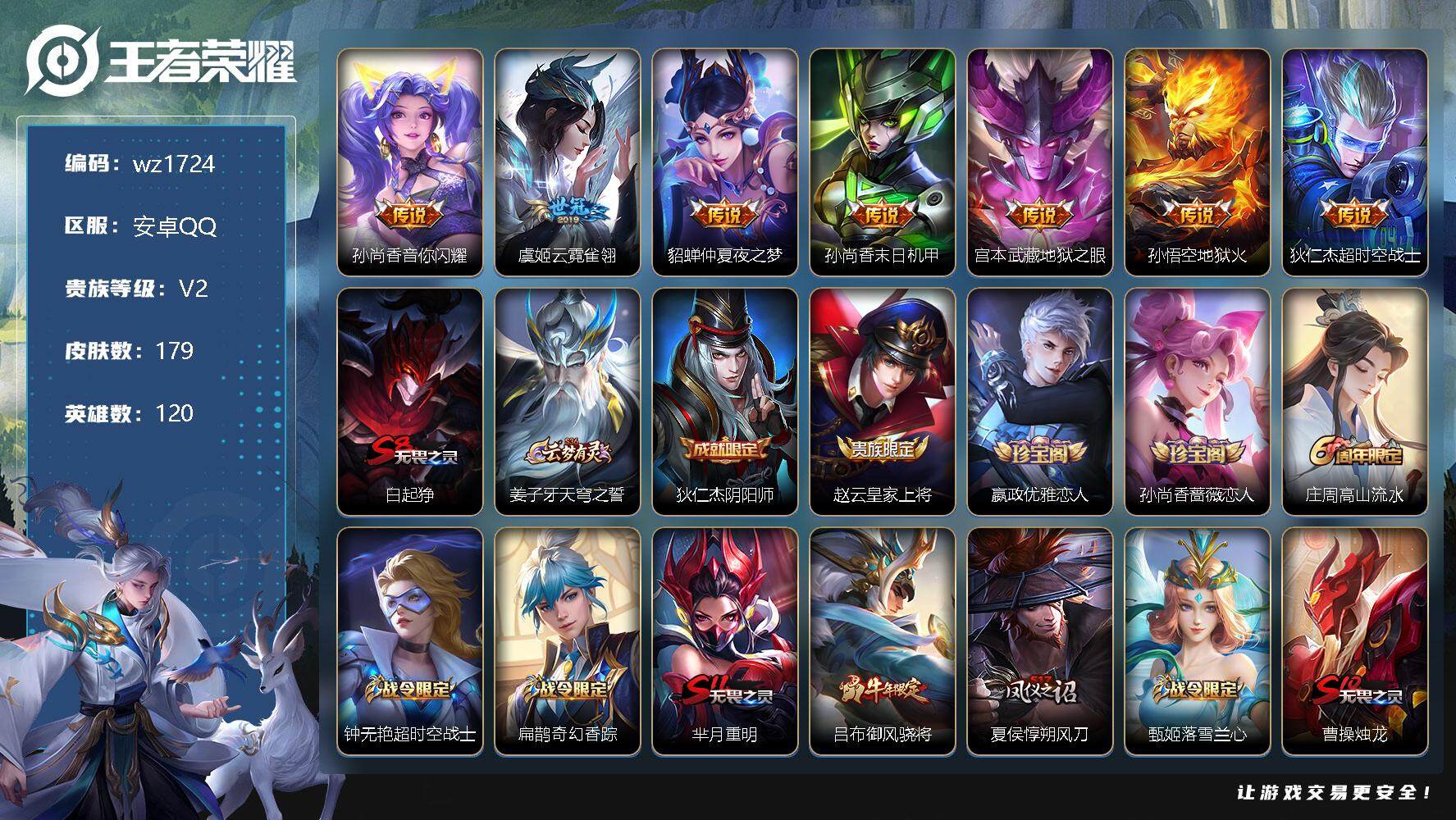【游戏多多】 【可二次实名】【wz1724】【商品标题】:安卓Q-V2-永恒钻石II段位-120英雄-179皮肤-0典藏-0珍品无双-0无双-0珍品传说-7传说-47史诗 【传说皮肤】:孙尚香音你闪耀,虞姬云霓雀翎,貂蝉仲夏夜之梦,孙尚香末日机甲,宫本武藏地狱之眼,孙悟空地狱火,狄仁杰超时空战士 【限定皮肤】:白起狰,姜子牙天穹之誓,狄仁杰阴阳师,赵云皇家上将,嬴政优雅恋人,孙尚香蔷薇恋人,庄周高山流水,钟无艳超时空战士,扁鹊奇幻香踪,芈月重明,吕布御风骁将,夏侯惇朔风刀,甄姬落雪兰心,曹操烛龙,典韦穷奇,马可波罗山海玄木吟,狄仁杰魔术师,狄仁杰万华元夜,达摩沙漠行僧,项羽海滩派对,老夫子醍醐杖,程咬金演武夺筹,韩信傲雪梅枪,王昭君午后时光,兰陵王金庭之子,孙悟空孙行者,牛魔御旌,李元芳云中旅人,虞姬霸王别姬,钟馗驱傩正仪,杨戬潮玩骑兵,干将莫邪冰霜恋舞曲,雅典娜单词大作战,雅典娜黎明之约,太乙真人饕餮,鬼谷子原初探秘者,鬼谷子五谷丰年,苏烈千军破阵,百里玄策原初追逐者,弈星混沌棋,梦奇顽趣,沈梦溪大漠名商,明世隐疑决卦,裴擒虎李小龙,裴擒虎擒涛扼浪,狂铁御狮,狂铁电玩高手,米莱狄御霄,云中君纤云弄巧,盾山御銮,上官婉儿梁祝,嫦娥暖冬兔眠,蒙犽狂想玩偶喵,鲁班大师探海日志,桑启海盐诗旅,暃星界游侠,张良古海寻踪,蒙恬荣光圣徽,鬼谷子天穹祈灯,刘邦剑破天穹,程咬金群星魔术团 【年限皮肤】:吕布御风骁将,马可波罗山海玄木吟 【赛季限定】:白起狰,芈月重明,夏侯惇朔风刀,曹操烛龙,典韦穷奇,狄仁杰万华元夜,达摩沙漠行僧,老夫子醍醐杖,程咬金演武夺筹,兰陵王金庭之子,张良古海寻踪,牛魔御旌,李元芳云中旅人,钟馗驱傩正仪,雅典娜黎明之约,太乙真人饕餮,鬼谷子原初探秘者,苏烈千军破阵,百里玄策原初追逐者,弈星混沌棋,梦奇顽趣,沈梦溪大漠名商,明世隐疑决卦,裴擒虎擒涛扼浪,狂铁御狮,米莱狄御霄,盾山御銮,鲁班大师探海日志,桑启海盐诗旅,鬼谷子天穹祈灯,蒙恬荣光圣徽,刘邦剑破天穹,姜子牙天穹之誓 【战令限定】:钟无艳超时空战士,扁鹊奇幻香踪,甄姬落雪兰心,王昭君午后时光,杨戬潮玩骑兵,雅典娜单词大作战,狂铁电玩高手,嫦娥暖冬兔眠,蒙犽狂想玩偶喵,暃星界游侠 【史诗皮肤】:鲁班七号电玩小子,阿轲暗夜猫娘,赵云皇家上将,赵云未来纪元,甄姬冰雪圆舞曲,狄仁杰魔术师,宫本武藏鬼剑武藏,孙尚香蔷薇恋人,孙尚香水果甜心,嬴政优雅恋人,妲己魅力维加斯,妲己女仆咖啡,墨子龙骑士,墨子金属风暴,曹操幽灵船长,虞姬霸王别姬,花木兰水晶猎龙者,刘邦德古拉伯爵,兰陵王暗隐猎兽者,诸葛亮黄金分割率,刘禅天才门将,李元芳逐浪之夏,白起星夜王子,大乔猫狗日记,干将莫邪冰霜恋舞曲,伽罗箭羽风息,狄仁杰鹰眼统帅,公孙离无限星赏官,上官婉儿梁祝,蒙犽狂想玩偶喵,百里玄策原初追逐者,裴擒虎李小龙,云中君纤云弄巧,吕布御风骁将,孙悟空孙行者,庄周高山流水,雅典娜黎明之约,韩信傲雪梅枪,狂铁电玩高手,钟无艳超时空战士,鬼谷子五谷丰年,梦奇顽趣,暃星界游侠,马可波罗山海玄木吟,扁鹊奇幻香踪,蒙恬荣光圣徽,牛魔星界战将 【其他皮肤】:项羽海滩派对,韩信教廷特使,韩信街头霸王,达摩大发明家,赵云忍炎影,白起白色死神,武则天东方不败,扁鹊化身博士,宫本武藏未来纪元,安琪拉玩偶对对碰,妲己少女阿狸,典韦黄金武士,亚瑟死亡骑士,花木兰兔女郎,张飞五福同心,甄姬花好人间,刘备万事如意,宫本武藏万象初新,狄仁杰阴阳师,刘备纽约教父,刘备汉昭烈帝,关羽龙腾万里,白起狰,钟无艳海滩丽影,太乙真人饕餮,宫本武藏霸王丸,曹操烛龙,王昭君幻想奇妙夜,芈月重明,老夫子功夫老勺,孙尚香沉稳之力,典韦穷奇,李白敏锐之力,鬼谷子幻乐之宴,狂铁御狮,大乔守护之力,项羽科学大爆炸,米莱狄御霄,明世隐虹云星官,牛魔御旌,小乔丁香结,吕布野性能量,盾山御銮,孙膑归虚梦演,沈梦溪鲨炮海盗猫,姜子牙炽热元素使,夏侯惇朔风刀,弈星混沌棋,哪吒次元突破,明世隐疑决卦,盾山圆桌骑士,老夫子醍醐杖,狂铁特工战影,鬼谷子原初探秘者,雅典娜单词大作战,狄仁杰万华元夜,刘禅秘密基地,露娜瓷语鉴心,程咬金演武夺筹,张良缤纷绘卷,钟馗驱傩正仪,鲁班大师乓乓大师,苏烈千军破阵,妲己紫罗兰之誓,达摩沙漠行僧,程咬金无双福将,刘邦虎啸剑宗,兰陵王金庭之子,王昭君午后时光,沈梦溪大漠名商,蒙恬蔚蓝守将,甄姬落雪兰心,李元芳云中旅人,戈娅危途狂花,刘备潮玩造梦师,桑启海盐诗旅,嫦娥暖冬兔眠,海月幻泉雾影,猪八戒潮玩探月行,牛魔牛运亨通,白起乐园追猎者,裴擒虎擒涛扼浪,杨戬潮玩骑兵,太乙真人劲辣红锅,莱西奥西部游侠,鲁班大师探海日志,李元芳妄想特派,张良古海寻踪,后羿完美运算,鬼谷子天穹祈灯,廉颇功夫炙烤,刘邦剑破天穹,程咬金群星魔术团,貂蝉长夏之忆,姜子牙天穹之誓,东皇太一噬灭天