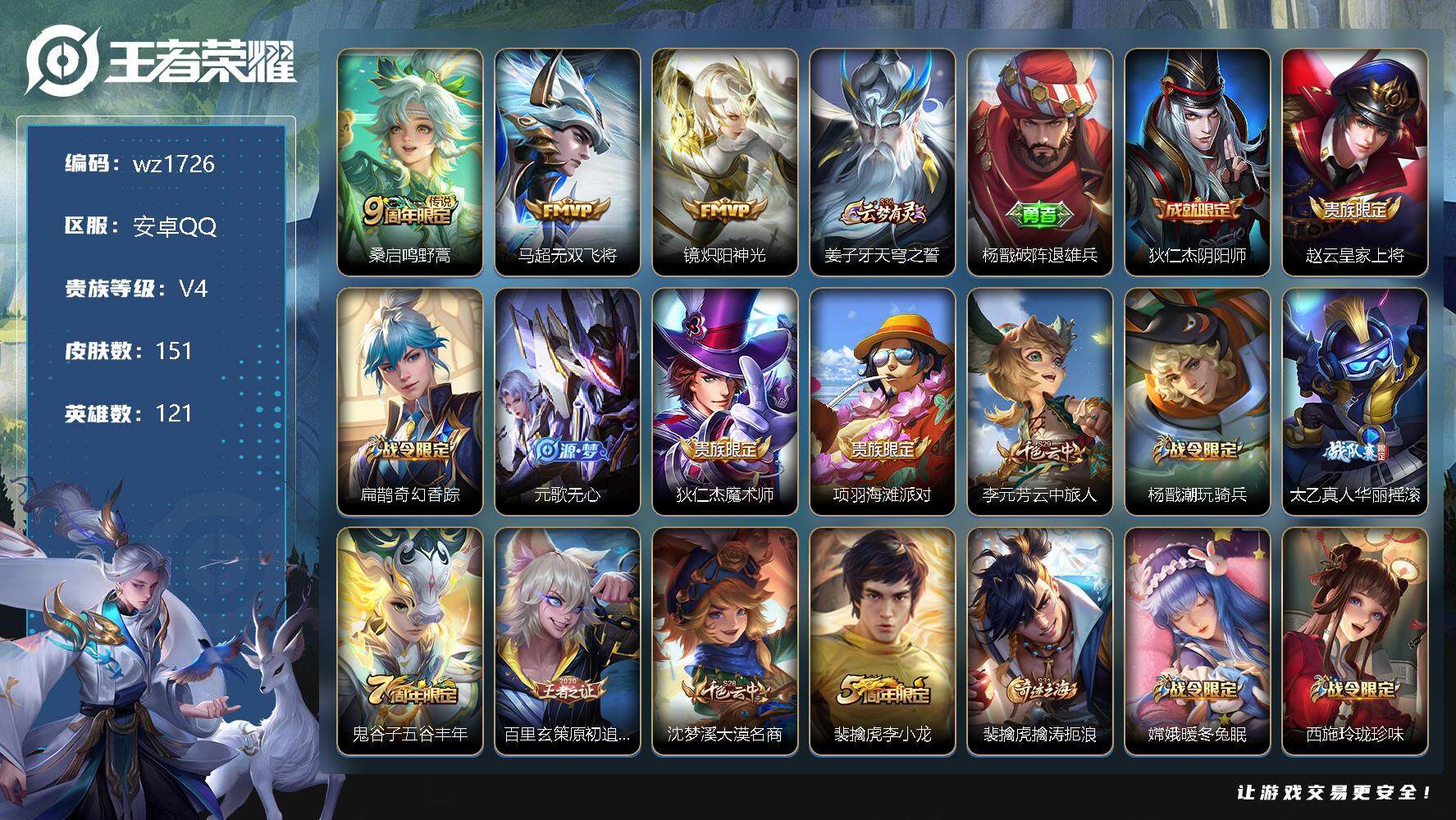 【游戏多多】 【可二次实名】【wz1726】【商品标题】:安卓Q-V4-永恒钻石IV段位-121英雄-151皮肤-0典藏-0珍品无双-0无双-0珍品传说-3传说-38史诗 【传说皮肤】:桑启鸣野蒿,马超无双飞将,镜炽阳神光 【限定皮肤】:姜子牙天穹之誓,杨戬破阵退雄兵,狄仁杰阴阳师,赵云皇家上将,扁鹊奇幻香踪,元歌无心,狄仁杰魔术师,项羽海滩派对,李元芳云中旅人,杨戬潮玩骑兵,太乙真人华丽摇滚,鬼谷子五谷丰年,百里玄策原初追逐者,沈梦溪大漠名商,裴擒虎李小龙,裴擒虎擒涛扼浪,嫦娥暖冬兔眠,西施玲珑珍味,鲁班大师探海日志,桑启海盐诗旅,暃星界游侠,戈娅驭风魔法,艾琳女武神,阿古朵江河有灵,张良古海寻踪,蒙恬荣光圣徽,鬼谷子天穹祈灯,沈梦溪龙舞盛年,刘邦剑破天穹,程咬金群星魔术团,周瑜熔金海岸 【赛季限定】:张良古海寻踪,李元芳云中旅人,百里玄策原初追逐者,沈梦溪大漠名商,裴擒虎擒涛扼浪,鲁班大师探海日志,桑启海盐诗旅,鬼谷子天穹祈灯,蒙恬荣光圣徽,刘邦剑破天穹,姜子牙天穹之誓 【战令限定】:扁鹊奇幻香踪,杨戬潮玩骑兵,嫦娥暖冬兔眠,西施玲珑珍味,暃星界游侠,戈娅驭风魔法 【史诗皮肤】:露娜紫霞仙子,赵云皇家上将,貂蝉圣诞恋歌,甄姬冰雪圆舞曲,狄仁杰魔术师,宫本武藏鬼剑武藏,孙尚香水果甜心,嬴政摇滚巨星,妲己魅力维加斯,妲己女仆咖啡,墨子龙骑士,墨子金属风暴,曹操幽灵船长,吕布末日机甲,花木兰水晶猎龙者,刘邦德古拉伯爵,兰陵王暗隐猎兽者,雅典娜冰冠公主,安琪拉心灵骇客,百里守约特工魅影,刘禅天才门将,阿轲节奏热浪,孙策猫狗日记,狄仁杰鹰眼统帅,孙尚香时之恋人,百里玄策原初追逐者,裴擒虎李小龙,貂蝉唤灵魅影,鬼谷子五谷丰年,元歌无心,暃星界游侠,扁鹊奇幻香踪,刘禅电玩爆裂旋风,戈娅驭风魔法,阿古朵江河有灵,蒙恬荣光圣徽,大司命东方月初,姬小满战舞者 【其他皮肤】:项羽海滩派对,韩信教廷特使,韩信街头霸王,达摩大发明家,赵云忍炎影,芈月红桃皇后,艾琳女武神,白起白色死神,牛魔西部大镖客,武则天东方不败,安琪拉玩偶对对碰,孙膑天使之翼,妲己少女阿狸,典韦黄金武士,亚瑟死亡骑士,达摩拳王,花木兰兔女郎,张飞五福同心,刘备万事如意,后羿阿尔法小队,狄仁杰阴阳师,刘备纽约教父,李元芳黑猫爱糖果,关羽龙腾万里,钟无艳海滩丽影,狂铁命运角斗场,老夫子功夫老勺,孙尚香沉稳之力,李白敏锐之力,鬼谷子幻乐之宴,太乙真人华丽摇滚,大乔守护之力,明世隐虹云星官,孙膑归虚梦演,沈梦溪鲨炮海盗猫,姜子牙炽热元素使,哪吒次元突破,狂铁特工战影,刘禅秘密基地,鲁班大师乓乓大师,程咬金无双福将,刘禅唤灵魔甲,沈梦溪大漠名商,李元芳云中旅人,戈娅危途狂花,桑启海盐诗旅,嫦娥暖冬兔眠,猪八戒潮玩探月行,白起乐园追猎者,裴擒虎擒涛扼浪,杨戬潮玩骑兵,太乙真人劲辣红锅,莱西奥西部游侠,鲁班大师探海日志,西施玲珑珍味,姬小满零食大作战,李元芳妄想特派,张良古海寻踪,钟无艳聚星闪耀,亚连破局者,后羿完美运算,鬼谷子天穹祈灯,嫦娥漠中幻影,朵莉亚金色潮汐,廉颇功夫炙烤,沈梦溪龙舞盛年,钟无艳春野之旅,刘邦剑破天穹,程咬金群星魔术团,大司命暗都幽影,杨戬破阵退雄兵,姜子牙天穹之誓,周瑜熔金海岸,盘古敬我三分,东皇太一噬灭天穹,鲁班七号木偶奇遇记,项羽帝国元帅,露娜绯红之刃,貂蝉异域舞娘,老夫子潮流仙人,狄仁杰锦衣卫,曹操超能战警,张良一千零一夜,孙膑未来旅行,孙悟空西部大镖客,周瑜海军大将,刘禅英喵野望,李元芳特种部队,虞姬加勒比小姐,蔡文姬蔷薇王座,马可波罗激情绿茵,百里守约绝影神枪,女娲尼罗河女神,公孙离花间舞,杨玉环霓裳曲,元歌午夜歌剧院,伽罗花见巫女,李信灼热之刃,上官婉儿修竹墨客,嫦娥露花倒影,瑶森,曜归虚梦演,马超幸存者,西施归虚梦演,镜冰刃幻境,阿古朵熊喵少女,澜孤猎,司空震启蛰,云缨赤焰之缨,暃碧珀绯影 【内测皮肤】:艾琳女武神,狂铁特工战影 【营地ID】:1716597063