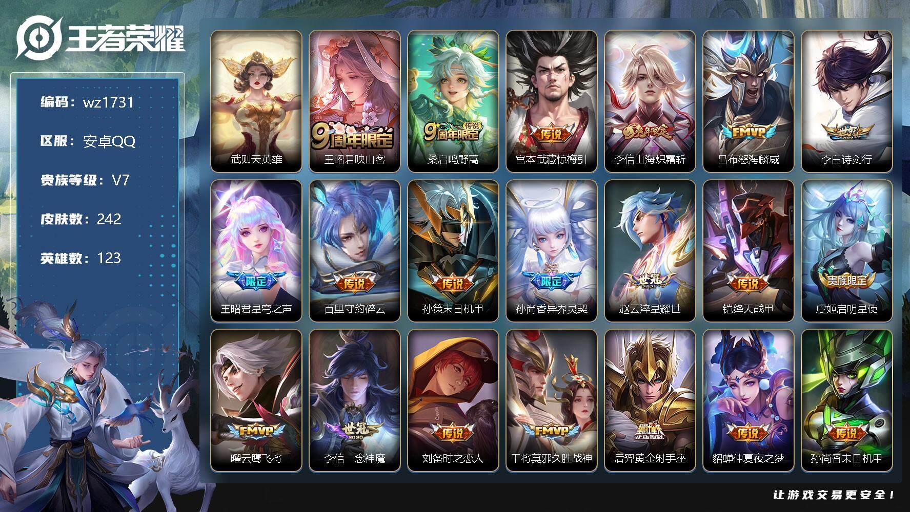 【游戏多多】 【可二次实名】【wz1731】【商品标题】:安卓Q-V7-至尊星耀IV段位-123英雄-242皮肤-0典藏-0珍品无双-0无双-0珍品传说-22传说-59史诗 【英雄全皮】:李信全皮 【荣耀典藏】:武则天英雄 【传说皮肤】:王昭君映山客,桑启鸣野蒿,宫本武藏惊梅引,李信山海炽霜斩,吕布怒海麟威,李白诗剑行,王昭君星穹之声,百里守约碎云,孙策末日机甲,孙尚香异界灵契,赵云淬星耀世,铠绛天战甲,虞姬启明星使,曜云鹰飞将,李信一念神魔,刘备时之恋人,干将莫邪久胜战神,后羿黄金射手座,貂蝉仲夏夜之梦,孙尚香末日机甲,宫本武藏地狱之眼,武则天海洋之心 【限定皮肤】:白起狰,姜子牙天穹之誓,狄仁杰阴阳师,赵云皇家上将,墨子神迹守卫,妲己时之彼端,嬴政白昼王子,孙尚香异界灵契,鲁班七号狮舞东方,庄周高山流水,钟无艳王者之锤,钟无艳超时空战士,芈月重明,芈月白晶晶,芈月幻夜卜梦,吕布猎兽之王,周瑜赤莲之焰,元歌无心,夏侯惇朔风刀,甄姬落雪兰心,曹操烛龙,典韦穷奇,典韦岱宗,狄仁杰魔术师,狄仁杰万华元夜,达摩沙漠行僧,项羽海滩派对,老夫子醍醐杖,老夫子航海奇遇记,程咬金演武夺筹,王昭君星穹之声,兰陵王驯魔猎人,兰陵王金庭之子,孙悟空至尊宝,孙悟空孙行者,牛魔御旌,后羿圣弓游侠,李元芳云中旅人,虞姬启明星使,钟馗神迹守卫,钟馗驱傩正仪,杨玉环遇见飞天,干将莫邪真爱魔法,蔡文姬繁星吟游,鬼谷子原初探秘者,鬼谷子五谷丰年,苏烈千军破阵,弈星混沌棋,沈梦溪大漠名商,明世隐疑决卦,裴擒虎李小龙,裴擒虎擒涛扼浪,狂铁御狮,米莱狄御霄,云中君纤云弄巧,李信山海炽霜斩,盾山御銮,盾山梦圆繁星,上官婉儿梁祝,嫦娥拒霜思,鲁班大师探海日志,桑启海盐诗旅,艾琳女武神,张良古海寻踪,鬼谷子天穹祈灯,姬小满妄想食味,沈梦溪龙舞盛年,刘邦剑破天穹,程咬金群星魔术团,周瑜熔金海岸 【年限皮肤】:典韦岱宗,李信山海炽霜斩 【赛季限定】:白起狰,芈月重明,夏侯惇朔风刀,曹操烛龙,典韦穷奇,狄仁杰万华元夜,达摩沙漠行僧,老夫子醍醐杖,程咬金演武夺筹,兰陵王金庭之子,张良古海寻踪,牛魔御旌,李元芳云中旅人,钟馗驱傩正仪,鬼谷子原初探秘者,苏烈千军破阵,弈星混沌棋,沈梦溪大漠名商,明世隐疑决卦,裴擒虎擒涛扼浪,狂铁御狮,米莱狄御霄,盾山御銮,鲁班大师探海日志,桑启海盐诗旅,鬼谷子天穹祈灯,刘邦剑破天穹,姜子牙天穹之誓 【战令限定】:墨子神迹守卫,嬴政白昼王子,鲁班七号狮舞东方,钟无艳超时空战士,芈月幻夜卜梦,吕布猎兽之王,周瑜赤莲之焰,甄姬落雪兰心,老夫子航海奇遇记,兰陵王驯魔猎人,后羿圣弓游侠,钟馗神迹守卫,干将莫邪真爱魔法 【史诗皮肤】:露娜紫霞仙子,钟无艳王者之锤,赵云皇家上将,赵云未来纪元,貂蝉圣诞恋歌,甄姬冰雪圆舞曲,王昭君偶像歌手,狄仁杰魔术师,宫本武藏鬼剑武藏,孙尚香水果甜心,嬴政暗夜贵公子,嬴政摇滚巨星,妲己魅力维加斯,妲己女仆咖啡,墨子龙骑士,墨子金属风暴,吕布圣诞狂欢,曹操幽灵船长,吕布末日机甲,孙悟空至尊宝,花木兰水晶猎龙者,刘邦德古拉伯爵,夏侯惇乘风破浪,小乔缤纷独角兽,兰陵王暗隐猎兽者,诸葛亮黄金分割率,亚瑟心灵战警,百里守约特工魅影,铠曙光守护者,程咬金功夫厨神,阿轲节奏热浪,杨玉环遇见飞天,嬴政白昼王子,孙策猫狗日记,伽罗箭羽风息,鲁班七号狮舞东方,狄仁杰鹰眼统帅,兰陵王驯魔猎人,上官婉儿梁祝,蔡文姬繁星吟游,典韦岱宗,妲己时之彼端,不知火舞魅语,瑶遇见神鹿,裴擒虎李小龙,云中君纤云弄巧,芈月白晶晶,老夫子航海奇遇记,干将莫邪真爱魔法,安琪拉时之奇旅,孙悟空孙行者,庄周高山流水,嫦娥拒霜思,澜赏金猎手,钟无艳超时空战士,鬼谷子五谷丰年,盾山梦圆繁星,元歌无心,姬小满妄想食味 【其他皮肤】:项羽海滩派对,韩信教廷特使,韩信街头霸王,露娜哥特玫瑰,阿轲爱心护理,赵云忍炎影,芈月红桃皇后,艾琳女武神,牛魔西部大镖客,武则天东方不败,扁鹊化身博士,扁鹊救世之瞳,宫本武藏未来纪元,安琪拉玩偶对对碰,孙膑天使之翼,姜子牙时尚教父,妲己少女阿狸,典韦黄金武士,亚瑟死亡骑士,达摩拳王,张飞五福同心,甄姬花好人间,刘备万事如意,宫本武藏万象初新,狄仁杰阴阳师,刘备纽约教父,关羽龙腾万里,白起狰,钟无艳海滩丽影,宫本武藏霸王丸,曹操烛龙,王昭君幻想奇妙夜,芈月重明,狂铁命运角斗场,老夫子功夫老勺,牛魔制霸全明星,孙尚香沉稳之力,典韦穷奇,李白敏锐之力,鬼谷子幻乐之宴,狂铁御狮,苏烈坚韧之力,大乔守护之力,米莱狄御霄,吕布猎兽之王,明世隐虹云星官,庄周奇妙博物学,牛魔御旌,小乔丁香结,钟馗神迹守卫,盾山御銮,孙膑归虚梦演,沈梦溪鲨炮海盗猫,姜子牙炽热元素使,夏侯惇朔风刀,周瑜赤莲之焰,弈星混沌棋,哪吒次元突破,鲁班七号黑桃队长,明世隐疑决卦,盾山圆桌骑士,老夫子醍醐杖,狂铁特工战影,廉