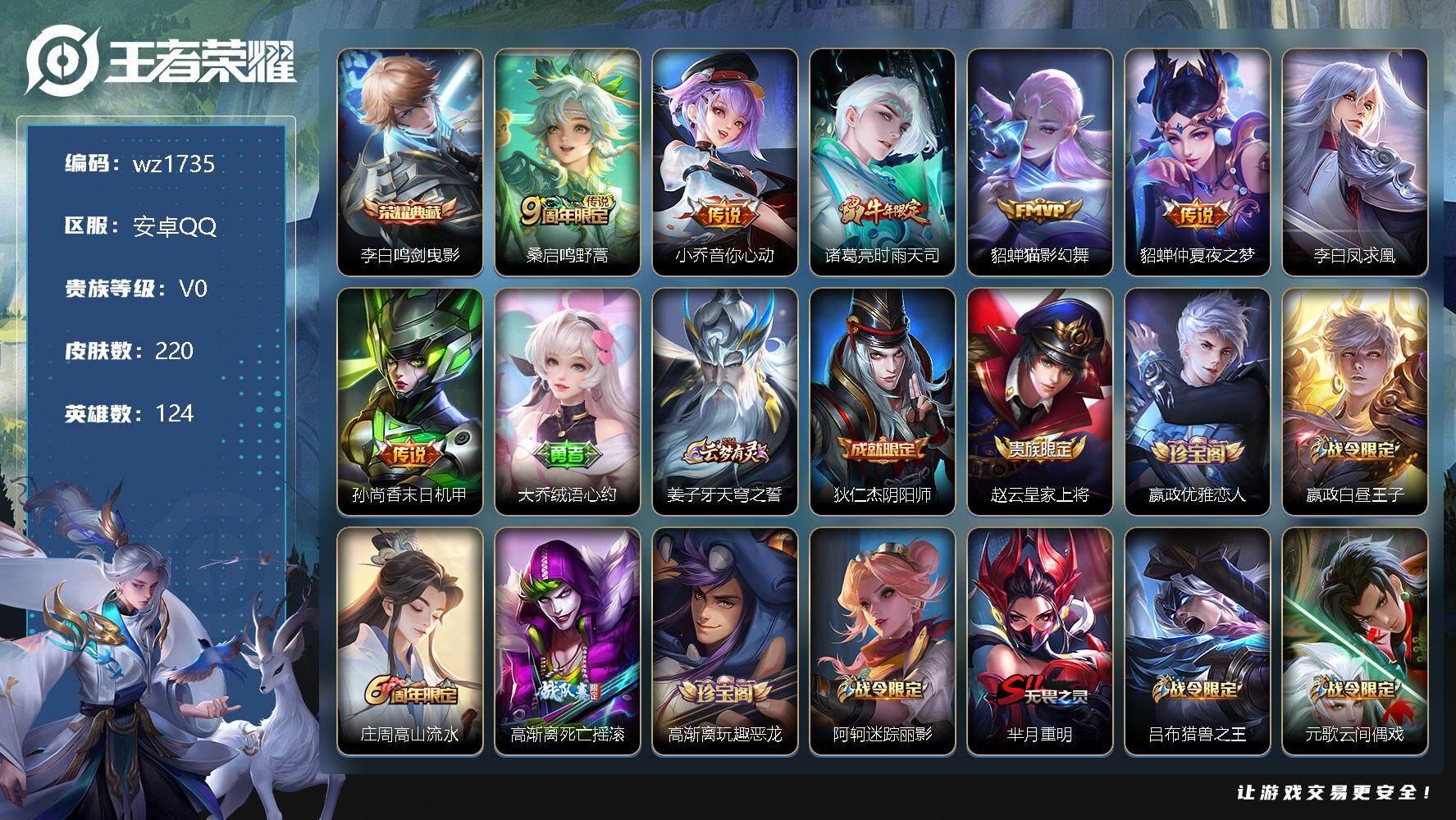 【游戏多多】 【可二次实名】【wz1735】【商品标题】:安卓Q-V0-荣耀黄金II段位-124英雄-220皮肤-1典藏-0珍品无双-0无双-0珍品传说-7传说-53史诗 【荣耀典藏】:李白鸣剑曳影 【传说皮肤】:桑启鸣野蒿,小乔音你心动,诸葛亮时雨天司,貂蝉猫影幻舞,貂蝉仲夏夜之梦,李白凤求凰,孙尚香末日机甲 【限定皮肤】:大乔绒语心约,姜子牙天穹之誓,狄仁杰阴阳师,赵云皇家上将,嬴政优雅恋人,嬴政白昼王子,庄周高山流水,高渐离死亡摇滚,高渐离玩趣恶龙,阿轲迷踪丽影,芈月重明,吕布猎兽之王,元歌云间偶戏,元歌无心,夏侯惇朔风刀,甄姬游园惊梦,曹操烛龙,典韦穷奇,马可波罗逐梦之星,狄仁杰魔术师,狄仁杰万华元夜,达摩沙漠行僧,项羽海滩派对,老夫子醍醐杖,安琪拉魔法小厨娘,程咬金演武夺筹,刘邦夺宝奇兵,韩信傲雪梅枪,兰陵王金庭之子,亚瑟潮玩骑士王,孙悟空至尊宝,牛魔御旌,李元芳云中旅人,钟馗驱傩正仪,杨玉环遇见飞天,干将莫邪冰霜恋舞曲,雅典娜黎明之约,太乙真人华丽摇滚,鬼谷子原初探秘者,鬼谷子五谷丰年,诸葛亮时雨天司,苏烈千军破阵,百里玄策原初追逐者,弈星混沌棋,梦奇顽趣,沈梦溪大漠名商,明世隐疑决卦,裴擒虎李小龙,裴擒虎擒涛扼浪,狂铁御狮,米莱狄御霄,云中君纤云弄巧,盾山御銮,上官婉儿梁祝,嫦娥拒霜思,鲁班大师探海日志,桑启海盐诗旅,艾琳女武神,阿古朵江河有灵,张良古海寻踪,蒙恬荣光圣徽,鬼谷子天穹祈灯,沈梦溪龙舞盛年,刘邦剑破天穹,程咬金群星魔术团 【年限皮肤】:李白凤求凰,诸葛亮时雨天司 【赛季限定】:芈月重明,夏侯惇朔风刀,曹操烛龙,典韦穷奇,狄仁杰万华元夜,达摩沙漠行僧,老夫子醍醐杖,程咬金演武夺筹,兰陵王金庭之子,张良古海寻踪,牛魔御旌,李元芳云中旅人,钟馗驱傩正仪,雅典娜黎明之约,鬼谷子原初探秘者,苏烈千军破阵,百里玄策原初追逐者,弈星混沌棋,梦奇顽趣,沈梦溪大漠名商,明世隐疑决卦,裴擒虎擒涛扼浪,狂铁御狮,米莱狄御霄,盾山御銮,鲁班大师探海日志,桑启海盐诗旅,鬼谷子天穹祈灯,蒙恬荣光圣徽,刘邦剑破天穹,姜子牙天穹之誓 【战令限定】:嬴政白昼王子,阿轲迷踪丽影,吕布猎兽之王,元歌云间偶戏,刘邦夺宝奇兵,亚瑟潮玩骑士王 【史诗皮肤】:鲁班七号电玩小子,项羽苍穹之光,阿轲暗夜猫娘,赵云皇家上将,赵云未来纪元,甄姬冰雪圆舞曲,王昭君偶像歌手,狄仁杰魔术师,廉颇地狱岩魂,宫本武藏鬼剑武藏,孙尚香水果甜心,嬴政优雅恋人,嬴政摇滚巨星,妲己魅力维加斯,妲己女仆咖啡,墨子金属风暴,吕布末日机甲,安琪拉魔法小厨娘,韩信白龙吟,孙悟空至尊宝,刘邦德古拉伯爵,夏侯惇乘风破浪,甄姬游园惊梦,马可波罗逐梦之星,亚瑟心灵战警,雅典娜冰冠公主,蔡文姬舞动绿茵,刘禅天才门将,李元芳逐浪之夏,杨玉环遇见飞天,嬴政白昼王子,孙策猫狗日记,干将莫邪冰霜恋舞曲,狄仁杰鹰眼统帅,上官婉儿梁祝,不知火舞魅语,阿轲迷踪丽影,橘右京修罗,百里玄策原初追逐者,裴擒虎李小龙,云中君纤云弄巧,元歌云间偶戏,庄周高山流水,嫦娥拒霜思,雅典娜黎明之约,韩信傲雪梅枪,夏洛特永昼,鬼谷子五谷丰年,元歌无心,梦奇顽趣,刘禅电玩爆裂旋风,阿古朵江河有灵,蒙恬荣光圣徽 【其他皮肤】:项羽海滩派对,韩信教廷特使,韩信街头霸王,露娜哥特玫瑰,阿轲爱心护理,达摩大发明家,赵云白执事,赵云忍炎影,艾琳女武神,白起白色死神,牛魔西部大镖客,扁鹊化身博士,扁鹊救世之瞳,孙膑天使之翼,妲己少女阿狸,典韦黄金武士,亚瑟死亡骑士,达摩拳王,花木兰兔女郎,张飞五福同心,甄姬花好人间,刘备万事如意,宫本武藏万象初新,后羿阿尔法小队,狄仁杰阴阳师,刘备纽约教父,高渐离死亡摇滚,刘备汉昭烈帝,关羽龙腾万里,墨子进击墨子号,钟无艳海滩丽影,宫本武藏霸王丸,曹操烛龙,王昭君幻想奇妙夜,芈月重明,老夫子功夫老勺,牛魔制霸全明星,孙尚香沉稳之力,典韦穷奇,诸葛亮掌控之力,李白敏锐之力,鬼谷子幻乐之宴,狂铁御狮,安琪拉如懿,太乙真人华丽摇滚,苏烈坚韧之力,大乔守护之力,米莱狄御霄,吕布猎兽之王,明世隐虹云星官,张良幽兰居士,牛魔御旌,小乔丁香结,吕布野性能量,盾山御銮,孙膑归虚梦演,高渐离玩趣恶龙,沈梦溪鲨炮海盗猫,姜子牙炽热元素使,夏侯惇朔风刀,弈星混沌棋,哪吒次元突破,明世隐疑决卦,刘邦夺宝奇兵,盾山圆桌骑士,老夫子醍醐杖,狂铁特工战影,鬼谷子原初探秘者,狄仁杰万华元夜,亚瑟潮玩骑士王,刘禅秘密基地,程咬金演武夺筹,张良缤纷绘卷,钟馗驱傩正仪,鲁班大师乓乓大师,苏烈千军破阵,典韦铁甲之心,妲己紫罗兰之誓,马可波罗潮玩牛仔,达摩沙漠行僧,程咬金无双福将,刘邦虎啸剑宗,兰陵王金庭之子,刘禅唤灵魔甲,米莱狄契约魔法,沈梦溪大漠名商,蒙犽胡桃狂想曲,蒙恬蔚蓝守将,李元芳云中旅人,刘备潮玩造梦师,桑启海盐诗旅,海月幻泉雾影,猪八戒潮玩探月行,牛魔