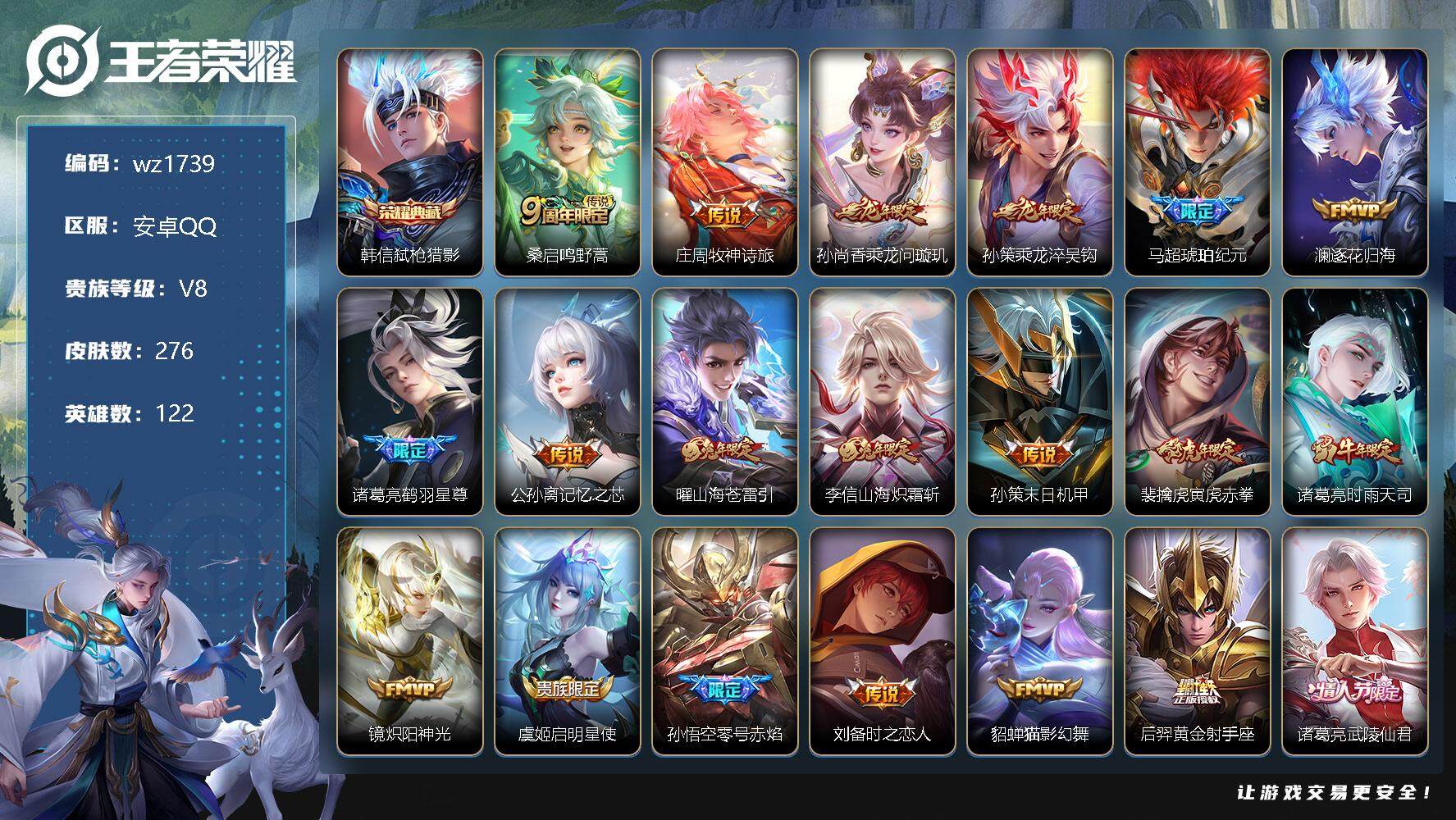【游戏多多】 【可二次实名】【wz1739】【商品标题】:安卓Q-V8-至尊星耀V段位-122英雄-276皮肤-1典藏-0珍品无双-0无双-0珍品传说-20传说-90史诗 【英雄全皮】:蒙恬全皮 【荣耀典藏】:韩信弑枪猎影 【传说皮肤】:桑启鸣野蒿,庄周牧神诗旅,孙尚香乘龙问璇玑,孙策乘龙淬吴钩,马超琥珀纪元,澜逐花归海,诸葛亮鹤羽星尊,公孙离记忆之芯,曜山海苍雷引,李信山海炽霜斩,孙策末日机甲,裴擒虎寅虎赤拳,诸葛亮时雨天司,镜炽阳神光,虞姬启明星使,孙悟空零号赤焰,刘备时之恋人,貂蝉猫影幻舞,后羿黄金射手座,诸葛亮武陵仙君 【限定皮肤】:姜子牙天穹之誓,李白谪仙醉月,狄仁杰阴阳师,赵云皇家上将,赵云引擎之心,赵云百木心枪,墨子神迹守卫,妲己时之彼端,嬴政优雅恋人,庄周高山流水,高渐离玩趣恶龙,钟无艳超时空战士,扁鹊奇幻香踪,芈月白晶晶,芈月幻夜卜梦,元歌云间偶戏,元歌无心,夏侯惇朔风刀,甄姬落雪兰心,典韦穷奇,马可波罗山海玄木吟,狄仁杰魔术师,狄仁杰万华元夜,达摩星际陆战队,达摩沙漠行僧,项羽海滩派对,老夫子醍醐杖,老夫子航海奇遇记,程咬金演武夺筹,露娜一生所爱,韩信傲雪梅枪,王昭君午后时光,兰陵王金庭之子,花木兰青春决赛季,亚瑟潮玩骑士王,孙悟空至尊宝,孙悟空零号赤焰,孙悟空孙行者,牛魔御旌,后羿圣弓游侠,李元芳云中旅人,虞姬启明星使,钟馗驱傩正仪,杨玉环遇见飞天,杨戬潮玩骑兵,干将莫邪冰霜恋舞曲,干将莫邪真爱魔法,雅典娜单词大作战,雅典娜黎明之约,蔡文姬繁星吟游,鬼谷子原初探秘者,鬼谷子五谷丰年,诸葛亮武陵仙君,诸葛亮时雨天司,诸葛亮鹤羽星尊,黄忠火炮绅士,苏烈千军破阵,百里玄策原初追逐者,百里守约朱雀志,弈星混沌棋,梦奇顽趣,沈梦溪大漠名商,明世隐疑决卦,裴擒虎李小龙,裴擒虎寅虎赤拳,裴擒虎擒涛扼浪,狂铁电玩高手,米莱狄御霄,米莱狄胡桃异想国,云中君纤云弄巧,李信山海炽霜斩,盾山御銮,上官婉儿梁祝,上官婉儿天狼绘梦者,嫦娥拒霜思,嫦娥暖冬兔眠,曜山海苍雷引,西施玲珑珍味,蒙犽狂想玩偶喵,鲁班大师探海日志,镜匿光追影者,桑启海盐诗旅,暃星界游侠,戈娅驭风魔法,艾琳流音漫舞,司空震地狱燃心,阿古朵江河有灵,张良古海寻踪,蒙犽百解令,蒙恬荣光圣徽,高渐离燃音魔法,妲己灵卜魔法,鬼谷子天穹祈灯,伽罗琥珀纪元,马超琥珀纪元,姬小满妄想食味,孙尚香乘龙问璇玑,孙策乘龙淬吴钩,沈梦溪龙舞盛年,刘邦剑破天穹,周瑜熔金海岸 【年限皮肤】:百里守约朱雀志,裴擒虎寅虎赤拳,诸葛亮时雨天司,马超神威,马可波罗山海玄木吟,李信山海炽霜斩,曜山海苍雷引,孙尚香乘龙问璇玑,孙策乘龙淬吴钩 【赛季限定】:夏侯惇朔风刀,典韦穷奇,狄仁杰万华元夜,达摩沙漠行僧,老夫子醍醐杖,程咬金演武夺筹,兰陵王金庭之子,张良古海寻踪,牛魔御旌,李元芳云中旅人,钟馗驱傩正仪,雅典娜黎明之约,鬼谷子原初探秘者,苏烈千军破阵,百里玄策原初追逐者,弈星混沌棋,梦奇顽趣,沈梦溪大漠名商,明世隐疑决卦,裴擒虎擒涛扼浪,米莱狄御霄,盾山御銮,鲁班大师探海日志,桑启海盐诗旅,鬼谷子天穹祈灯,蒙恬荣光圣徽,刘邦剑破天穹,姜子牙天穹之誓 【战令限定】:墨子神迹守卫,钟无艳超时空战士,扁鹊奇幻香踪,芈月幻夜卜梦,元歌云间偶戏,甄姬落雪兰心,达摩星际陆战队,老夫子航海奇遇记,王昭君午后时光,艾琳流音漫舞,亚瑟潮玩骑士王,后羿圣弓游侠,杨戬潮玩骑兵,干将莫邪真爱魔法,雅典娜单词大作战,黄忠火炮绅士,狂铁电玩高手,米莱狄胡桃异想国,嫦娥暖冬兔眠,西施玲珑珍味,蒙犽狂想玩偶喵,司空震地狱燃心,暃星界游侠,戈娅驭风魔法,高渐离燃音魔法,妲己灵卜魔法 【史诗皮肤】:鲁班七号电玩小子,项羽苍穹之光,赵云皇家上将,赵云未来纪元,貂蝉圣诞恋歌,甄姬冰雪圆舞曲,狄仁杰魔术师,宫本武藏鬼剑武藏,孙尚香水果甜心,嬴政优雅恋人,妲己魅力维加斯,妲己女仆咖啡,墨子金属风暴,李白千年之狐,吕布末日机甲,孙悟空至尊宝,赵云引擎之心,花木兰水晶猎龙者,刘邦德古拉伯爵,夏侯惇乘风破浪,兰陵王暗隐猎兽者,诸葛亮黄金分割率,亚瑟心灵战警,雅典娜冰冠公主,安琪拉心灵骇客,花木兰青春决赛季,百里守约特工魅影,蔡文姬舞动绿茵,李元芳逐浪之夏,程咬金功夫厨神,阿轲节奏热浪,杨玉环遇见飞天,孙策猫狗日记,大乔猫狗日记,百里守约朱雀志,干将莫邪冰霜恋舞曲,露娜一生所爱,狄仁杰鹰眼统帅,公孙离无限星赏官,上官婉儿梁祝,蔡文姬繁星吟游,娜可露露晚萤,妲己时之彼端,大乔白蛇,小乔青蛇,不知火舞魅语,橘右京修罗,马超神威,上官婉儿天狼绘梦者,蒙犽狂想玩偶喵,百里玄策原初追逐者,裴擒虎李小龙,云中君纤云弄巧,元歌云间偶戏,芈月白晶晶,米莱狄胡桃异想国,老夫子航海奇遇记,干将莫邪真爱魔法,安琪拉时之奇旅,孙悟空孙行者,庄周高山流水,司马懿暗渊魔法,嫦娥拒霜思,镜匿光追影者,