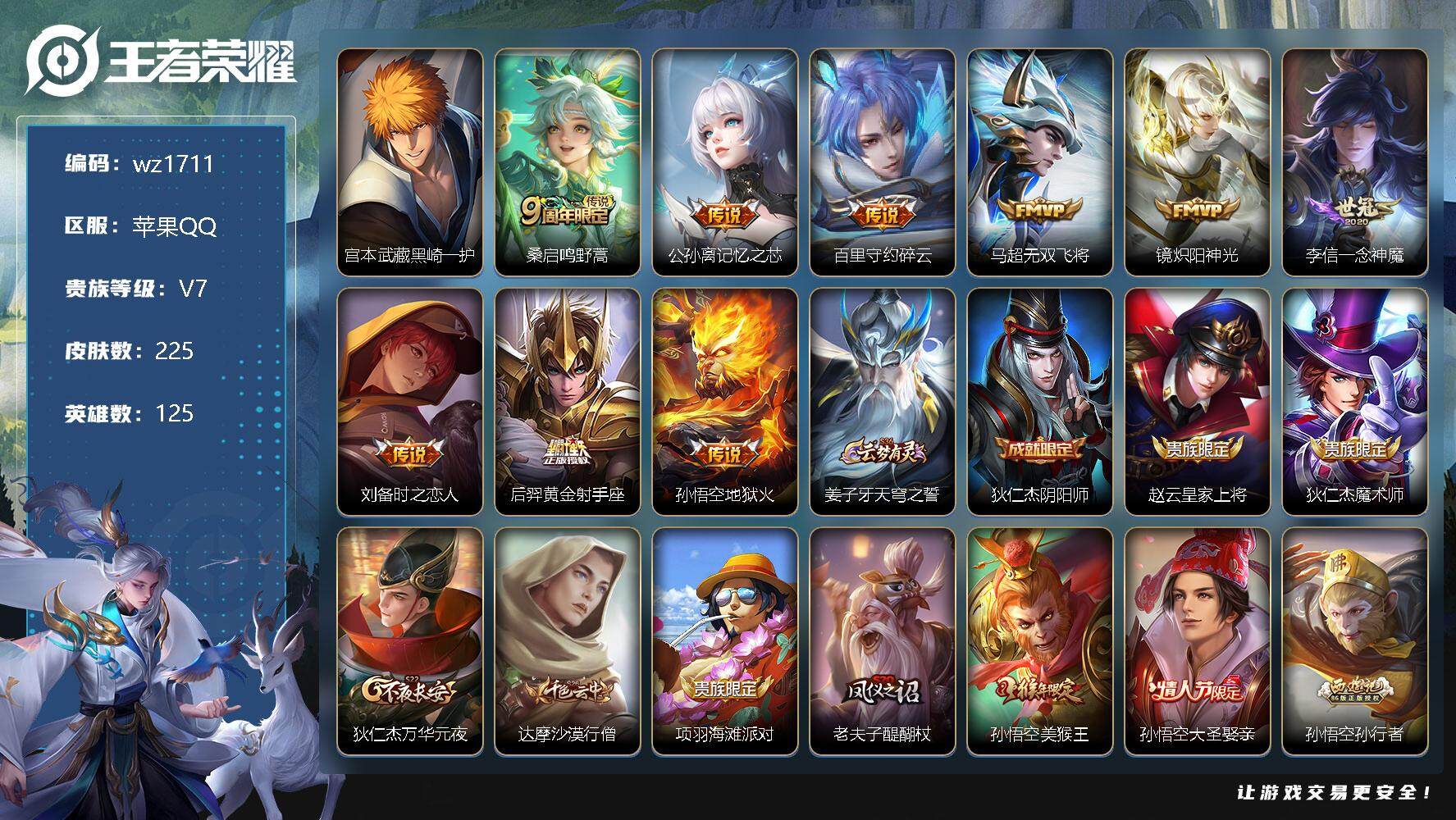 【游戏多多】 【可二次实名】【wz1711】【商品标题】:苹果Q-V7-最强王者段位-125英雄-225皮肤-0典藏-0珍品无双-0无双-1珍品传说-9传说-47史诗 【英雄全皮】:影全皮 【珍品传说】:宫本武藏黑崎一护 【传说皮肤】:桑启鸣野蒿,公孙离记忆之芯,百里守约碎云,马超无双飞将,镜炽阳神光,李信一念神魔,刘备时之恋人,后羿黄金射手座,孙悟空地狱火 【限定皮肤】:姜子牙天穹之誓,狄仁杰阴阳师,赵云皇家上将,狄仁杰魔术师,狄仁杰万华元夜,达摩沙漠行僧,项羽海滩派对,老夫子醍醐杖,孙悟空美猴王,孙悟空大圣娶亲,孙悟空孙行者,牛魔御旌,李元芳云中旅人,钟馗驱傩正仪,鬼谷子原初探秘者,苏烈千军破阵,百里玄策原初追逐者,弈星混沌棋,沈梦溪星空之诺,沈梦溪大漠名商,明世隐疑决卦,裴擒虎李小龙,裴擒虎擒涛扼浪,米莱狄御霄,云中君纤云弄巧,盾山御銮,上官婉儿梁祝,嫦娥拒霜思,西施玲珑珍味,鲁班大师探海日志,桑启海盐诗旅,戈娅驭风魔法,艾琳流音漫舞,司空震地狱燃心,张良古海寻踪,蒙犽百解令,高渐离燃音魔法,妲己灵卜魔法,鬼谷子天穹祈灯,伽罗琥珀纪元,姬小满妄想食味,沈梦溪龙舞盛年,李元芳蔬乡物语,刘邦剑破天穹,周瑜熔金海岸 【年限皮肤】:孙悟空美猴王 【赛季限定】:狄仁杰万华元夜,达摩沙漠行僧,老夫子醍醐杖,张良古海寻踪,牛魔御旌,李元芳云中旅人,钟馗驱傩正仪,鬼谷子原初探秘者,苏烈千军破阵,百里玄策原初追逐者,弈星混沌棋,沈梦溪大漠名商,明世隐疑决卦,裴擒虎擒涛扼浪,米莱狄御霄,盾山御銮,鲁班大师探海日志,桑启海盐诗旅,鬼谷子天穹祈灯,刘邦剑破天穹,姜子牙天穹之誓 【战令限定】:艾琳流音漫舞,沈梦溪星空之诺,西施玲珑珍味,司空震地狱燃心,戈娅驭风魔法,高渐离燃音魔法,妲己灵卜魔法,李元芳蔬乡物语 【史诗皮肤】:露娜紫霞仙子,赵云皇家上将,貂蝉圣诞恋歌,甄姬冰雪圆舞曲,狄仁杰魔术师,宫本武藏鬼剑武藏,孙尚香水果甜心,嬴政摇滚巨星,妲己魅力维加斯,妲己女仆咖啡,吕布圣诞狂欢,刘禅绅士熊喵,李白千年之狐,花木兰水晶猎龙者,刘邦德古拉伯爵,兰陵王暗隐猎兽者,亚瑟心灵战警,安琪拉心灵骇客,百里守约特工魅影,铠曙光守护者,程咬金功夫厨神,白起星夜王子,孙悟空大圣娶亲,狄仁杰鹰眼统帅,上官婉儿梁祝,橘右京修罗,百里玄策原初追逐者,裴擒虎李小龙,云中君纤云弄巧,钟馗乐园奇幻夜,孙悟空孙行者,嫦娥拒霜思,戈娅驭风魔法,司空震地狱燃心,蒙犽百解令,妲己灵卜魔法,高渐离燃音魔法,伽罗琥珀纪元,姬小满妄想食味,亚连破空之剑,百里守约百相守梦,孙膑茶境仙,狄仁杰绮世丹青,阿轲化蝶舞,刘禅鸭鸭历险记,狂铁龙之律动,周瑜百相守梦,黄忠百相守梦 【其他皮肤】:项羽海滩派对,韩信教廷特使,韩信街头霸王,露娜哥特玫瑰,阿轲爱心护理,达摩大发明家,赵云白执事,赵云忍炎影,芈月红桃皇后,白起白色死神,牛魔西部大镖客,宫本武藏未来纪元,安琪拉玩偶对对碰,姜子牙时尚教父,妲己少女阿狸,典韦黄金武士,亚瑟死亡骑士,达摩拳王,孙悟空美猴王,花木兰兔女郎,甄姬花好人间,刘备万事如意,宫本武藏万象初新,后羿阿尔法小队,狄仁杰阴阳师,刘备汉昭烈帝,关羽龙腾万里,钟无艳海滩丽影,宫本武藏霸王丸,王昭君幻想奇妙夜,狂铁命运角斗场,老夫子功夫老勺,孙尚香沉稳之力,诸葛亮掌控之力,鬼谷子幻乐之宴,大乔守护之力,米莱狄御霄,明世隐虹云星官,牛魔御旌,吕布野性能量,盾山御銮,沈梦溪鲨炮海盗猫,沈梦溪星空之诺,弈星混沌棋,哪吒次元突破,明世隐疑决卦,老夫子醍醐杖,狂铁特工战影,鬼谷子原初探秘者,狄仁杰万华元夜,刘禅秘密基地,钟馗驱傩正仪,苏烈千军破阵,达摩沙漠行僧,程咬金无双福将,沈梦溪大漠名商,蒙恬蔚蓝守将,李元芳云中旅人,桑启海盐诗旅,猪八戒潮玩探月行,赵怀真太极少年,裴擒虎擒涛扼浪,太乙真人劲辣红锅,鲁班大师探海日志,西施玲珑珍味,李元芳妄想特派,艾琳流音漫舞,张良古海寻踪,后羿完美运算,程咬金暖冬絮语,鬼谷子天穹祈灯,妲己灵卜魔法,海诺时空谍影,朵莉亚金色潮汐,廉颇功夫炙烤,沈梦溪龙舞盛年,李元芳蔬乡物语,刘邦剑破天穹,盘古经纬探寻者,姜子牙天穹之誓,周瑜熔金海岸,孙悟空神迹守卫,盘古敬我三分,东皇太一噬灭天穹,老夫子百相守梦,干将莫邪雾都夜雨,吕布逐霄战戟,苍苍林狼骑,太乙真人谧流熔炉,典韦铁骨偃魂,马超访茗客,影魅影绮裳,西施雪境奇遇,姜子牙星梦巡礼,东皇太一金福满堂,明世隐景韶洛都,戈娅玫蓝誓约,刘备浪漫序章,钟馗虚灵犬护,沈梦溪鸭鸭历险记,苏烈春野闲踪,张良灵野札记,阿古朵布丁狗之约,露娜命运加冕,姬小满小满鸭,白起死霸装,甄姬逆浪荇歌,孙策百相守梦,庄周锦麟游梦,莱西奥踏浪烽翎,鲁班七号福禄兄弟,鲁班七号木偶奇遇记,项羽帝国元帅,露娜绯红之刃,貂蝉异域舞娘,花木兰剑舞者,老夫子潮流仙人,狄仁杰锦衣卫,曹操