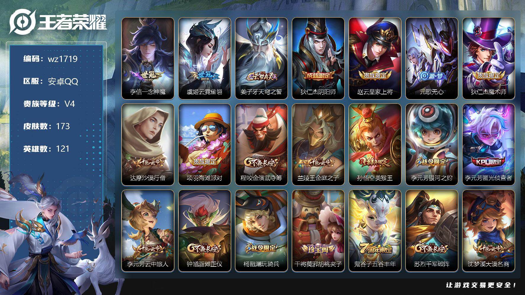 【游戏多多】 【可二次实名】【wz1719】【商品标题】:安卓Q-V4-永恒钻石II段位-121英雄-173皮肤-0典藏-0珍品无双-0无双-0珍品传说-2传说-33史诗 【传说皮肤】:李信一念神魔,虞姬云霓雀翎 【限定皮肤】:姜子牙天穹之誓,狄仁杰阴阳师,赵云皇家上将,元歌无心,狄仁杰魔术师,达摩沙漠行僧,项羽海滩派对,程咬金演武夺筹,兰陵王金庭之子,孙悟空美猴王,李元芳银河之约,李元芳匿光侦查者,李元芳云中旅人,钟馗驱傩正仪,杨戬潮玩骑兵,干将莫邪胡桃夹子,鬼谷子五谷丰年,苏烈千军破阵,沈梦溪大漠名商,裴擒虎擒涛扼浪,云中君纤云弄巧,嫦娥拒霜思,西施玲珑珍味,鲁班大师探海日志,桑启海盐诗旅,戈娅驭风魔法,艾琳流音漫舞,司空震地狱燃心,阿古朵江河有灵,张良古海寻踪,蒙犽百解令,鬼谷子天穹祈灯,沈梦溪龙舞盛年,刘邦剑破天穹,程咬金群星魔术团,镜青焰无极,项羽苍威无极,周瑜熔金海岸 【年限皮肤】:孙悟空美猴王 【赛季限定】:达摩沙漠行僧,程咬金演武夺筹,兰陵王金庭之子,张良古海寻踪,李元芳云中旅人,钟馗驱傩正仪,苏烈千军破阵,沈梦溪大漠名商,裴擒虎擒涛扼浪,鲁班大师探海日志,桑启海盐诗旅,鬼谷子天穹祈灯,刘邦剑破天穹,姜子牙天穹之誓 【战令限定】:艾琳流音漫舞,李元芳银河之约,杨戬潮玩骑兵,西施玲珑珍味,司空震地狱燃心,戈娅驭风魔法,镜青焰无极,项羽苍威无极 【史诗皮肤】:露娜紫霞仙子,赵云皇家上将,貂蝉圣诞恋歌,甄姬冰雪圆舞曲,狄仁杰魔术师,宫本武藏鬼剑武藏,孙尚香水果甜心,妲己魅力维加斯,墨子金属风暴,曹操幽灵船长,吕布末日机甲,张飞乱世虎臣,花木兰水晶猎龙者,兰陵王暗隐猎兽者,蔡文姬舞动绿茵,刘禅天才门将,狄仁杰鹰眼统帅,公孙离无限星赏官,李元芳银河之约,云中君纤云弄巧,嫦娥拒霜思,鬼谷子五谷丰年,元歌无心,刘禅电玩爆裂旋风,戈娅驭风魔法,百里守约真我赫兹,李元芳匿光侦查者,司空震地狱燃心,阿古朵江河有灵,蒙犽百解令,周瑜雪夜绮愿,镜青焰无极,亚连破空之剑 【其他皮肤】:项羽海滩派对,韩信教廷特使,韩信街头霸王,阿轲爱心护理,达摩大发明家,赵云白执事,赵云忍炎影,芈月红桃皇后,白起白色死神,扁鹊化身博士,安琪拉玩偶对对碰,孙膑天使之翼,妲己少女阿狸,典韦黄金武士,亚瑟死亡骑士,孙悟空美猴王,花木兰兔女郎,张飞五福同心,甄姬花好人间,刘备万事如意,狄仁杰阴阳师,刘备纽约教父,关羽龙腾万里,钟无艳海滩丽影,狂铁命运角斗场,老夫子功夫老勺,孙尚香沉稳之力,诸葛亮掌控之力,鬼谷子幻乐之宴,苏烈坚韧之力,明世隐虹云星官,小乔丁香结,吕布野性能量,孙膑归虚梦演,沈梦溪鲨炮海盗猫,姜子牙炽热元素使,哪吒次元突破,盾山圆桌骑士,狂铁特工战影,刘禅秘密基地,程咬金演武夺筹,张良缤纷绘卷,钟馗驱傩正仪,鲁班大师乓乓大师,苏烈千军破阵,干将莫邪胡桃夹子,达摩沙漠行僧,程咬金无双福将,兰陵王金庭之子,刘禅唤灵魔甲,沈梦溪大漠名商,蒙恬蔚蓝守将,李元芳云中旅人,桑启海盐诗旅,猪八戒潮玩探月行,白起乐园追猎者,赵怀真太极少年,裴擒虎擒涛扼浪,杨戬潮玩骑兵,太乙真人劲辣红锅,鲁班大师探海日志,西施玲珑珍味,姬小满零食大作战,李元芳妄想特派,哪吒热血海滩,艾琳流音漫舞,张良古海寻踪,钟无艳聚星闪耀,海月王牌新星,亚连破局者,兰陵王幻夜行动,曹操决胜大满贯,后羿完美运算,鬼谷子天穹祈灯,海诺时空谍影,嫦娥漠中幻影,廉颇功夫炙烤,沈梦溪龙舞盛年,钟无艳春野之旅,刘邦剑破天穹,程咬金群星魔术团,项羽苍威无极,姜子牙天穹之誓,周瑜熔金海岸,孙悟空神迹守卫,盘古敬我三分,东皇太一噬灭天穹,鲁班七号木偶奇遇记,高渐离金属狂潮,露娜绯红之刃,貂蝉异域舞娘,花木兰剑舞者,老夫子潮流仙人,张良一千零一夜,张良天堂福音,孙膑未来旅行,孙悟空西部大镖客,孙尚香火炮千金,周瑜海军大将,兰陵王隐刃,李白范海辛,钟馗地府判官,李元芳特种部队,蔡文姬蔷薇王座,夏侯惇战争骑士,马可波罗激情绿茵,哪吒三太子,诸葛亮星航指挥官,大乔伊势巫女,东皇太一东海龙王,干将莫邪第七人偶,铠龙域领主,百里守约绝影神枪,百里玄策威尼斯狂欢,梦奇美梦成真,女娲尼罗河女神,公孙离花间舞,杨玉环霓裳曲,元歌午夜歌剧院,孙策海之征途,司马懿魇语军师,沈梦溪棒球奇才,李信灼热之刃,上官婉儿修竹墨客,嫦娥露花倒影,猪八戒年年有余,盘古创世神祝,瑶森,云中君荷鲁斯之眼,曜归虚梦演,西施归虚梦演,鲁班大师归虚梦演,镜冰刃幻境,阿古朵熊喵少女,澜孤猎,云缨赤焰之缨,金蝉前尘,暃碧珀绯影 【内测皮肤】:狂铁特工战影,干将莫邪胡桃夹子 【营地ID】:1740608022