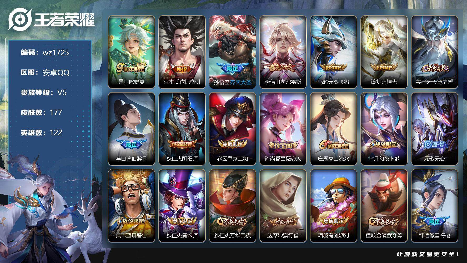 【游戏多多】 【可二次实名】【wz1725】【商品标题】:安卓Q-V5-永恒钻石III段位-122英雄-177皮肤-0典藏-0珍品无双-0无双-0珍品传说-6传说-54史诗 【传说皮肤】:桑启鸣野蒿,宫本武藏惊梅引,孙悟空齐天大圣,李信山海炽霜斩,马超无双飞将,镜炽阳神光 【限定皮肤】:姜子牙天穹之誓,李白谪仙醉月,狄仁杰阴阳师,赵云皇家上将,孙尚香蔷薇恋人,庄周高山流水,芈月幻夜卜梦,元歌无心,典韦蓝屏警告,狄仁杰魔术师,狄仁杰万华元夜,达摩沙漠行僧,项羽海滩派对,程咬金演武夺筹,韩信傲雪梅枪,兰陵王金庭之子,孙悟空齐天大圣,后羿圣弓游侠,李元芳云中旅人,钟馗驱傩正仪,干将莫邪真爱魔法,雅典娜黎明之约,鬼谷子原初探秘者,鬼谷子五谷丰年,黄忠火炮绅士,苏烈千军破阵,百里玄策原初追逐者,弈星混沌棋,沈梦溪大漠名商,明世隐疑决卦,裴擒虎李小龙,裴擒虎擒涛扼浪,云中君纤云弄巧,李信山海炽霜斩,嫦娥拒霜思,嫦娥暖冬兔眠,鲁班大师探海日志,桑启海盐诗旅,暃星界游侠,张良古海寻踪,高渐离燃音魔法,妲己灵卜魔法,鬼谷子天穹祈灯,姬小满妄想食味,沈梦溪龙舞盛年,刘邦剑破天穹,程咬金群星魔术团,镜青焰无极,项羽苍威无极,周瑜熔金海岸 【年限皮肤】:李信山海炽霜斩 【赛季限定】:狄仁杰万华元夜,达摩沙漠行僧,程咬金演武夺筹,兰陵王金庭之子,张良古海寻踪,李元芳云中旅人,钟馗驱傩正仪,雅典娜黎明之约,鬼谷子原初探秘者,苏烈千军破阵,百里玄策原初追逐者,弈星混沌棋,沈梦溪大漠名商,明世隐疑决卦,裴擒虎擒涛扼浪,鲁班大师探海日志,桑启海盐诗旅,鬼谷子天穹祈灯,刘邦剑破天穹,姜子牙天穹之誓 【战令限定】:芈月幻夜卜梦,典韦蓝屏警告,后羿圣弓游侠,干将莫邪真爱魔法,黄忠火炮绅士,嫦娥暖冬兔眠,暃星界游侠,高渐离燃音魔法,妲己灵卜魔法,镜青焰无极,项羽苍威无极 【史诗皮肤】:赵云皇家上将,赵云未来纪元,貂蝉圣诞恋歌,甄姬冰雪圆舞曲,王昭君偶像歌手,狄仁杰魔术师,廉颇地狱岩魂,宫本武藏鬼剑武藏,孙尚香蔷薇恋人,孙尚香水果甜心,嬴政摇滚巨星,妲己魅力维加斯,墨子金属风暴,吕布圣诞狂欢,曹操幽灵船长,李白千年之狐,吕布末日机甲,韩信白龙吟,花木兰水晶猎龙者,夏侯惇乘风破浪,小乔缤纷独角兽,兰陵王暗隐猎兽者,亚瑟心灵战警,安琪拉心灵骇客,百里守约特工魅影,铠曙光守护者,蔡文姬舞动绿茵,刘禅天才门将,李元芳逐浪之夏,孙策猫狗日记,典韦蓝屏警告,狄仁杰鹰眼统帅,娜可露露晚萤,橘右京修罗,百里玄策原初追逐者,裴擒虎李小龙,云中君纤云弄巧,百里玄策热力回旋,干将莫邪真爱魔法,庄周高山流水,嫦娥拒霜思,黄忠火炮绅士,雅典娜黎明之约,韩信傲雪梅枪,澜赏金猎手,鬼谷子五谷丰年,元歌无心,暃星界游侠,刘禅电玩爆裂旋风,妲己灵卜魔法,高渐离燃音魔法,姬小满妄想食味,镜青焰无极,李白谪仙醉月,牛魔星界战将 【其他皮肤】:项羽海滩派对,韩信教廷特使,韩信街头霸王,露娜哥特玫瑰,达摩大发明家,赵云忍炎影,白起白色死神,牛魔西部大镖客,扁鹊化身博士,孙膑天使之翼,妲己少女阿狸,亚瑟死亡骑士,花木兰兔女郎,张飞五福同心,甄姬花好人间,刘备万事如意,宫本武藏万象初新,后羿阿尔法小队,狄仁杰阴阳师,刘备纽约教父,关羽龙腾万里,钟无艳海滩丽影,老夫子功夫老勺,牛魔制霸全明星,孙尚香沉稳之力,诸葛亮掌控之力,李白敏锐之力,鬼谷子幻乐之宴,明世隐虹云星官,小乔丁香结,吕布野性能量,孙膑归虚梦演,沈梦溪鲨炮海盗猫,姜子牙炽热元素使,弈星混沌棋,哪吒次元突破,明世隐疑决卦,狂铁特工战影,鬼谷子原初探秘者,狄仁杰万华元夜,刘禅秘密基地,程咬金演武夺筹,张良缤纷绘卷,钟馗驱傩正仪,鲁班大师乓乓大师,苏烈千军破阵,后羿圣弓游侠,典韦铁甲之心,达摩沙漠行僧,芈月幻夜卜梦,程咬金无双福将,刘邦虎啸剑宗,兰陵王金庭之子,米莱狄契约魔法,沈梦溪大漠名商,蒙恬蔚蓝守将,李元芳云中旅人,桑启海盐诗旅,嫦娥暖冬兔眠,猪八戒潮玩探月行,牛魔牛运亨通,白起乐园追猎者,裴擒虎擒涛扼浪,太乙真人劲辣红锅,莱西奥西部游侠,鲁班大师探海日志,李元芳妄想特派,张良古海寻踪,钟无艳聚星闪耀,鬼谷子天穹祈灯,妲己灵卜魔法,廉颇功夫炙烤,沈梦溪龙舞盛年,钟无艳春野之旅,刘邦剑破天穹,程咬金群星魔术团,项羽苍威无极,姜子牙天穹之誓,周瑜熔金海岸,盘古敬我三分,东皇太一噬灭天穹,钟无艳生化警戒,王昭君精灵公主,狄仁杰锦衣卫,曹操超能战警,孙悟空西部大镖客,周瑜海军大将,钟馗地府判官,刘邦圣殿之光,虞姬加勒比小姐,蔡文姬蔷薇王座,雅典娜战争女神,马可波罗激情绿茵,杨戬埃及法老,太乙真人圆桌骑士,哪吒三太子,黄忠芝加哥教父,干将莫邪第七人偶,百里守约绝影神枪,百里玄策威尼斯狂欢,梦奇美梦成真,弈星踏雪寻梅,元歌午夜歌剧院,司马懿魇语军师,伽罗花见巫女,李信灼热之刃,嫦娥露花倒影