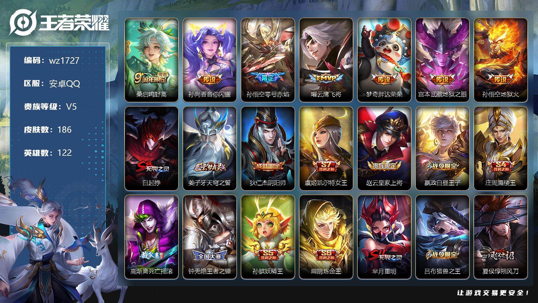 【游戏多多】 【可二次实名】【wz1727】【商品标题】:安卓Q-V5-永恒钻石V段位-122英雄-186皮肤-0典藏-0珍品无双-0无双-0珍品传说-7传说-36史诗 【传说皮肤】:桑启鸣野蒿,孙尚香音你闪耀,孙悟空零号赤焰,曜云鹰飞将,梦奇胖达荣荣,宫本武藏地狱之眼,孙悟空地狱火 【限定皮肤】:白起狰,姜子牙天穹之誓,狄仁杰阴阳师,虞姬凯尔特女王,赵云皇家上将,嬴政白昼王子,庄周蜃楼王,高渐离死亡摇滚,钟无艳王者之锤,孙膑妖精王,扁鹊炼金王,芈月重明,吕布猎兽之王,夏侯惇朔风刀,甄姬游园惊梦,曹操烛龙,典韦穷奇,典韦蓝屏警告,狄仁杰魔术师,狄仁杰万华元夜,达摩沙漠行僧,项羽海滩派对,老夫子醍醐杖,程咬金演武夺筹,兰陵王金庭之子,孙悟空零号赤焰,牛魔御旌,李元芳云中旅人,钟馗驱傩正仪,杨玉环遇见飞天,女娲朔望之晖,太乙真人饕餮,鬼谷子原初探秘者,苏烈千军破阵,弈星混沌棋,沈梦溪大漠名商,明世隐疑决卦,裴擒虎擒涛扼浪,狂铁御狮,米莱狄御霄,盾山御銮,鲁班大师探海日志,桑启海盐诗旅,艾琳女武神,鬼谷子天穹祈灯,沈梦溪龙舞盛年,鲁班七号蔬乡物语,李元芳蔬乡物语,刘邦剑破天穹,程咬金群星魔术团,镜青焰无极,项羽苍威无极,周瑜熔金海岸 【赛季限定】:庄周蜃楼王,孙膑妖精王,扁鹊炼金王,白起狰,芈月重明,夏侯惇朔风刀,曹操烛龙,典韦穷奇,狄仁杰万华元夜,达摩沙漠行僧,老夫子醍醐杖,程咬金演武夺筹,兰陵王金庭之子,牛魔御旌,李元芳云中旅人,虞姬凯尔特女王,钟馗驱傩正仪,太乙真人饕餮,鬼谷子原初探秘者,苏烈千军破阵,弈星混沌棋,沈梦溪大漠名商,明世隐疑决卦,裴擒虎擒涛扼浪,狂铁御狮,米莱狄御霄,盾山御銮,鲁班大师探海日志,桑启海盐诗旅,鬼谷子天穹祈灯,刘邦剑破天穹,姜子牙天穹之誓 【战令限定】:嬴政白昼王子,吕布猎兽之王,典韦蓝屏警告,女娲朔望之晖,鲁班七号蔬乡物语,李元芳蔬乡物语,镜青焰无极,项羽苍威无极 【史诗皮肤】:项羽苍穹之光,露娜紫霞仙子,钟无艳王者之锤,赵云皇家上将,赵云未来纪元,貂蝉圣诞恋歌,甄姬冰雪圆舞曲,王昭君偶像歌手,狄仁杰魔术师,宫本武藏鬼剑武藏,孙尚香水果甜心,嬴政暗夜贵公子,嬴政摇滚巨星,妲己魅力维加斯,妲己女仆咖啡,李白千年之狐,张飞乱世虎臣,花木兰水晶猎龙者,刘邦德古拉伯爵,夏侯惇乘风破浪,小乔缤纷独角兽,甄姬游园惊梦,亚瑟心灵战警,雅典娜冰冠公主,百里守约特工魅影,程咬金功夫厨神,白起星夜王子,杨玉环遇见飞天,嬴政白昼王子,孙策猫狗日记,典韦蓝屏警告,狄仁杰鹰眼统帅,公孙离无限星赏官,鲁班七号蔬乡物语,镜青焰无极,黄忠怒海争锋 【其他皮肤】:项羽海滩派对,韩信教廷特使,韩信街头霸王,阿轲致命风华,阿轲爱心护理,赵云白执事,赵云忍炎影,芈月红桃皇后,艾琳女武神,程咬金爱与正义,白起白色死神,扁鹊化身博士,姜子牙时尚教父,妲己少女阿狸,亚瑟死亡骑士,花木兰兔女郎,张飞五福同心,甄姬花好人间,刘备万事如意,宫本武藏万象初新,狄仁杰阴阳师,庄周蜃楼王,刘备纽约教父,高渐离死亡摇滚,孙膑妖精王,扁鹊炼金王,关羽龙腾万里,虞姬凯尔特女王,墨子进击墨子号,白起狰,钟无艳海滩丽影,太乙真人饕餮,宫本武藏霸王丸,曹操烛龙,王昭君幻想奇妙夜,芈月重明,老夫子功夫老勺,牛魔制霸全明星,孙尚香沉稳之力,典韦穷奇,鬼谷子幻乐之宴,狂铁御狮,安琪拉如懿,苏烈坚韧之力,大乔守护之力,项羽科学大爆炸,米莱狄御霄,吕布猎兽之王,明世隐虹云星官,张良幽兰居士,牛魔御旌,女娲朔望之晖,吕布野性能量,盾山御銮,孙膑归虚梦演,沈梦溪鲨炮海盗猫,姜子牙炽热元素使,夏侯惇朔风刀,弈星混沌棋,哪吒次元突破,鲁班七号黑桃队长,明世隐疑决卦,老夫子醍醐杖,鬼谷子原初探秘者,狄仁杰万华元夜,刘禅秘密基地,程咬金演武夺筹,张良缤纷绘卷,钟馗驱傩正仪,苏烈千军破阵,达摩沙漠行僧,程咬金无双福将,兰陵王金庭之子,沈梦溪大漠名商,李元芳云中旅人,桑启海盐诗旅,猪八戒潮玩探月行,裴擒虎擒涛扼浪,鲁班大师探海日志,鬼谷子天穹祈灯,廉颇功夫炙烤,沈梦溪龙舞盛年,钟无艳春野之旅,李元芳蔬乡物语,刘邦剑破天穹,程咬金群星魔术团,项羽苍威无极,大司命暗都幽影,姜子牙天穹之誓,周瑜熔金海岸,盘古敬我三分,东皇太一噬灭天穹,鲁班七号福禄兄弟,项羽帝国元帅,露娜绯红之刃,钟无艳生化警戒,花木兰剑舞者,老夫子潮流仙人,狄仁杰锦衣卫,曹操死神来了,小乔万圣前夜,孙悟空西部大镖客,周瑜海军大将,后羿精灵王,刘禅英喵野望,兰陵王隐刃,李白范海辛,钟馗地府判官,李元芳特种部队,虞姬加勒比小姐,关羽天启骑士,蔡文姬蔷薇王座,夏侯惇战争骑士,雅典娜战争女神,马可波罗激情绿茵,苍维京掠夺者,杨戬埃及法老,哪吒三太子,诸葛亮星航指挥官,黄忠芝加哥教父,大乔伊势巫女,东皇太一东海龙王,干将莫邪第七人偶,百里守约绝影神枪,百里玄策威