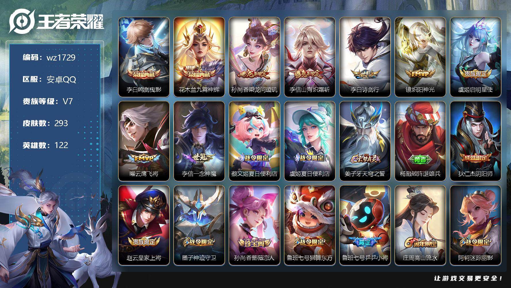 【游戏多多】 【可二次实名】【wz1729】【商品标题】:安卓Q-V7-永恒钻石II段位-122英雄-293皮肤-2典藏-0珍品无双-0无双-0珍品传说-7传说-101史诗 【英雄全皮】:刘邦全皮,李信全皮,猪八戒全皮,蒙恬全皮,海诺全皮 【荣耀典藏】:李白鸣剑曳影,花木兰九霄神辉 【传说皮肤】:孙尚香乘龙问璇玑,李信山海炽霜斩,李白诗剑行,镜炽阳神光,虞姬启明星使,曜云鹰飞将,李信一念神魔 【限定皮肤】:蔡文姬夏日便利店,虞姬夏日便利店,姜子牙天穹之誓,杨戬破阵退雄兵,狄仁杰阴阳师,赵云皇家上将,墨子神迹守卫,孙尚香蔷薇恋人,鲁班七号狮舞东方,鲁班七号乒乒小将,庄周高山流水,阿轲迷踪丽影,钟无艳超时空战士,白起夜都怪侠,芈月幻夜卜梦,吕布猎兽之王,周瑜赤莲之焰,元歌云间偶戏,元歌无心,夏侯惇朔风刀,甄姬落雪兰心,马可波罗暗影游猎,狄仁杰魔术师,狄仁杰万华元夜,达摩星际陆战队,达摩沙漠行僧,项羽海滩派对,老夫子醍醐杖,老夫子航海奇遇记,程咬金演武夺筹,刘邦夺宝奇兵,韩信逐梦之影,王昭君午后时光,兰陵王驯魔猎人,兰陵王金庭之子,亚瑟潮玩骑士王,孙悟空孙行者,牛魔御旌,后羿圣弓游侠,李元芳银河之约,李元芳云中旅人,虞姬启明星使,钟馗神迹守卫,钟馗驱傩正仪,女娲朔望之晖,干将莫邪冰霜恋舞曲,干将莫邪真爱魔法,雅典娜单词大作战,雅典娜黎明之约,蔡文姬繁星吟游,鬼谷子原初探秘者,鬼谷子五谷丰年,黄忠火炮绅士,苏烈玄武志,苏烈千军破阵,百里玄策原初追逐者,百里守约朱雀志,弈星混沌棋,梦奇顽趣,公孙离玉兔公主,沈梦溪星空之诺,沈梦溪大漠名商,明世隐疑决卦,明世隐吟游魔法,裴擒虎李小龙,裴擒虎擒涛扼浪,狂铁御狮,狂铁电玩高手,米莱狄御霄,米莱狄胡桃异想国,云中君纤云弄巧,李信山海炽霜斩,伽罗天狼溯光者,盾山御銮,猪八戒西部大镖客,猪八戒猪悟能,上官婉儿梁祝,嫦娥拒霜思,嫦娥暖冬兔眠,西施玲珑珍味,蒙犽狂想玩偶喵,鲁班大师探海日志,镜匿光追影者,桑启海盐诗旅,暃星界游侠,戈娅驭风魔法,艾琳女武神,艾琳流音漫舞,司空震地狱燃心,阿古朵江河有灵,张良古海寻踪,蒙犽百解令,蒙恬荣光圣徽,高渐离燃音魔法,妲己灵卜魔法,鬼谷子天穹祈灯,姬小满妄想食味,孙尚香乘龙问璇玑,沈梦溪龙舞盛年,鲁班七号蔬乡物语,李元芳蔬乡物语,刘邦剑破天穹,镜青焰无极,项羽苍威无极,海诺心动手记,刘备异域游侠 【年限皮肤】:百里守约朱雀志,苏烈玄武志,马超神威,李信山海炽霜斩,孙尚香乘龙问璇玑 【赛季限定】:夏侯惇朔风刀,狄仁杰万华元夜,达摩沙漠行僧,老夫子醍醐杖,程咬金演武夺筹,兰陵王金庭之子,张良古海寻踪,牛魔御旌,李元芳云中旅人,钟馗驱傩正仪,雅典娜黎明之约,鬼谷子原初探秘者,苏烈千军破阵,百里玄策原初追逐者,弈星混沌棋,梦奇顽趣,沈梦溪大漠名商,明世隐疑决卦,裴擒虎擒涛扼浪,狂铁御狮,米莱狄御霄,盾山御銮,鲁班大师探海日志,桑启海盐诗旅,鬼谷子天穹祈灯,蒙恬荣光圣徽,刘邦剑破天穹,姜子牙天穹之誓 【战令限定】:墨子神迹守卫,蔡文姬夏日便利店,虞姬夏日便利店,鲁班七号狮舞东方,阿轲迷踪丽影,钟无艳超时空战士,白起夜都怪侠,芈月幻夜卜梦,吕布猎兽之王,周瑜赤莲之焰,元歌云间偶戏,甄姬落雪兰心,马可波罗暗影游猎,达摩星际陆战队,老夫子航海奇遇记,刘邦夺宝奇兵,王昭君午后时光,兰陵王驯魔猎人,艾琳流音漫舞,亚瑟潮玩骑士王,后羿圣弓游侠,李元芳银河之约,钟馗神迹守卫,女娲朔望之晖,干将莫邪真爱魔法,雅典娜单词大作战,黄忠火炮绅士,沈梦溪星空之诺,明世隐吟游魔法,狂铁电玩高手,米莱狄胡桃异想国,猪八戒西部大镖客,嫦娥暖冬兔眠,西施玲珑珍味,蒙犽狂想玩偶喵,司空震地狱燃心,暃星界游侠,戈娅驭风魔法,高渐离燃音魔法,妲己灵卜魔法,鲁班七号蔬乡物语,李元芳蔬乡物语,镜青焰无极,项羽苍威无极 【史诗皮肤】:鲁班七号电玩小子,阿轲暗夜猫娘,赵云皇家上将,赵云未来纪元,貂蝉圣诞恋歌,甄姬冰雪圆舞曲,王昭君偶像歌手,狄仁杰魔术师,廉颇地狱岩魂,宫本武藏鬼剑武藏,孙尚香蔷薇恋人,孙尚香水果甜心,嬴政暗夜贵公子,嬴政摇滚巨星,妲己魅力维加斯,妲己女仆咖啡,墨子金属风暴,吕布圣诞狂欢,曹操幽灵船长,李白千年之狐,吕布末日机甲,张飞乱世虎臣,韩信白龙吟,花木兰水晶猎龙者,刘邦德古拉伯爵,韩信逐梦之影,夏侯惇乘风破浪,小乔缤纷独角兽,兰陵王暗隐猎兽者,诸葛亮黄金分割率,亚瑟心灵战警,安琪拉心灵骇客,百里守约特工魅影,铠曙光守护者,蔡文姬舞动绿茵,刘禅天才门将,李元芳逐浪之夏,程咬金功夫厨神,白起星夜王子,阿轲节奏热浪,孙策猫狗日记,大乔猫狗日记,百里守约朱雀志,干将莫邪冰霜恋舞曲,苏烈玄武志,鲁班七号狮舞东方,狄仁杰鹰眼统帅,公孙离无限星赏官,兰陵王驯魔猎人,上官婉儿梁祝,蔡文姬繁星吟游,李元芳银河之约,娜可露露晚萤,小乔青蛇,不