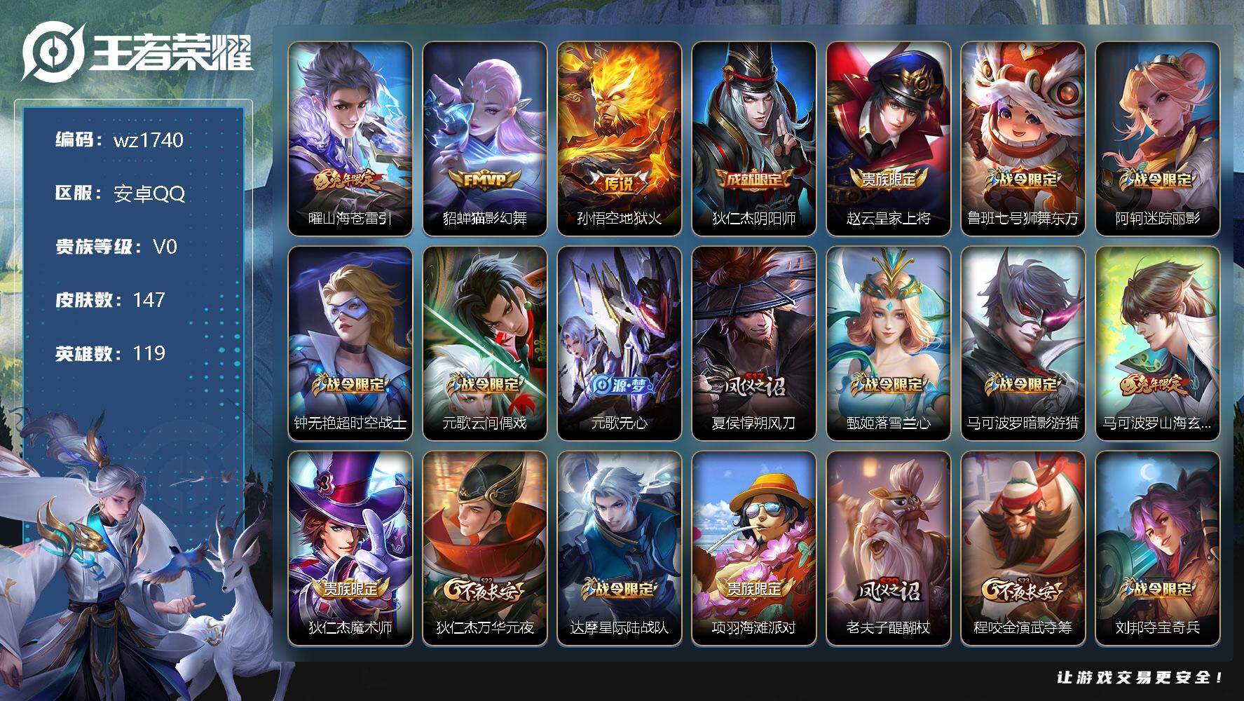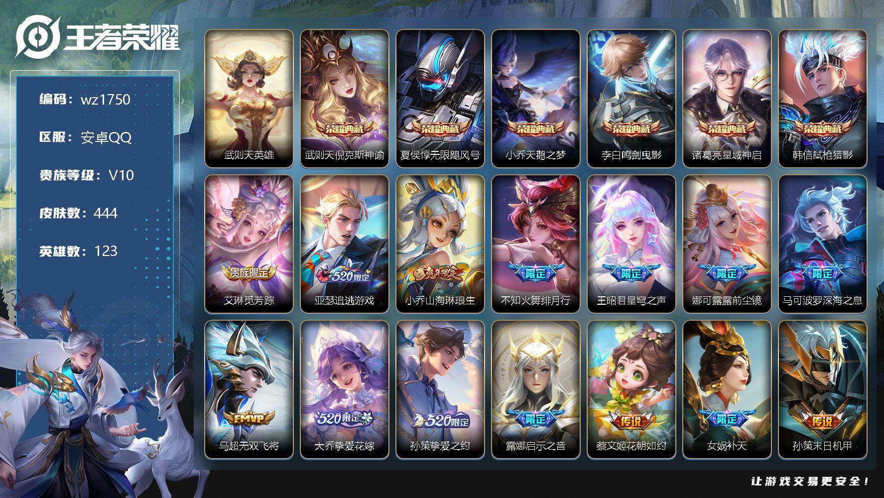 【游戏多多】 【可二次实名】【wz1750】【商品标题】:安卓Q-V10-至尊星耀I段位-123英雄-444皮肤-6典藏-0珍品无双-0无双-0珍品传说-47传说-162史诗 【英雄全皮】:刘邦全皮,娜可露露全皮,猪八戒全皮,鲁班大师全皮,影全皮 【荣耀典藏】:武则天英雄,武则天倪克斯神谕,夏侯惇无限飓风号,小乔天鹅之梦,李白鸣剑曳影,诸葛亮星域神启,韩信弑枪猎影 【传说皮肤】:艾琳觅芳踪,亚瑟追逃游戏,小乔山海琳琅生,不知火舞绯月行,王昭君星穹之声,娜可露露前尘镜,马可波罗深海之息,马超无双飞将,大乔挚爱花嫁,孙策挚爱之约,露娜启示之音,蔡文姬花朝如约,女娲补天,孙策末日机甲,瑶时之祈愿,裴擒虎寅虎赤拳,鲁班七号寅虎瑞焰,孙尚香异界灵契,貂蝉遇见胡旋,赵云淬星耀世,王昭君乞巧织情,西施游龙清影,曜李逍遥 ,周瑜音你心动,小乔音你心动,公孙离祈雪灵祝,诸葛亮时雨天司,镜炽阳神光,虞姬启明星使,李信一念神魔,伽罗太华,貂蝉猫影幻舞,干将莫邪久胜战神,虞姬云霓雀翎,百里玄策白虎志,花木兰冠军飞将,梦奇胖达荣荣,杨戬永曜之星,诸葛亮武陵仙君,貂蝉仲夏夜之梦,李白凤求凰,孙尚香末日机甲,宫本武藏地狱之眼,孙悟空地狱火,吕布天魔缭乱,武则天海洋之心,狄仁杰超时空战士 【限定皮肤】:白起狰,姜子牙天穹之誓,狄仁杰阴阳师,小乔纯白花嫁,虞姬凯尔特女王,小乔山海琳琅生,赵云皇家上将,赵云百木心枪,墨子神迹守卫,妲己热情桑巴,妲己时之彼端,妲己时之奇旅,嬴政优雅恋人,嬴政白昼王子,孙尚香蔷薇恋人,孙尚香异界灵契,鲁班七号狮舞东方,鲁班七号乒乒小将,鲁班七号寅虎瑞焰,庄周云端筑梦师,庄周玄嵩,庄周高山流水,高渐离死亡摇滚,阿轲迷踪丽影,钟无艳王者之锤,钟无艳超时空战士,孙膑妖精王,孙膑天狼运算者,孙膑寅虎展翼,扁鹊炼金王,扁鹊奇幻香踪,白起夜都怪侠,芈月重明,芈月白晶晶,芈月幻夜卜梦,吕布天魔缭乱,吕布猎兽之王,吕布御风骁将,周瑜真爱至上,周瑜赤莲之焰,元歌云间偶戏,元歌无心,夏侯惇朔风刀,夏侯惇匿光决锋者,甄姬女儿国国王,甄姬游园惊梦,甄姬落雪兰心,曹操烛龙,曹操天狼征服者,典韦穷奇,典韦蓝屏警告,典韦岱宗,马可波罗逐梦之星,马可波罗暗影游猎,马可波罗深海之息,马可波罗山海玄木吟,狄仁杰魔术师,狄仁杰万华元夜,达摩星际陆战队,达摩沙漠行僧,项羽海滩派对,项羽霸王别姬,老夫子圣诞老人,老夫子醍醐杖,老夫子航海奇遇记,关羽冰锋战神,貂蝉逐梦之音,貂蝉遇见胡旋,程咬金演武夺筹,露娜一生所爱,露娜启示之音,刘邦夺宝奇兵,韩信逐梦之影,韩信飞衡,韩信傲雪梅枪,王昭君凤凰于飞,王昭君午后时光,王昭君星穹之声,兰陵王驯魔猎人,兰陵王金庭之子,花木兰青春决赛季,花木兰默契交锋,不知火舞绯月行,娜可露露前尘镜,亚瑟潮玩骑士王,亚瑟追逃游戏,孙悟空美猴王,孙悟空至尊宝,孙悟空大圣娶亲,牛魔御旌,后羿辉光之辰,后羿如梦令,后羿圣弓游侠,李元芳银河之约,李元芳云中旅人,虞姬霸王别姬,虞姬启明星使,钟馗神迹守卫,钟馗驱傩正仪,杨玉环遇见飞天,杨玉环寅虎心曲,杨戬永曜之星,杨戬潮玩骑兵,女娲朔望之晖,女娲补天,哪吒逐梦之翼,干将莫邪冰霜恋舞曲,干将莫邪真爱魔法,雅典娜单词大作战,雅典娜黎明之约,蔡文姬奇迹圣诞,蔡文姬繁星吟游,太乙真人饕餮,太乙真人华丽摇滚,东皇太一逐梦之光,鬼谷子原初探秘者,鬼谷子五谷丰年,诸葛亮武陵仙君,诸葛亮时雨天司,大乔白鹤梁神女,大乔挚爱花嫁,黄忠火炮绅士,铠青龙志,苏烈千军破阵,百里玄策白虎志,百里玄策原初追逐者,百里守约朱雀志,弈星混沌棋,梦奇顽趣,公孙离蜜橘之夏,公孙离祈雪灵祝,公孙离玉兔公主,沈梦溪星空之诺,沈梦溪大漠名商,沈梦溪匿光破解者,明世隐疑决卦,明世隐吟游魔法,裴擒虎天狼狩猎者,裴擒虎李小龙,裴擒虎寅虎赤拳,裴擒虎擒涛扼浪,狂铁御狮,狂铁电玩高手,米莱狄御霄,米莱狄胡桃异想国,瑶时之祈愿,瑶山海碧波行,云中君纤云弄巧,云中君时之祈愿,伽罗太华,伽罗天狼溯光者,盾山御銮,孙策挚爱之约,猪八戒西部大镖客,猪八戒猪悟能,上官婉儿梁祝,上官婉儿天狼绘梦者,嫦娥如梦令,嫦娥拒霜思,嫦娥暖冬兔眠,曜李逍遥 ,蒙犽狂想玩偶喵,鲁班大师匿光启智者,鲁班大师探海日志,镜匿光追影者,桑启海盐诗旅,暃星界游侠,阿古朵江河有灵,张良古海寻踪,裴擒虎梅西,艾琳觅芳踪,蒙恬荣光圣徽,妲己灵卜魔法,鬼谷子天穹祈灯,刘邦剑破天穹,周瑜熔金海岸 【年限皮肤】:百里玄策白虎志,百里守约朱雀志,铠青龙志,孙悟空美猴王,裴擒虎寅虎赤拳,孙膑寅虎展翼,鲁班七号寅虎瑞焰,杨玉环寅虎心曲,王昭君凤凰于飞,李白凤求凰,杨戬永曜之星,后羿辉光之辰,公孙离祈雪灵祝,吕布御风骁将,诸葛亮时雨天司,伽罗太华,韩信飞衡,典韦岱宗,庄周玄嵩,马超神威,瑶山海碧波行,马可波罗山海玄木吟,小乔山海琳琅生 【赛季限定