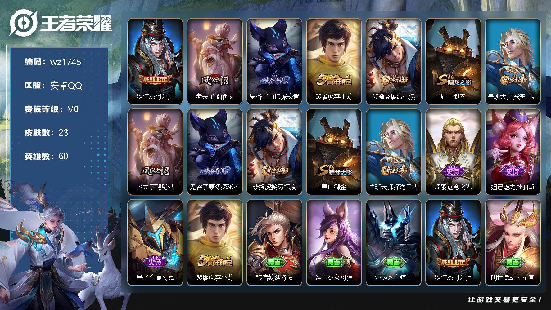 【游戏多多】 【可二次实名】【wz1745】【商品标题】:安卓Q-V0-荣耀黄金II段位-60英雄-23皮肤-0典藏-0珍品无双-0无双-0珍品传说-0传说-4史诗 【限定皮肤】:狄仁杰阴阳师,老夫子醍醐杖,鬼谷子原初探秘者,裴擒虎李小龙,裴擒虎擒涛扼浪,盾山御銮,鲁班大师探海日志 【赛季限定】:老夫子醍醐杖,鬼谷子原初探秘者,裴擒虎擒涛扼浪,盾山御銮,鲁班大师探海日志 【史诗皮肤】:项羽苍穹之光,妲己魅力维加斯,墨子金属风暴,裴擒虎李小龙 【其他皮肤】:韩信教廷特使,妲己少女阿狸,亚瑟死亡骑士,狄仁杰阴阳师,明世隐虹云星官,盾山御銮,老夫子醍醐杖,鬼谷子原初探秘者,裴擒虎擒涛扼浪,鲁班大师探海日志,李元芳妄想特派,鲁班七号福禄兄弟,项羽帝国元帅,狄仁杰锦衣卫,后羿精灵王,钟馗地府判官,裴擒虎街头旋风,盾山极冰防御线,伽罗花见巫女 【营地ID】:57637017