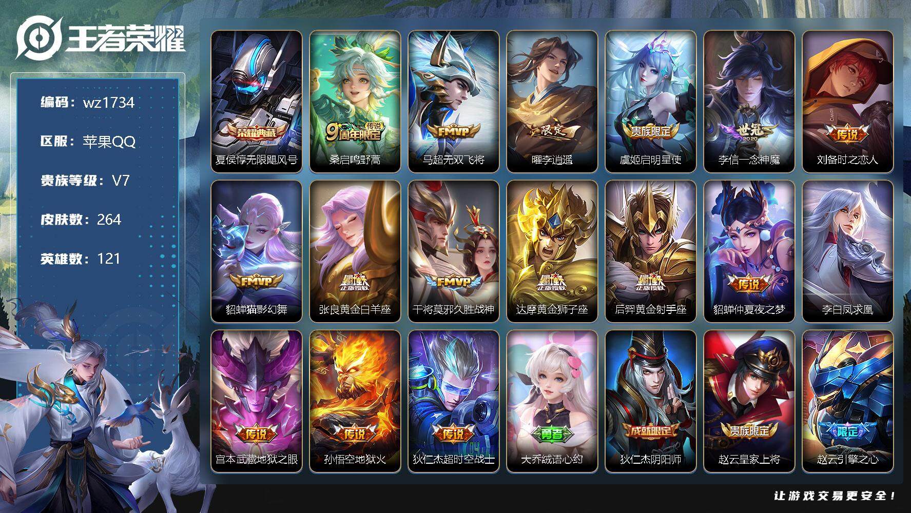 【游戏多多】 【可二次实名】【wz1734】【商品标题】:苹果Q-V7-尊贵铂金I段位-121英雄-264皮肤-1典藏-0珍品无双-0无双-0珍品传说-16传说-87史诗 【荣耀典藏】:夏侯惇无限飓风号 【传说皮肤】:桑启鸣野蒿,马超无双飞将,曜李逍遥 ,虞姬启明星使,李信一念神魔,刘备时之恋人,貂蝉猫影幻舞,张良黄金白羊座,干将莫邪久胜战神,达摩黄金狮子座,后羿黄金射手座,貂蝉仲夏夜之梦,李白凤求凰,宫本武藏地狱之眼,孙悟空地狱火,狄仁杰超时空战士 【限定皮肤】:大乔绒语心约,狄仁杰阴阳师,赵云皇家上将,赵云引擎之心,赵云龙胆,嬴政优雅恋人,嬴政白昼王子,鲁班七号狮舞东方,高渐离死亡摇滚,阿轲迷踪丽影,钟无艳超时空战士,扁鹊奇幻香踪,白起夜都怪侠,芈月重明,吕布猎兽之王,元歌云间偶戏,夏侯惇朔风刀,甄姬落雪兰心,曹操烛龙,典韦穷奇,典韦蓝屏警告,马可波罗暗影游猎,狄仁杰魔术师,狄仁杰万华元夜,达摩星际陆战队,达摩沙漠行僧,项羽海滩派对,老夫子醍醐杖,关羽冰锋战神,程咬金演武夺筹,露娜一生所爱,刘邦夺宝奇兵,韩信飞衡,兰陵王金庭之子,花木兰青春决赛季,亚瑟潮玩骑士王,孙悟空至尊宝,孙悟空大圣娶亲,牛魔御旌,李元芳银河之约,李元芳云中旅人,虞姬启明星使,钟馗神迹守卫,钟馗驱傩正仪,杨玉环遇见飞天,杨戬潮玩骑兵,女娲朔望之晖,雅典娜单词大作战,雅典娜黎明之约,太乙真人饕餮,鬼谷子原初探秘者,鬼谷子五谷丰年,黄忠烈魂,铠青龙志,苏烈千军破阵,百里玄策原初追逐者,百里守约朱雀志,弈星混沌棋,沈梦溪星空之诺,沈梦溪大漠名商,明世隐疑决卦,明世隐吟游魔法,裴擒虎天狼狩猎者,裴擒虎李小龙,裴擒虎擒涛扼浪,狂铁御狮,米莱狄御霄,米莱狄胡桃异想国,云中君纤云弄巧,盾山御銮,猪八戒西部大镖客,上官婉儿梁祝,嫦娥拒霜思,曜李逍遥 ,蒙犽狂想玩偶喵,鲁班大师探海日志,桑启海盐诗旅,艾琳女武神,张良古海寻踪,鬼谷子天穹祈灯,姬小满妄想食味,刘邦剑破天穹,镜青焰无极,项羽苍威无极,海诺心动手记 【年限皮肤】:百里守约朱雀志,铠青龙志,李白凤求凰,韩信飞衡,马超神威,黄忠烈魂,赵云龙胆 【赛季限定】:芈月重明,夏侯惇朔风刀,曹操烛龙,典韦穷奇,狄仁杰万华元夜,达摩沙漠行僧,老夫子醍醐杖,程咬金演武夺筹,兰陵王金庭之子,张良古海寻踪,牛魔御旌,李元芳云中旅人,钟馗驱傩正仪,雅典娜黎明之约,太乙真人饕餮,鬼谷子原初探秘者,苏烈千军破阵,百里玄策原初追逐者,弈星混沌棋,沈梦溪大漠名商,明世隐疑决卦,裴擒虎擒涛扼浪,狂铁御狮,米莱狄御霄,盾山御銮,鲁班大师探海日志,桑启海盐诗旅,鬼谷子天穹祈灯,刘邦剑破天穹 【战令限定】:嬴政白昼王子,鲁班七号狮舞东方,阿轲迷踪丽影,钟无艳超时空战士,扁鹊奇幻香踪,白起夜都怪侠,吕布猎兽之王,元歌云间偶戏,甄姬落雪兰心,典韦蓝屏警告,马可波罗暗影游猎,达摩星际陆战队,刘邦夺宝奇兵,亚瑟潮玩骑士王,李元芳银河之约,钟馗神迹守卫,杨戬潮玩骑兵,女娲朔望之晖,雅典娜单词大作战,沈梦溪星空之诺,明世隐吟游魔法,米莱狄胡桃异想国,猪八戒西部大镖客,蒙犽狂想玩偶喵,镜青焰无极,项羽苍威无极 【史诗皮肤】:项羽苍穹之光,赵云皇家上将,赵云未来纪元,貂蝉圣诞恋歌,甄姬冰雪圆舞曲,狄仁杰魔术师,廉颇地狱岩魂,宫本武藏鬼剑武藏,孙尚香水果甜心,嬴政优雅恋人,嬴政摇滚巨星,妲己魅力维加斯,妲己女仆咖啡,墨子金属风暴,吕布圣诞狂欢,刘禅绅士熊喵,曹操幽灵船长,李白千年之狐,吕布末日机甲,张飞乱世虎臣,韩信白龙吟,关羽冰锋战神,孙悟空至尊宝,赵云引擎之心,花木兰水晶猎龙者,刘邦德古拉伯爵,夏侯惇乘风破浪,小乔缤纷独角兽,兰陵王暗隐猎兽者,诸葛亮黄金分割率,亚瑟心灵战警,雅典娜冰冠公主,安琪拉心灵骇客,花木兰青春决赛季,百里守约特工魅影,铠曙光守护者,蔡文姬舞动绿茵,刘禅天才门将,李元芳逐浪之夏,程咬金功夫厨神,白起星夜王子,阿轲节奏热浪,杨玉环遇见飞天,嬴政白昼王子,孙策猫狗日记,铠青龙志,百里守约朱雀志,露娜一生所爱,孙悟空大圣娶亲,典韦蓝屏警告,伽罗箭羽风息,裴擒虎天狼狩猎者,鲁班七号狮舞东方,狄仁杰鹰眼统帅,公孙离无限星赏官,上官婉儿梁祝,李元芳银河之约,韩信飞衡,不知火舞魅语,阿轲迷踪丽影,橘右京修罗,马超神威,赵云龙胆,黄忠烈魂,孙尚香时之恋人,马可波罗暗影游猎,蒙犽狂想玩偶喵,百里玄策原初追逐者,裴擒虎李小龙,云中君纤云弄巧,元歌云间偶戏,米莱狄胡桃异想国,百里玄策热力回旋,司马懿暗渊魔法,嫦娥拒霜思,雅典娜黎明之约,夏洛特永昼,澜赏金猎手,明世隐吟游魔法,貂蝉唤灵魅影,钟无艳超时空战士,鬼谷子五谷丰年,扁鹊奇幻香踪,刘禅电玩爆裂旋风,姬小满妄想食味,镜青焰无极,海诺心动手记 【其他皮肤】:项羽海滩派对,韩信教廷特使,韩信街头霸王,露娜哥特玫瑰,达摩大发明家,赵云白执