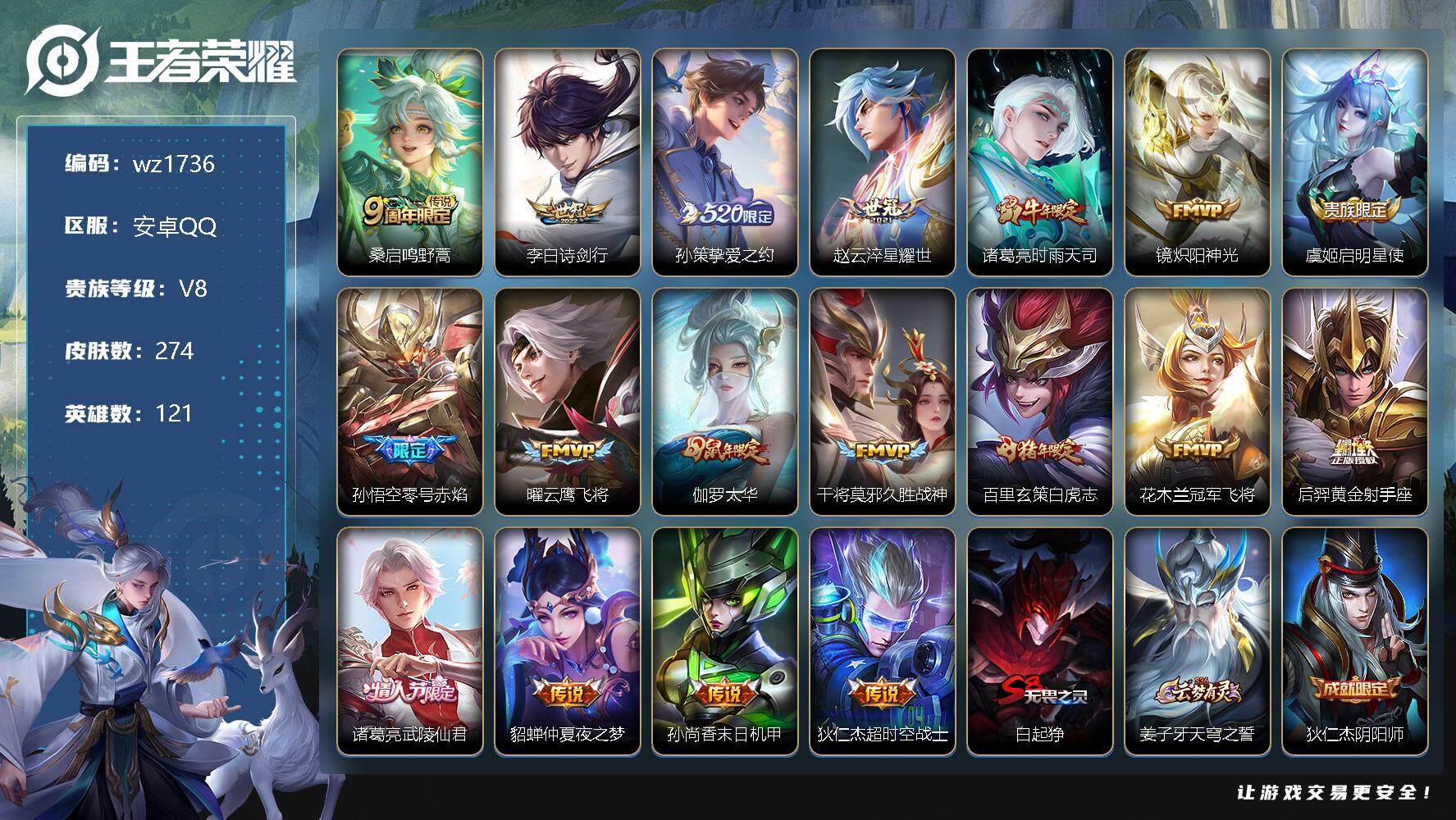 【游戏多多】 【可二次实名】【wz1736】【商品标题】:安卓Q-V8-最强王者段位-121英雄-274皮肤-0典藏-0珍品无双-0无双-0珍品传说-18传说-78史诗 【英雄全皮】:蒙恬全皮 【传说皮肤】:桑启鸣野蒿,李白诗剑行,孙策挚爱之约,赵云淬星耀世,诸葛亮时雨天司,镜炽阳神光,虞姬启明星使,孙悟空零号赤焰,曜云鹰飞将,伽罗太华,干将莫邪久胜战神,百里玄策白虎志,花木兰冠军飞将,后羿黄金射手座,诸葛亮武陵仙君,貂蝉仲夏夜之梦,孙尚香末日机甲,狄仁杰超时空战士 【限定皮肤】:白起狰,姜子牙天穹之誓,狄仁杰阴阳师,虞姬凯尔特女王,赵云皇家上将,墨子神迹守卫,嬴政白昼王子,鲁班七号狮舞东方,庄周高山流水,高渐离玩趣恶龙,孙膑妖精王,扁鹊炼金王,芈月重明,芈月幻夜卜梦,吕布猎兽之王,元歌云间偶戏,夏侯惇朔风刀,甄姬女儿国国王,曹操烛龙,典韦穷奇,马可波罗暗影游猎,马可波罗山海玄木吟,狄仁杰魔术师,狄仁杰万华元夜,达摩星际陆战队,达摩沙漠行僧,项羽海滩派对,老夫子醍醐杖,老夫子航海奇遇记,关羽冰锋战神,程咬金演武夺筹,韩信逐梦之影,王昭君午后时光,兰陵王金庭之子,花木兰青春决赛季,亚瑟潮玩骑士王,孙悟空大圣娶亲,孙悟空零号赤焰,孙悟空孙行者,牛魔御旌,后羿圣弓游侠,李元芳云中旅人,虞姬霸王别姬,虞姬启明星使,钟馗神迹守卫,钟馗驱傩正仪,杨玉环遇见飞天,女娲朔望之晖,干将莫邪冰霜恋舞曲,干将莫邪真爱魔法,雅典娜单词大作战,雅典娜黎明之约,蔡文姬繁星吟游,太乙真人饕餮,鬼谷子原初探秘者,诸葛亮武陵仙君,诸葛亮时雨天司,黄忠火炮绅士,铠青龙志,苏烈千军破阵,百里玄策白虎志,百里玄策原初追逐者,弈星混沌棋,沈梦溪大漠名商,明世隐疑决卦,裴擒虎李小龙,裴擒虎擒涛扼浪,狂铁御狮,米莱狄御霄,米莱狄胡桃异想国,云中君纤云弄巧,伽罗太华,伽罗天狼溯光者,孙策挚爱之约,猪八戒西部大镖客,上官婉儿梁祝,嫦娥拒霜思,嫦娥暖冬兔眠,蒙犽狂想玩偶喵,鲁班大师探海日志,桑启海盐诗旅,暃星界游侠,艾琳女武神,阿古朵江河有灵,张良古海寻踪,蒙恬荣光圣徽,鬼谷子天穹祈灯,刘邦剑破天穹 【年限皮肤】:百里玄策白虎志,铠青龙志,诸葛亮时雨天司,伽罗太华,马超神威,马可波罗山海玄木吟 【赛季限定】:孙膑妖精王,扁鹊炼金王,白起狰,芈月重明,夏侯惇朔风刀,曹操烛龙,典韦穷奇,狄仁杰万华元夜,达摩沙漠行僧,老夫子醍醐杖,程咬金演武夺筹,兰陵王金庭之子,张良古海寻踪,牛魔御旌,李元芳云中旅人,虞姬凯尔特女王,钟馗驱傩正仪,雅典娜黎明之约,太乙真人饕餮,鬼谷子原初探秘者,苏烈千军破阵,百里玄策原初追逐者,弈星混沌棋,沈梦溪大漠名商,明世隐疑决卦,裴擒虎擒涛扼浪,狂铁御狮,米莱狄御霄,鲁班大师探海日志,桑启海盐诗旅,鬼谷子天穹祈灯,蒙恬荣光圣徽,刘邦剑破天穹,姜子牙天穹之誓 【战令限定】:墨子神迹守卫,嬴政白昼王子,鲁班七号狮舞东方,芈月幻夜卜梦,吕布猎兽之王,元歌云间偶戏,马可波罗暗影游猎,达摩星际陆战队,老夫子航海奇遇记,王昭君午后时光,亚瑟潮玩骑士王,后羿圣弓游侠,钟馗神迹守卫,女娲朔望之晖,干将莫邪真爱魔法,雅典娜单词大作战,黄忠火炮绅士,米莱狄胡桃异想国,猪八戒西部大镖客,嫦娥暖冬兔眠,蒙犽狂想玩偶喵,暃星界游侠 【史诗皮肤】:鲁班七号电玩小子,露娜紫霞仙子,赵云皇家上将,貂蝉圣诞恋歌,甄姬冰雪圆舞曲,狄仁杰魔术师,廉颇地狱岩魂,宫本武藏鬼剑武藏,孙尚香水果甜心,嬴政暗夜贵公子,嬴政摇滚巨星,妲己女仆咖啡,墨子金属风暴,吕布圣诞狂欢,刘禅绅士熊喵,曹操幽灵船长,李白千年之狐,吕布末日机甲,张飞乱世虎臣,虞姬霸王别姬,关羽冰锋战神,花木兰水晶猎龙者,刘邦德古拉伯爵,韩信逐梦之影,夏侯惇乘风破浪,小乔缤纷独角兽,兰陵王暗隐猎兽者,诸葛亮黄金分割率,亚瑟心灵战警,安琪拉心灵骇客,花木兰青春决赛季,百里守约特工魅影,铠曙光守护者,蔡文姬舞动绿茵,刘禅天才门将,李元芳逐浪之夏,程咬金功夫厨神,白起星夜王子,阿轲节奏热浪,杨玉环遇见飞天,嬴政白昼王子,孙策猫狗日记,大乔猫狗日记,铠青龙志,干将莫邪冰霜恋舞曲,孙悟空大圣娶亲,伽罗箭羽风息,鲁班七号狮舞东方,狄仁杰鹰眼统帅,公孙离无限星赏官,上官婉儿梁祝,蔡文姬繁星吟游,娜可露露晚萤,不知火舞魅语,橘右京修罗,马超神威,马可波罗暗影游猎,蒙犽狂想玩偶喵,百里玄策原初追逐者,裴擒虎李小龙,云中君纤云弄巧,元歌云间偶戏,米莱狄胡桃异想国,老夫子航海奇遇记,伽罗天狼溯光者,干将莫邪真爱魔法,钟馗乐园奇幻夜,孙悟空孙行者,庄周高山流水,嫦娥拒霜思,黄忠火炮绅士,雅典娜黎明之约,甄姬女儿国国王,暃星界游侠,马可波罗山海玄木吟,刘禅电玩爆裂旋风,阿古朵江河有灵,蒙恬荣光圣徽 【其他皮肤】:项羽海滩派对,韩信教廷特使,韩信街头霸王,阿轲爱心护理,达摩大发明家,赵云白执事