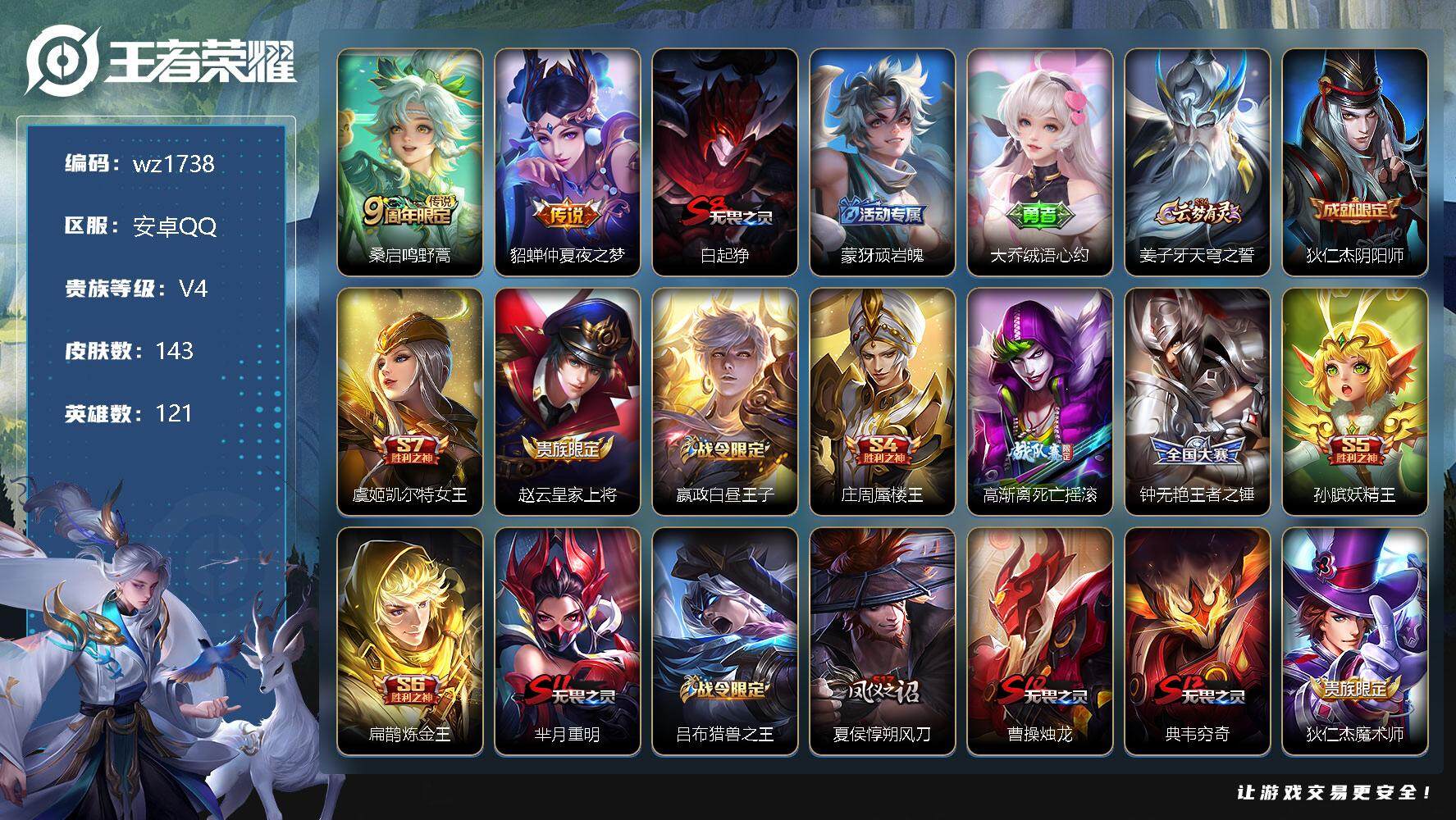 【游戏多多】 【可二次实名】【wz1738】【商品标题】:安卓Q-V4-至尊星耀IV段位-121英雄-143皮肤-0典藏-0珍品无双-0无双-0珍品传说-2传说-28史诗 【传说皮肤】:桑启鸣野蒿,貂蝉仲夏夜之梦 【限定皮肤】:白起狰,蒙犽顽岩魄,大乔绒语心约,姜子牙天穹之誓,狄仁杰阴阳师,虞姬凯尔特女王,赵云皇家上将,嬴政白昼王子,庄周蜃楼王,高渐离死亡摇滚,钟无艳王者之锤,孙膑妖精王,扁鹊炼金王,芈月重明,吕布猎兽之王,夏侯惇朔风刀,曹操烛龙,典韦穷奇,狄仁杰魔术师,狄仁杰万华元夜,项羽海滩派对,老夫子醍醐杖,程咬金演武夺筹,牛魔御旌,钟馗驱傩正仪,杨玉环遇见飞天,太乙真人饕餮,鬼谷子原初探秘者,百里玄策原初追逐者,弈星混沌棋,明世隐疑决卦,裴擒虎李小龙,狂铁御狮,米莱狄御霄,云中君纤云弄巧,盾山御銮,上官婉儿梁祝,艾琳女武神,张良古海寻踪,鬼谷子天穹祈灯,沈梦溪龙舞盛年,刘邦剑破天穹,周瑜熔金海岸 【赛季限定】:庄周蜃楼王,孙膑妖精王,扁鹊炼金王,白起狰,芈月重明,夏侯惇朔风刀,曹操烛龙,典韦穷奇,狄仁杰万华元夜,老夫子醍醐杖,程咬金演武夺筹,张良古海寻踪,牛魔御旌,虞姬凯尔特女王,钟馗驱傩正仪,太乙真人饕餮,鬼谷子原初探秘者,百里玄策原初追逐者,弈星混沌棋,明世隐疑决卦,狂铁御狮,米莱狄御霄,盾山御銮,鬼谷子天穹祈灯,刘邦剑破天穹,姜子牙天穹之誓 【战令限定】:嬴政白昼王子,吕布猎兽之王 【史诗皮肤】:露娜紫霞仙子,钟无艳王者之锤,赵云皇家上将,赵云未来纪元,貂蝉圣诞恋歌,甄姬冰雪圆舞曲,狄仁杰魔术师,宫本武藏鬼剑武藏,孙尚香水果甜心,妲己魅力维加斯,妲己女仆咖啡,墨子金属风暴,吕布圣诞狂欢,刘禅绅士熊喵,张飞乱世虎臣,安琪拉心灵骇客,李元芳逐浪之夏,白起星夜王子,阿轲节奏热浪,杨玉环遇见飞天,嬴政白昼王子,狄仁杰鹰眼统帅,上官婉儿梁祝,百里玄策原初追逐者,裴擒虎李小龙,云中君纤云弄巧,百里玄策热力回旋,蒙犽顽岩魄 【其他皮肤】:项羽海滩派对,韩信教廷特使,韩信街头霸王,阿轲爱心护理,达摩大发明家,赵云忍炎影,艾琳女武神,程咬金星际陆战队,扁鹊化身博士,妲己少女阿狸,典韦黄金武士,亚瑟死亡骑士,达摩拳王,花木兰兔女郎,张飞五福同心,狄仁杰阴阳师,庄周蜃楼王,刘备纽约教父,高渐离死亡摇滚,孙膑妖精王,扁鹊炼金王,关羽龙腾万里,虞姬凯尔特女王,白起狰,钟无艳海滩丽影,太乙真人饕餮,宫本武藏霸王丸,曹操烛龙,芈月重明,老夫子功夫老勺,典韦穷奇,李白敏锐之力,鬼谷子幻乐之宴,狂铁御狮,大乔守护之力,米莱狄御霄,吕布猎兽之王,明世隐虹云星官,张良幽兰居士,牛魔御旌,小乔丁香结,盾山御銮,孙膑归虚梦演,沈梦溪鲨炮海盗猫,姜子牙炽热元素使,夏侯惇朔风刀,弈星混沌棋,哪吒次元突破,鲁班七号黑桃队长,明世隐疑决卦,盾山圆桌骑士,老夫子醍醐杖,狂铁特工战影,鬼谷子原初探秘者,狄仁杰万华元夜,刘禅秘密基地,程咬金演武夺筹,钟馗驱傩正仪,鲁班大师乓乓大师,程咬金无双福将,刘禅唤灵魔甲,猪八戒潮玩探月行,莱西奥西部游侠,哪吒热血海滩,张良古海寻踪,后羿完美运算,鬼谷子天穹祈灯,廉颇功夫炙烤,沈梦溪龙舞盛年,钟无艳春野之旅,扁鹊无尽旅途,刘邦剑破天穹,貂蝉长夏之忆,姜子牙天穹之誓,周瑜熔金海岸,大乔绒语心约,盘古敬我三分,东皇太一噬灭天穹,貂蝉异域舞娘,花木兰剑舞者,狄仁杰锦衣卫,兰陵王隐刃,钟馗地府判官,蔡文姬蔷薇王座,雅典娜战争女神,马可波罗激情绿茵,苍维京掠夺者,杨戬埃及法老,诸葛亮星航指挥官,大乔伊势巫女,干将莫邪第七人偶,鬼谷子阿摩司公爵,铠龙域领主,百里守约绝影神枪,公孙离花间舞,裴擒虎街头旋风,弈星踏雪寻梅,元歌午夜歌剧院,盾山极冰防御线,沈梦溪棒球奇才,上官婉儿修竹墨客,盘古创世神祝,云中君荷鲁斯之眼,曜归虚梦演,马超幸存者,蒙犽归虚梦演,镜冰刃幻境,阿古朵熊喵少女,澜孤猎,司空震启蛰,云缨赤焰之缨,金蝉前尘,暃碧珀绯影 【内测皮肤】:艾琳女武神,狂铁特工战影 【营地ID】:92807045