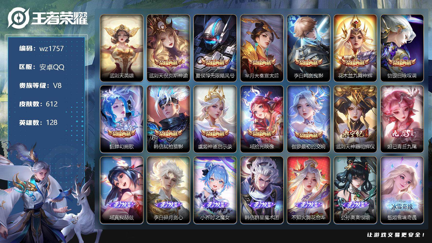 【游戏多多】 【可二次实名】【wz1757】【商品标题】:安卓Q-V8-永恒钻石II段位-128英雄-612皮肤-11典藏-0珍品无双-10无双-4珍品传说-110传说-215史诗 【英雄全皮】:阿轲全皮,扁鹊全皮,芈月全皮,李白全皮,狄仁杰全皮,武则天全皮,姜子牙全皮,艾琳全皮,不知火舞全皮,娜可露露全皮,橘右京全皮,刘备全皮,李元芳全皮,杨玉环全皮,苍全皮,哪吒全皮,鬼谷子全皮,大乔全皮,黄忠全皮,苏烈全皮,梦奇全皮,云中君全皮,李信全皮,盾山全皮,上官婉儿全皮,亚连全皮,嫦娥全皮,马超全皮,海月全皮,曜全皮,西施全皮,鲁班大师全皮,蒙恬全皮,澜全皮,镜全皮,夏洛特全皮,司空震全皮,金蝉全皮,赵怀真全皮,戈娅全皮,影全皮,海诺全皮,少司缘全皮 【荣耀典藏】:武则天英雄,武则天倪克斯神谕,夏侯惇无限飓风号,芈月大秦宣太后,李白鸣剑曳影,花木兰九霄神辉,铠银白咏叹调,貂蝉幻阙歌,韩信弑枪猎影,虞姬神鉴启示录,瑶拾光映像,伽罗最初的交响 【无双皮肤】:武则天神器明辉仪,妲己青丘九尾,瑶真我赫兹,李白碎月剑心,小乔时之魔女,韩信群星魔术团,不知火舞花合斗,公孙离离恨烟,甄姬雪境奇遇,曜器灵螭龙剑 【珍品传说】:马可波罗怪盗基德,鲁班七号江户川柯南,孙策时之奇旅,嫦娥器灵落星盏 【传说皮肤】:西施续相思,杨玉环星之鸣奏,司空震愿照山河定,女娲愿照千秋盛,妲己愿照众生和,澜愿照九州拓,蔡文姬愿照福禄聚,虞姬愿照岁时盈,云缨幻光神枪,裴擒虎祥瑞亨通,嬴政玄雷天君,王昭君映山客,桑启鸣野蒿,庄周牧神诗旅,夏侯惇霜北刀,铠冥王哈迪斯,朵莉亚心动手记,云中君群星魔术团,墨子黄金天蝎座,海月金乌负日,亚连落雪白狼,吕布曦玄引,貂蝉曦玄引,典韦战鼓燎原,孙尚香乘龙问璇玑,孙策乘龙淬吴钩,赵云乘龙铭钟鼎,马超琥珀纪元,铠琥珀纪元,澜逐花归海,艾琳觅芳踪,露娜霜月吟,孙膑小动物乐团,狄仁杰夜礼服假面,甄姬至美化雀舞,大乔时之奇旅,鲁班七号时之奇旅,兰陵王影龙天霄,吕布遇见神鼓,宫本武藏惊梅引,云缨鹤归松栖,上官婉儿妄想奇谈,马可波罗妄想实况,东皇太一灼幽烈阳,诸葛亮鹤羽星尊,澜电玩雷克斯,亚瑟追逃游戏,安琪拉追逃游戏,张飞百相守梦,公孙离记忆之芯,夏洛特浮生妄,干将莫邪画中仙,花木兰燃星之曲,伽罗炽翼辉光,孙悟空齐天大圣,曜山海苍雷引,李信山海炽霜斩,吕布怒海麟威,李白诗剑行,狄仁杰神器狴犴令,不知火舞绯月行,百里守约碎云,橘右京枫霜尽,娜可露露前尘镜,孙尚香音你闪耀,马超无双飞将,大乔挚爱花嫁,孙策挚爱之约,露娜启示之音,蔡文姬花朝如约,女娲补天,孙策末日机甲,瑶时之祈愿,裴擒虎寅虎赤拳,孙尚香异界灵契,赵云淬星耀世,王昭君乞巧织情,西施游龙清影,曜李逍遥 ,周瑜音你心动,小乔音你心动,李元芳飞鸢探春,公孙离祈雪灵祝,诸葛亮时雨天司,铠绛天战甲,镜炽阳神光,虞姬启明星使,孙悟空零号赤焰,曜云鹰飞将,李信一念神魔,刘备时之恋人,伽罗太华,貂蝉猫影幻舞,张良黄金白羊座,干将莫邪久胜战神,虞姬云霓雀翎,达摩黄金狮子座,百里玄策白虎志,花木兰冠军飞将,梦奇胖达荣荣,后羿黄金射手座,诸葛亮武陵仙君,貂蝉仲夏夜之梦,李白凤求凰,孙尚香末日机甲,宫本武藏地狱之眼,孙悟空地狱火,吕布天魔缭乱,武则天海洋之心,狄仁杰超时空战士 【限定皮肤】:白起狰,公孙离离恨烟,夏侯惇霜北刀,铠冥王哈迪斯,暃埋骨钱,蒙犽顽岩魄,蔡文姬夏日便利店,大乔绒语心约,虞姬夏日便利店,姜子牙天穹之誓,杨戬破阵退雄兵,李白谪仙醉月,狄仁杰阴阳师,虞姬凯尔特女王,廉颇寅虎御盾,赵云皇家上将,赵云引擎之心,赵云百木心枪,墨子神迹守卫,墨子降魔,嬴政白昼王子,孙尚香蔷薇恋人,孙尚香异界灵契,鲁班七号狮舞东方,鲁班七号时之奇旅,庄周云端筑梦师,庄周高山流水,高渐离死亡摇滚,阿轲迷踪丽影,钟无艳王者之锤,钟无艳超时空战士,孙膑寅虎展翼,扁鹊炼金王,扁鹊奇幻香踪,白起夜都怪侠,芈月重明,芈月白晶晶,芈月幻夜卜梦,吕布天魔缭乱,吕布御风骁将,吕布遇见神鼓,周瑜真爱至上,周瑜赤莲之焰,元歌无心,夏侯惇匿光决锋者,甄姬女儿国国王,甄姬落雪兰心,甄姬至美化雀舞,曹操烛龙,典韦穷奇,典韦蓝屏警告,典韦岱宗,马可波罗暗影游猎,马可波罗山海玄木吟,马可波罗妄想实况,狄仁杰魔术师,狄仁杰万华元夜,狄仁杰神器狴犴令,达摩沙漠行僧,项羽海滩派对,老夫子醍醐杖,老夫子航海奇遇记,关羽冰锋战神,关羽百相守梦,貂蝉逐梦之音,安琪拉魔法小厨娘,安琪拉追逃游戏,程咬金演武夺筹,露娜一生所爱,露娜启示之音,韩信飞衡,王昭君凤凰于飞,王昭君午后时光,兰陵王影龙天霄,兰陵王金庭之子,花木兰瑞麟志,花木兰默契交锋,花木兰燃星之曲,不知火舞绯月行,娜可露露前尘镜,橘右京枫霜尽,亚瑟追逃游戏,孙悟空至尊宝,孙悟空大圣娶亲,孙悟空零号赤焰,孙悟空孙行者,孙悟空齐天大圣,牛