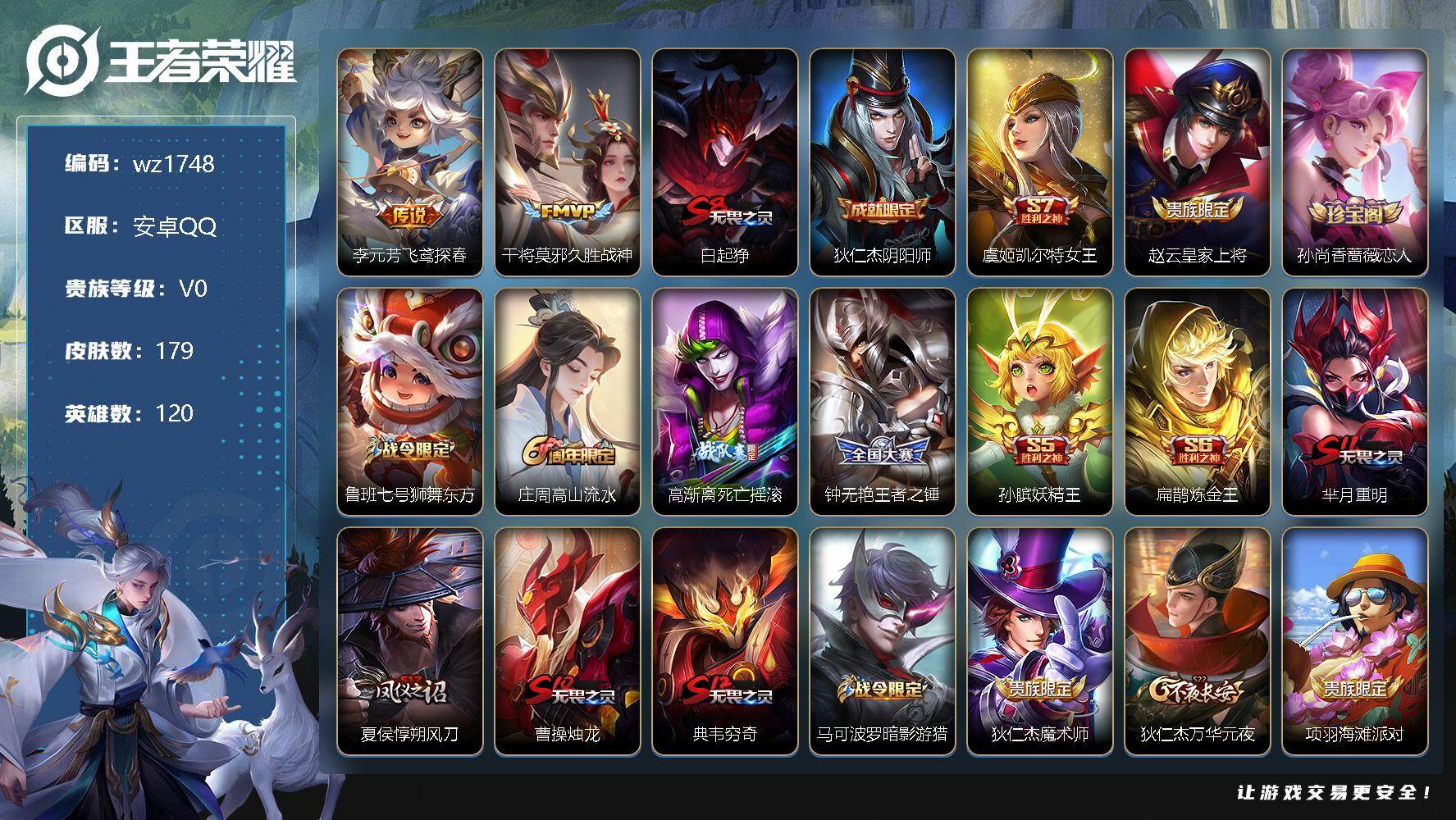 【游戏多多】 【可二次实名】【wz1748】【商品标题】:安卓Q-V0-最强王者段位-120英雄-179皮肤-0典藏-0珍品无双-0无双-0珍品传说-2传说-38史诗 【传说皮肤】:李元芳飞鸢探春,干将莫邪久胜战神 【限定皮肤】:白起狰,狄仁杰阴阳师,虞姬凯尔特女王,赵云皇家上将,孙尚香蔷薇恋人,鲁班七号狮舞东方,庄周高山流水,高渐离死亡摇滚,钟无艳王者之锤,孙膑妖精王,扁鹊炼金王,芈月重明,夏侯惇朔风刀,曹操烛龙,典韦穷奇,马可波罗暗影游猎,狄仁杰魔术师,狄仁杰万华元夜,项羽海滩派对,老夫子醍醐杖,关羽冰锋战神,程咬金演武夺筹,韩信飞衡,牛魔御旌,李元芳银河之约,钟馗神迹守卫,钟馗驱傩正仪,雅典娜单词大作战,雅典娜黎明之约,蔡文姬繁星吟游,太乙真人饕餮,太乙真人华丽摇滚,鬼谷子原初探秘者,百里玄策原初追逐者,弈星混沌棋,沈梦溪星空之诺,明世隐疑决卦,裴擒虎李小龙,裴擒虎擒涛扼浪,狂铁御狮,米莱狄御霄,云中君纤云弄巧,盾山御銮,猪八戒西部大镖客,蒙犽狂想玩偶喵,鲁班大师探海日志,桑启海盐诗旅,阿古朵江河有灵,张良古海寻踪,蒙犽百解令,鬼谷子天穹祈灯 【年限皮肤】:韩信飞衡 【赛季限定】:孙膑妖精王,扁鹊炼金王,白起狰,芈月重明,夏侯惇朔风刀,曹操烛龙,典韦穷奇,狄仁杰万华元夜,老夫子醍醐杖,程咬金演武夺筹,张良古海寻踪,牛魔御旌,虞姬凯尔特女王,钟馗驱傩正仪,雅典娜黎明之约,太乙真人饕餮,鬼谷子原初探秘者,百里玄策原初追逐者,弈星混沌棋,明世隐疑决卦,裴擒虎擒涛扼浪,狂铁御狮,米莱狄御霄,盾山御銮,鲁班大师探海日志,桑启海盐诗旅,鬼谷子天穹祈灯 【战令限定】:鲁班七号狮舞东方,马可波罗暗影游猎,李元芳银河之约,钟馗神迹守卫,雅典娜单词大作战,沈梦溪星空之诺,猪八戒西部大镖客,蒙犽狂想玩偶喵 【史诗皮肤】:钟无艳王者之锤,赵云皇家上将,狄仁杰魔术师,廉颇地狱岩魂,宫本武藏鬼剑武藏,孙尚香蔷薇恋人,孙尚香水果甜心,嬴政摇滚巨星,妲己魅力维加斯,墨子龙骑士,墨子金属风暴,吕布圣诞狂欢,曹操幽灵船长,李白千年之狐,关羽冰锋战神,花木兰水晶猎龙者,刘邦德古拉伯爵,夏侯惇乘风破浪,兰陵王暗隐猎兽者,安琪拉心灵骇客,铠曙光守护者,蔡文姬舞动绿茵,鲁班七号狮舞东方,狄仁杰鹰眼统帅,蔡文姬繁星吟游,李元芳银河之约,韩信飞衡,不知火舞魅语,橘右京修罗,马可波罗暗影游猎,蒙犽狂想玩偶喵,百里玄策原初追逐者,裴擒虎李小龙,云中君纤云弄巧,庄周高山流水,雅典娜黎明之约,阿古朵江河有灵,蒙犽百解令 【其他皮肤】:项羽海滩派对,韩信教廷特使,韩信街头霸王,露娜哥特玫瑰,阿轲致命风华,赵云忍炎影,芈月红桃皇后,程咬金爱与正义,白起白色死神,武则天东方不败,扁鹊化身博士,扁鹊救世之瞳,安琪拉玩偶对对碰,姜子牙时尚教父,妲己少女阿狸,亚瑟死亡骑士,达摩拳王,花木兰兔女郎,张飞五福同心,甄姬花好人间,刘备万事如意,宫本武藏万象初新,后羿阿尔法小队,狄仁杰阴阳师,刘备纽约教父,高渐离死亡摇滚,孙膑妖精王,刘备汉昭烈帝,扁鹊炼金王,关羽龙腾万里,虞姬凯尔特女王,白起狰,钟无艳海滩丽影,太乙真人饕餮,宫本武藏霸王丸,曹操烛龙,王昭君幻想奇妙夜,芈月重明,狂铁命运角斗场,老夫子功夫老勺,孙尚香沉稳之力,典韦穷奇,诸葛亮掌控之力,鬼谷子幻乐之宴,狂铁御狮,太乙真人华丽摇滚,苏烈坚韧之力,项羽科学大爆炸,米莱狄御霄,明世隐虹云星官,庄周奇妙博物学,牛魔御旌,小乔丁香结,钟馗神迹守卫,盾山御銮,孙膑归虚梦演,沈梦溪鲨炮海盗猫,姜子牙炽热元素使,夏侯惇朔风刀,沈梦溪星空之诺,弈星混沌棋,哪吒次元突破,明世隐疑决卦,盾山圆桌骑士,老夫子醍醐杖,猪八戒西部大镖客,廉颇无尽征程,鬼谷子原初探秘者,雅典娜单词大作战,狄仁杰万华元夜,刘禅秘密基地,程咬金演武夺筹,张良缤纷绘卷,钟馗驱傩正仪,鲁班大师乓乓大师,蒙恬蔚蓝守将,戈娅危途狂花,桑启海盐诗旅,裴擒虎擒涛扼浪,太乙真人劲辣红锅,鲁班大师探海日志,姬小满零食大作战,李元芳妄想特派,张良古海寻踪,鬼谷子天穹祈灯,东皇太一噬灭天穹,鲁班七号福禄兄弟,钟无艳生化警戒,貂蝉异域舞娘,花木兰剑舞者,老夫子潮流仙人,狄仁杰锦衣卫,张良一千零一夜,孙悟空西部大镖客,周瑜海军大将,后羿精灵王,兰陵王隐刃,钟馗地府判官,李元芳特种部队,刘邦圣殿之光,虞姬加勒比小姐,蔡文姬蔷薇王座,夏侯惇战争骑士,马可波罗激情绿茵,苍维京掠夺者,杨戬埃及法老,哪吒三太子,诸葛亮星航指挥官,黄忠芝加哥教父,东皇太一东海龙王,干将莫邪第七人偶,铠龙域领主,百里守约绝影神枪,百里玄策威尼斯狂欢,苏烈爱与和平,明世隐占星师,公孙离花间舞,杨玉环霓裳曲,裴擒虎街头旋风,元歌午夜歌剧院,孙策海之征途,司马懿魇语军师,伽罗花见巫女,沈梦溪棒球奇才,李信灼热之刃,上官婉儿修竹墨客,嫦娥露花倒影,猪八戒年年有余,