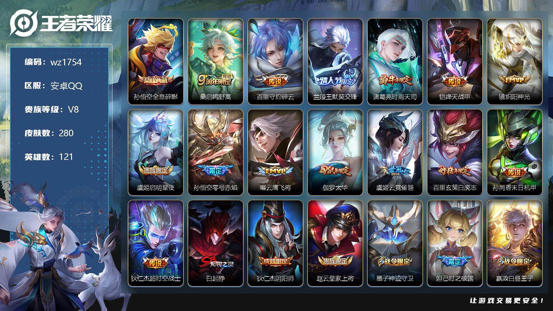 【游戏多多】 【可二次实名】【wz1754】【商品标题】:安卓Q-V8-永恒钻石IV段位-121英雄-280皮肤-1典藏-0珍品无双-0无双-0珍品传说-14传说-76史诗 【英雄全皮】:猪八戒全皮,蒙恬全皮 【荣耀典藏】:孙悟空全息碎影 【传说皮肤】:桑启鸣野蒿,百里守约碎云,兰陵王默契交锋,诸葛亮时雨天司,铠绛天战甲,镜炽阳神光,虞姬启明星使,孙悟空零号赤焰,曜云鹰飞将,伽罗太华,虞姬云霓雀翎,百里玄策白虎志,孙尚香末日机甲,狄仁杰超时空战士 【限定皮肤】:白起狰,狄仁杰阴阳师,赵云皇家上将,墨子神迹守卫,妲己时之彼端,嬴政白昼王子,鲁班七号狮舞东方,庄周云端筑梦师,庄周高山流水,高渐离死亡摇滚,高渐离玩趣恶龙,阿轲迷踪丽影,钟无艳超时空战士,芈月重明,吕布猎兽之王,吕布御风骁将,周瑜赤莲之焰,元歌云间偶戏,元歌无心,夏侯惇朔风刀,甄姬游园惊梦,甄姬落雪兰心,曹操烛龙,典韦穷奇,典韦蓝屏警告,马可波罗逐梦之星,马可波罗暗影游猎,狄仁杰魔术师,狄仁杰万华元夜,达摩星际陆战队,项羽海滩派对,老夫子醍醐杖,老夫子航海奇遇记,程咬金演武夺筹,刘邦夺宝奇兵,韩信飞衡,王昭君午后时光,兰陵王默契交锋,兰陵王驯魔猎人,兰陵王金庭之子,花木兰默契交锋,亚瑟潮玩骑士王,孙悟空大圣娶亲,孙悟空零号赤焰,牛魔御旌,牛魔奔雷神使,后羿辉光之辰,后羿如梦令,李元芳银河之约,李元芳云中旅人,虞姬霸王别姬,虞姬启明星使,钟馗神迹守卫,钟馗驱傩正仪,杨玉环遇见飞天,女娲朔望之晖,雅典娜单词大作战,雅典娜黎明之约,蔡文姬繁星吟游,太乙真人饕餮,太乙真人华丽摇滚,鬼谷子原初探秘者,鬼谷子五谷丰年,诸葛亮时雨天司,铠青龙志,苏烈千军破阵,百里玄策白虎志,百里玄策原初追逐者,弈星混沌棋,沈梦溪星空之诺,沈梦溪大漠名商,明世隐疑决卦,裴擒虎天狼狩猎者,裴擒虎李小龙,裴擒虎擒涛扼浪,狂铁御狮,狂铁电玩高手,米莱狄御霄,米莱狄胡桃异想国,云中君纤云弄巧,伽罗太华,盾山御銮,猪八戒西部大镖客,猪八戒猪悟能,上官婉儿梁祝,上官婉儿天狼绘梦者,蒙犽狂想玩偶喵,鲁班大师探海日志,桑启海盐诗旅,艾琳女武神,阿古朵江河有灵,张良古海寻踪,蒙恬荣光圣徽,鬼谷子天穹祈灯,沈梦溪龙舞盛年 【年限皮肤】:百里玄策白虎志,铠青龙志,后羿辉光之辰,吕布御风骁将,牛魔奔雷神使,诸葛亮时雨天司,伽罗太华,韩信飞衡 【赛季限定】:白起狰,芈月重明,夏侯惇朔风刀,曹操烛龙,典韦穷奇,狄仁杰万华元夜,老夫子醍醐杖,程咬金演武夺筹,兰陵王金庭之子,张良古海寻踪,牛魔御旌,李元芳云中旅人,钟馗驱傩正仪,雅典娜黎明之约,太乙真人饕餮,鬼谷子原初探秘者,苏烈千军破阵,百里玄策原初追逐者,弈星混沌棋,沈梦溪大漠名商,明世隐疑决卦,裴擒虎擒涛扼浪,狂铁御狮,米莱狄御霄,盾山御銮,鲁班大师探海日志,桑启海盐诗旅,鬼谷子天穹祈灯,蒙恬荣光圣徽 【战令限定】:墨子神迹守卫,嬴政白昼王子,鲁班七号狮舞东方,阿轲迷踪丽影,钟无艳超时空战士,吕布猎兽之王,周瑜赤莲之焰,元歌云间偶戏,甄姬落雪兰心,典韦蓝屏警告,马可波罗暗影游猎,达摩星际陆战队,老夫子航海奇遇记,刘邦夺宝奇兵,王昭君午后时光,兰陵王驯魔猎人,亚瑟潮玩骑士王,李元芳银河之约,钟馗神迹守卫,女娲朔望之晖,雅典娜单词大作战,沈梦溪星空之诺,狂铁电玩高手,米莱狄胡桃异想国,猪八戒西部大镖客,蒙犽狂想玩偶喵 【史诗皮肤】:项羽苍穹之光,阿轲暗夜猫娘,赵云皇家上将,赵云未来纪元,貂蝉圣诞恋歌,甄姬冰雪圆舞曲,王昭君偶像歌手,狄仁杰魔术师,廉颇地狱岩魂,宫本武藏鬼剑武藏,孙尚香水果甜心,嬴政暗夜贵公子,妲己魅力维加斯,妲己女仆咖啡,墨子金属风暴,吕布圣诞狂欢,曹操幽灵船长,李白千年之狐,张飞乱世虎臣,虞姬霸王别姬,花木兰水晶猎龙者,刘邦德古拉伯爵,夏侯惇乘风破浪,小乔缤纷独角兽,兰陵王暗隐猎兽者,诸葛亮黄金分割率,甄姬游园惊梦,马可波罗逐梦之星,亚瑟心灵战警,后羿辉光之辰,庄周云端筑梦师,百里守约特工魅影,铠曙光守护者,蔡文姬舞动绿茵,刘禅天才门将,李元芳逐浪之夏,程咬金功夫厨神,白起星夜王子,杨玉环遇见飞天,嬴政白昼王子,铠青龙志,孙悟空大圣娶亲,典韦蓝屏警告,伽罗箭羽风息,裴擒虎天狼狩猎者,鲁班七号狮舞东方,狄仁杰鹰眼统帅,兰陵王驯魔猎人,上官婉儿梁祝,蔡文姬繁星吟游,李元芳银河之约,韩信飞衡,妲己时之彼端,后羿如梦令,阿轲迷踪丽影,上官婉儿天狼绘梦者,马可波罗暗影游猎,蒙犽狂想玩偶喵,百里玄策原初追逐者,裴擒虎李小龙,云中君纤云弄巧,元歌云间偶戏,牛魔奔雷神使,吕布御风骁将,花木兰默契交锋,米莱狄胡桃异想国,老夫子航海奇遇记,猪八戒猪悟能,庄周高山流水,雅典娜黎明之约,狂铁电玩高手,钟无艳超时空战士,鬼谷子五谷丰年,元歌无心,阿古朵江河有灵,蒙恬荣光圣徽 【其他皮肤】:项羽海滩派对,韩信教廷