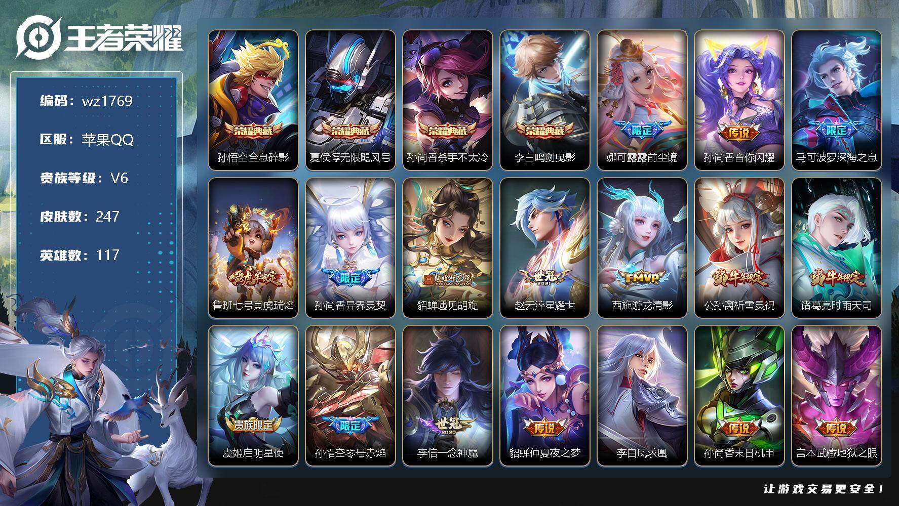 【游戏多多】 【可二次实名】【wz1769】【商品标题】:苹果Q-V6-尊贵铂金II段位-117英雄-247皮肤-4典藏-0珍品无双-0无双-0珍品传说-18传说-74史诗 【荣耀典藏】:孙悟空全息碎影,夏侯惇无限飓风号,孙尚香杀手不太冷,李白鸣剑曳影 【传说皮肤】:娜可露露前尘镜,孙尚香音你闪耀,马可波罗深海之息,鲁班七号寅虎瑞焰,孙尚香异界灵契,貂蝉遇见胡旋,赵云淬星耀世,西施游龙清影,公孙离祈雪灵祝,诸葛亮时雨天司,虞姬启明星使,孙悟空零号赤焰,李信一念神魔,貂蝉仲夏夜之梦,李白凤求凰,孙尚香末日机甲,宫本武藏地狱之眼,孙悟空地狱火 【限定皮肤】:白起狰,狄仁杰阴阳师,虞姬凯尔特女王,廉颇寅虎御盾,赵云皇家上将,墨子神迹守卫,孙尚香蔷薇恋人,孙尚香异界灵契,鲁班七号寅虎瑞焰,庄周蜃楼王,庄周高山流水,钟无艳超时空战士,孙膑妖精王,扁鹊炼金王,白起夜都怪侠,芈月重明,芈月白晶晶,芈月幻夜卜梦,元歌云间偶戏,夏侯惇朔风刀,夏侯惇匿光决锋者,甄姬女儿国国王,甄姬落雪兰心,曹操烛龙,典韦穷奇,马可波罗深海之息,狄仁杰魔术师,狄仁杰万华元夜,达摩星际陆战队,达摩沙漠行僧,项羽海滩派对,老夫子醍醐杖,老夫子航海奇遇记,貂蝉遇见胡旋,程咬金演武夺筹,刘邦夺宝奇兵,韩信飞衡,王昭君午后时光,兰陵王金庭之子,娜可露露前尘镜,亚瑟狮心王,亚瑟潮玩骑士王,孙悟空至尊宝,孙悟空大圣娶亲,孙悟空零号赤焰,孙悟空孙行者,牛魔御旌,后羿辉光之辰,后羿圣弓游侠,李元芳银河之约,李元芳云中旅人,虞姬启明星使,钟馗神迹守卫,钟馗驱傩正仪,干将莫邪真爱魔法,雅典娜单词大作战,雅典娜黎明之约,太乙真人饕餮,鬼谷子原初探秘者,鬼谷子五谷丰年,诸葛亮时雨天司,黄忠火炮绅士,苏烈千军破阵,百里玄策原初追逐者,百里守约朱雀志,弈星混沌棋,梦奇顽趣,公孙离祈雪灵祝,沈梦溪星空之诺,沈梦溪大漠名商,明世隐疑决卦,明世隐吟游魔法,裴擒虎李小龙,裴擒虎擒涛扼浪,狂铁御狮,狂铁电玩高手,米莱狄御霄,米莱狄胡桃异想国,云中君纤云弄巧,盾山御銮,猪八戒猪悟能,嫦娥拒霜思,蒙犽狂想玩偶喵,鲁班大师探海日志,镜匿光追影者,桑启海盐诗旅,艾琳女武神,张良古海寻踪,鬼谷子天穹祈灯,刘邦剑破天穹 【年限皮肤】:百里守约朱雀志,鲁班七号寅虎瑞焰,廉颇寅虎御盾,李白凤求凰,后羿辉光之辰,公孙离祈雪灵祝,诸葛亮时雨天司,韩信飞衡 【赛季限定】:庄周蜃楼王,孙膑妖精王,扁鹊炼金王,白起狰,芈月重明,夏侯惇朔风刀,曹操烛龙,典韦穷奇,狄仁杰万华元夜,达摩沙漠行僧,老夫子醍醐杖,程咬金演武夺筹,兰陵王金庭之子,张良古海寻踪,亚瑟狮心王,牛魔御旌,李元芳云中旅人,虞姬凯尔特女王,钟馗驱傩正仪,雅典娜黎明之约,太乙真人饕餮,鬼谷子原初探秘者,苏烈千军破阵,百里玄策原初追逐者,弈星混沌棋,梦奇顽趣,沈梦溪大漠名商,明世隐疑决卦,裴擒虎擒涛扼浪,狂铁御狮,米莱狄御霄,盾山御銮,鲁班大师探海日志,桑启海盐诗旅,鬼谷子天穹祈灯,刘邦剑破天穹 【战令限定】:墨子神迹守卫,钟无艳超时空战士,白起夜都怪侠,芈月幻夜卜梦,元歌云间偶戏,甄姬落雪兰心,达摩星际陆战队,老夫子航海奇遇记,刘邦夺宝奇兵,王昭君午后时光,亚瑟潮玩骑士王,后羿圣弓游侠,李元芳银河之约,钟馗神迹守卫,干将莫邪真爱魔法,雅典娜单词大作战,黄忠火炮绅士,沈梦溪星空之诺,明世隐吟游魔法,狂铁电玩高手,米莱狄胡桃异想国,蒙犽狂想玩偶喵 【史诗皮肤】:鲁班七号电玩小子,项羽苍穹之光,阿轲暗夜猫娘,赵云皇家上将,赵云未来纪元,貂蝉圣诞恋歌,王昭君偶像歌手,狄仁杰魔术师,廉颇地狱岩魂,宫本武藏鬼剑武藏,孙尚香蔷薇恋人,孙尚香水果甜心,妲己魅力维加斯,妲己女仆咖啡,墨子龙骑士,墨子金属风暴,吕布圣诞狂欢,刘禅绅士熊喵,曹操幽灵船长,李白千年之狐,吕布末日机甲,张飞乱世虎臣,孙悟空至尊宝,刘邦德古拉伯爵,夏侯惇乘风破浪,小乔缤纷独角兽,兰陵王暗隐猎兽者,亚瑟心灵战警,安琪拉心灵骇客,后羿辉光之辰,百里守约特工魅影,蔡文姬舞动绿茵,刘禅天才门将,李元芳逐浪之夏,白起星夜王子,孙策猫狗日记,百里守约朱雀志,孙悟空大圣娶亲,伽罗箭羽风息,狄仁杰鹰眼统帅,李元芳银河之约,韩信飞衡,不知火舞魅语,橘右京修罗,孙尚香时之恋人,蒙犽狂想玩偶喵,百里玄策原初追逐者,裴擒虎李小龙,云中君纤云弄巧,元歌云间偶戏,芈月白晶晶,米莱狄胡桃异想国,老夫子航海奇遇记,干将莫邪真爱魔法,钟馗乐园奇幻夜,安琪拉时之奇旅,孙悟空孙行者,猪八戒猪悟能,庄周高山流水,司马懿暗渊魔法,嫦娥拒霜思,镜匿光追影者,黄忠火炮绅士,雅典娜黎明之约,甄姬女儿国国王,廉颇寅虎御盾,夏洛特永昼,澜赏金猎手,明世隐吟游魔法,夏侯惇匿光决锋者,狂铁电玩高手,钟无艳超时空战士,鬼谷子五谷丰年,梦奇顽趣 【其他皮肤】:项羽海滩派对,韩信教廷特使,阿轲致命