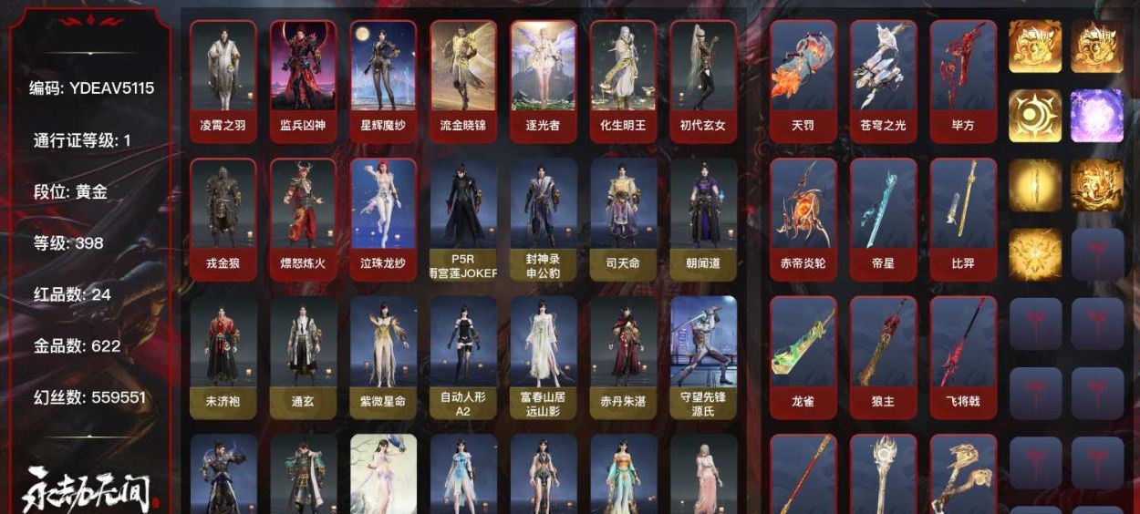 【游戏多多】 ljh 19红色神品: 初代玄女/戎金狼/熛怒炼火/青龙将星/香雪水兰/沙漠香风/监兵凶神/夜魅游莹/少阳剑/帝星/狼主/龙雀/灵犀/狂龙/凤求凰/天罚/苍穹之光/墨离 【总收藏值】 283962 【游戏等级】 363 【游戏段位】 黄金 宁红夜: 初代玄女/昆仑之主/耀世魂花/雪山天女/紫金玉女/碧水青天/红川仙子/霜天红叶/缥缈发/双马尾女沈妙: 楚韵九歌山鬼/涂鸦少女/双马尾女天海: 持威明王/枫行者/觉之一念/净金宝相/灿莲花发/缘觉发/双马尾男殷紫萍: 鹅黄纱梦/福寿仙/伏苓发/暖绒发/双马尾女特木尔: 戎金狼/银狼裘/致命玩笑/唐三/龙虎斗/苍狼之主/狂猎/苍狼宗主发/海神发/双马尾男季沧海: 熛怒炼火/鹧鸪天/不良人李星云/精武魂/椰风夕照/醉山川/孽炎祸斗/江海沧澜/腾烟发/江海发/烈火发/不如吾发/双马尾男胡桃: 小舞/御宅花织/主祭者/天钿女命/春桃笑/御宅罗梦/清雅少女/水仙发/雀变发/双马尾女妖刀姬: 暗夜利刃/樱雨刀舞崔三娘: 掌珠仙子/汐泪/无拘/浩渺发/激浪发/双马尾女岳山: 青龙将星/铁面/煦阳漫叙/破荆者/杨戬/汉光/骁骑/过江龙/守誓者/玄鳞发/双马尾男无尘: 未济袍/梦蜀/金羽客/若谷/九梁发/双马尾男顾清寒: 香雪水兰/禄运玉霄/寒英素雪/姑射真人/冰凌发/绯霜发/双马尾女武田信中: 祸津素盏/麟鹿大铠/苍雷丸/阎摩发/双马尾男迦南: 沙漠香风/浣烟纱/凛冬/金羽圣鹰/凤姿发/朝颜发/双马尾女胡为: 监兵凶神/秋神蓐收/福瑞天泽/悟空/双马尾男季莹莹: 夜魅游莹/炽火照夜/冬无归/冬神玄冥/双马尾女玉玲珑: 赤阳天狐/春不敛/惊雀发/双马尾女哈迪: 天工奥妙/秀逸发/双马尾男魏轻: 念奴娇/傲采发/双马尾女刘炼: 金财聚辉/双马尾男张起灵: 赤焰战灵/云间影/鹤姿发/双马尾男席拉: 雪铃绮歌/蜜语发/双马尾女蓝梦: 如梦令/沉醉发/双马尾女万钧: 雷行猎手/迅猛发/双马尾男拳刃: 诡刃八岐长剑: 少阳剑/不良人龙泉剑/伞剑/冷香/含光承影/永乐/轩辕剑/镇魔尺/2674超越型紫太刀: 残阳/落樱/魂花晶横刀: 帝星/尽春锋阔刀: 狼主/龙雀/听涛_/塑梦钥匙/恶障/暮影/落樱之刃/赤影妖刀/龙蟠斩马刀: 三尖两刃刀/千钧羽/潮枪: 灵犀/凌云志/委蛇矛/建木/玄鲸骨叉/镇山河/长虹棍: 孤灯行/宝月琉璃/打狗棒/电浆杖/糖果棍匕首: 判官笔/化魄/寻魂/马首刀/鹰吻扇: 腾云歌/青峰叠扇双截棍: 狂龙/地火涌/精武/衔谷/镇魔杵/降魔手双刀: 凤求凰/破重云/祸忌/胧夜狐影双戟: 光影裁决/曜金紫珀飞刀: 玄铜飞军/翠影连弩: 御气弩/惊火弦/手里剑喷子鸟铳: 出渊蛟/戏祥云/沉默审判/石中火/萤火火炮: 天罚/吞海鲛/玄武/竹露雳/造景/雪国礼炮/龙啸五眼铳: 苍穹之光/丹鹤/心魔/星追月/梦魇/炉中火/赤霞 ----更多炫彩背包/光效/名片/武器具体看图!截图展示段位不代实际段位,赛季更新等不可抗拒因素发生变化、时限道具不保证所剩时间、标题未写送点卷默认不送】【主播担保+安全至上+性价比 买号卖号只选金牌商家一左友】