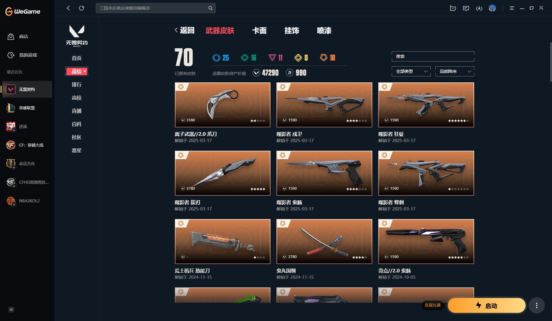 【游戏多多】 【可包人脸】【kf3382】无畏16900库存,VCT 2025 爪刀,落英飞旋,艾沃莉的梦之翼 狂徒,创·纪元 狂徒,塑水宗 正义,西部未来 正义,VCT25 x AG 标配,光明哨兵//2.0 骇灵,神圣领域 战刀