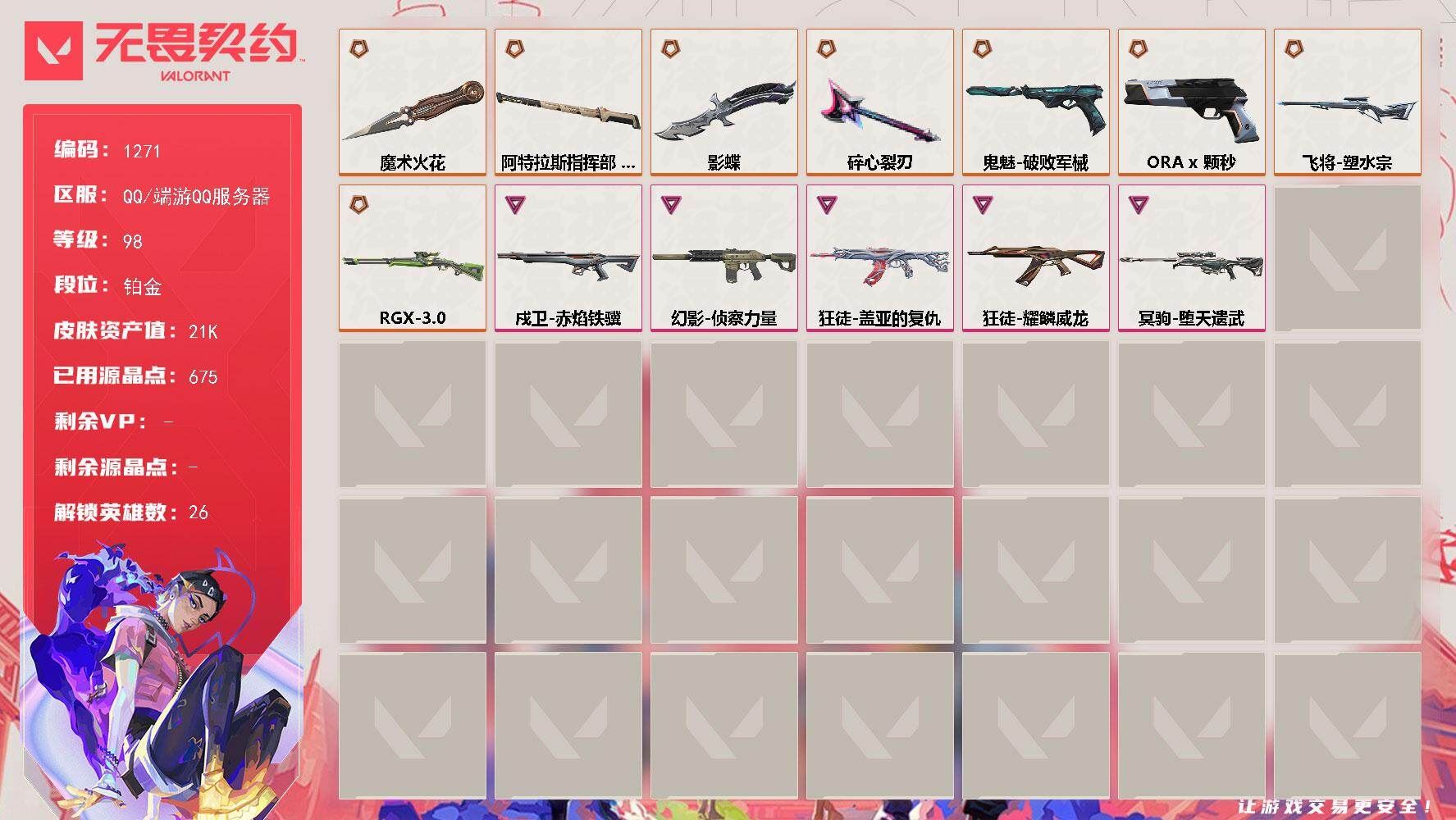 【游戏多多】 【可二次实名】可二次qq,段位铂金【套装】:2025全球冠军赛套装,无畏契约季前邀请赛套装【英雄】:幻棱,炼狱,维斯,暮蝶,壹决,铁臂,捷风,不死鸟,贤者,猎枭,蝰蛇,零,芮娜,尚勃勒,霓虹,夜露,K/O,黑梦,钢锁【近战武器】:近战武器-2025全球冠军赛 蝴蝶刀,近战武器-碎心裂刃,近战武器-无畏契约季前邀请赛 悲悯之刃,近战武器-影钩,近战武器-超时空卫队 三棱军刺,近战武器-RGX 11z Pro//2.0 蝴蝶刀,近战武器-剥皮小刀,近战武器-噬影者 簇刃,近战武器-极简主义//2.0 爪刀,近战武器-星际猎兵 短剑【狂徒】:狂徒-2025全球冠军赛,狂徒-混沌序曲,狂徒-塑水宗,狂徒-多弥尔的复仇,狂徒-艾沃莉的梦之翼,狂徒-盖亚的复仇【幻影】:幻影-黯夜怪谈,幻影-RGX 11z Pro//2.0,幻影-侦察力量,幻影-异鳞魔蛇【冥驹】:冥驹-光荣异象,冥驹-上古龙炎【莽侠】:莽侠-归零者//2.0【VCT手枪】:标配-VCT25 x TYL【正义】:正义-奇点,正义-离子武器【鬼魅】:鬼魅-超时空卫队,鬼魅-天界神兵【卡面】:正义的化身 卡面,无畏契约GO!第一卷:芮娜 卡面,无畏契约GO!第一卷:零 卡面,代号红色 卡面,新兵报到 卡面,V契约 卡面,无畏契约 卡面【喷漆】:拼一枪 喷漆,买装还是存钱 喷漆,胜利属于无畏契约 喷漆,GLHF 喷漆,无畏契约 喷漆【挂饰】:天外飞客 挂饰,无畏契约 纪念币 挂饰,各种道具详情看截图、低价出售找回包 赔、截图展示段位不代 表实际段位,如赛季更新等不可抗拒因素发生变化、时限道具不保证所剩时间、标题未写送点劵默认不送【卖号买号首选亿梦】