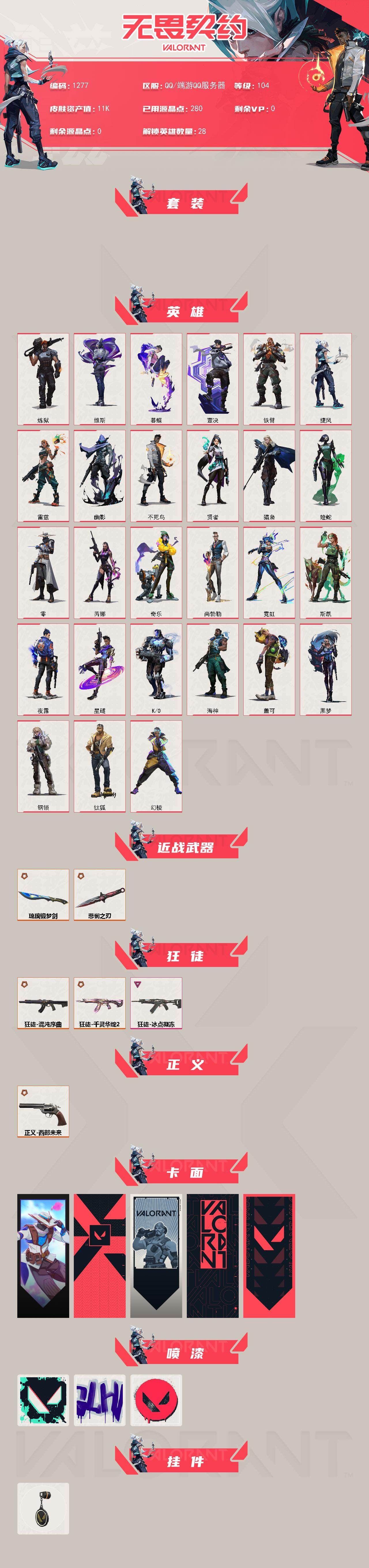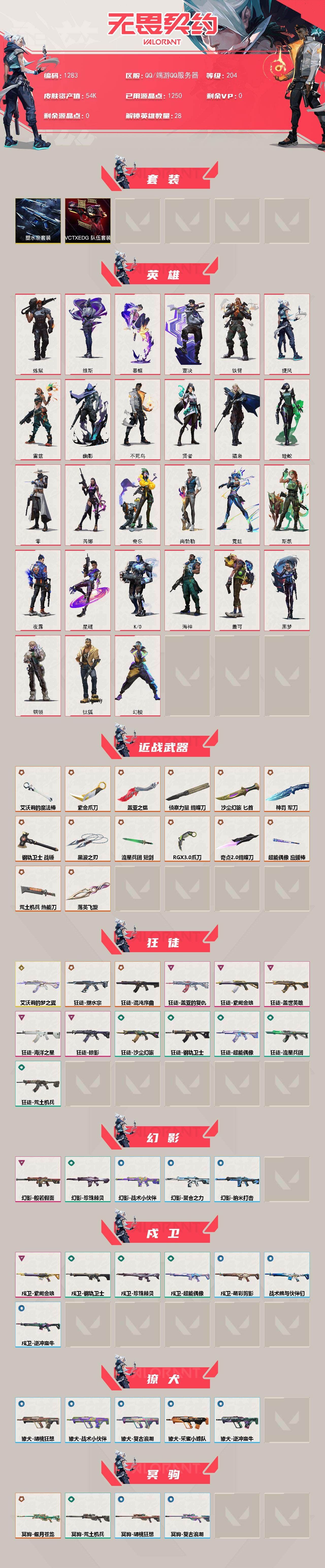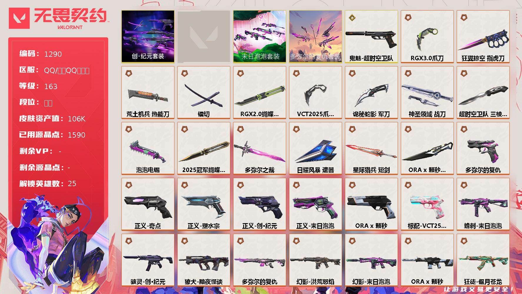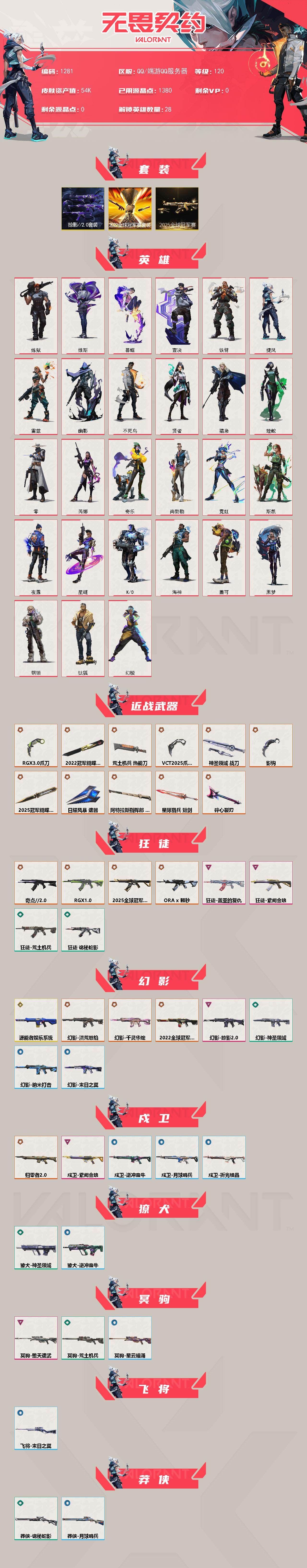 【游戏多多】 【可二次实名】可二次QQ【无畏端游段位:白银】【套装】:2025全球冠军赛套装【英雄】:幻棱,炼狱,维斯,暮蝶,钛狐,壹决,铁臂,捷风,雷兹,幽影,不死鸟,贤者,猎枭,蝰蛇,零,芮娜,奇乐,尚勃勒,霓虹,斯凯,夜露,星礈,K/O,海神,盖可,黑梦,钢锁【近战武器】:近战武器-2025全球冠军赛 蝴蝶刀,近战武器-碎心裂刃,近战武器-剥皮小刀,近战武器-紫金爪刀,近战武器-RGX 11z Pro//3.0 爪刀,近战武器-黑波之刃,近战武器-澄湖潋滟,近战武器-定海神珍,近战武器-诡秘蛇影 军刀,近战武器-日耀风暴 遗器,近战武器-阿特拉斯指挥部 甩棍,近战武器-星际猎兵 短剑【狂徒】:狂徒-2025全球冠军赛,狂徒-洪荒怒焰,狂徒-混沌序曲,狂徒-偃月苍龙,狂徒-虚空遗器,狂徒-RGX 11z Pro,狂徒-多弥尔的复仇,狂徒-千灵华绽//2.0,狂徒-盖亚的复仇,狂徒-离子武器//2.0,狂徒-诡秘蛇影【幻影】:幻影-黯夜怪谈,幻影-侦察力量,幻影-末日之翼【戍卫】:戍卫-掠影,戍卫-紫阙金琅,戍卫-折光棱晶【冥驹】:冥驹-堕天遗武,冥驹-起源【飞将】:飞将-塑水宗,飞将-末日之翼【莽侠】:莽侠-RGX 11z Pro//3.0,莽侠-诡秘蛇影,莽侠-神罚//2.0【奥丁】:奥丁-末日之翼【判官】:判官-诡秘蛇影【蜂刺】:蜂刺-折光棱晶【标配】:标配-紫阙金琅,标配-折光棱晶【正义】:正义-奇点,正义-千灵华绽,正义-西部未来【鬼魅】:鬼魅-千灵华绽//2.0,鬼魅-源能者娱乐系统,鬼魅-盖亚的复仇,鬼魅-诡秘蛇影【短炮】:短炮-末日之翼【卡面】:修车达人 卡面,正义的化身 卡面,梦幻奶茶 卡面,无畏契约GO!第一卷:芮娜 卡面,盖可工牌 卡面,无畏契约GO!第一卷:零 卡面,无垠星环 卡面,《双城之战》金克丝 卡面,代号红色 卡面,新兵报到 卡面,V契约 卡面,无畏契约 卡面【喷漆】:熊抱 喷漆,买装还是存钱 喷漆,关门放狗 喷漆,无畏契约GO!第一卷:零 喷漆,胜利属于无畏契约 喷漆,GLHF 喷漆,无畏契约 喷漆【挂饰】:无畏契约GO!第一卷 芮娜 挂饰,无畏契约GO!第一卷 零 挂饰,瞬云履 挂饰,第九季//第二幕 纪念币 挂饰,薰衣草之心 挂饰,天外飞客 挂饰,《双城之战》魄罗 挂饰,无畏契约 纪念币 挂饰,各种道具详情看截图、低价出售找回包 赔、截图展示段位不代 表实际段位,如赛季更新等不可抗拒因素发生变化、时限道具不保证所剩时间、标题未写送点劵默认不送【卖号买号首选亿梦】