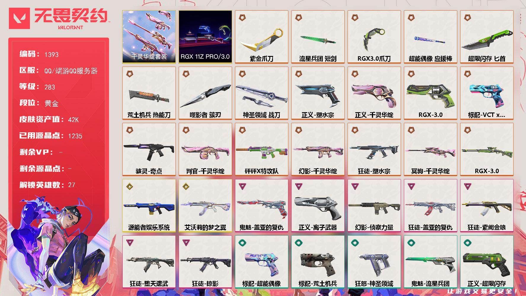 【游戏多多】 【可二次实名】可二次QQ【段位:黄金】【套装】:RGX 11z Pro//3.0套装,千灵华绽套装【英雄】:幻棱,炼狱,维斯,暮蝶,钛狐,壹决,铁臂,捷风,雷兹,幽影,不死鸟,贤者,猎枭,蝰蛇,零,芮娜,奇乐,尚勃勒,霓虹,斯凯,夜露,K/O,海神,盖可,黑梦,钢锁【近战武器】:近战武器-紫金爪刀,近战武器-RGX 11z Pro//3.0 爪刀,近战武器-落英飞旋,近战武器-噬影者 簇刃,近战武器-流星兵团 短剑,近战武器-超能偶像 应援棒,近战武器-超限闪存 匕首,近战武器-荒土机兵 热能刀,近战武器-神圣领域 战刀【狂徒】:狂徒-塑水宗,狂徒-艾沃莉的梦之翼,狂徒-堕天遗武,狂徒-掠影,狂徒-盖亚的复仇,狂徒-紫阙金琅,狂徒-超能偶像,狂徒-荒土机兵,狂徒-流星兵团,狂徒-诡秘蛇影【幻影】:幻影-砰砰X特攻队,幻影-千灵华绽,幻影-源能者娱乐系统,幻影-侦察力量,幻影-超限闪存,幻影-神圣领域,幻影-聚合之力,幻影-纳米打击【戍卫】:戍卫-超能偶像,戍卫-浮光跃金,戍卫-逆冲蛮牛,戍卫-沙场老兵,戍卫-战术熊与伙伴们,戍卫-月球哨兵,戍卫-折光棱晶【獠犬】:獠犬-神圣领域,獠犬-采蜜小蜂队,獠犬-模拟赫兹,獠犬-逆冲蛮牛【冥驹】:冥驹-千灵华绽,冥驹-荒土机兵,冥驹-模拟赫兹,冥驹-星云暗涌【飞将】:飞将-聚合之力,飞将-战术熊与伙伴们,飞将-末日之翼【莽侠】:莽侠-RGX 11z Pro//3.0,莽侠-超限闪存,莽侠-诡秘蛇影,莽侠-纤云弄巧,莽侠-月球哨兵【战神】:战神-神圣领域,战神-采蜜小蜂队,战神-浮光跃金【奥丁】:奥丁-流星兵团,奥丁-纳米打击,奥丁-末日之翼【判官】:判官-千灵华绽,判官-超能偶像,判官-诡秘蛇影,判官-采蜜小蜂队,判官-纳米打击x【雄鹿】:雄鹿-模拟赫兹,雄鹿-逆冲蛮牛,雄鹿-月球哨兵【骇灵】:骇灵-奇点,骇灵-荒土机兵,骇灵-流星兵团,骇灵-浮光跃金,骇灵-星云暗涌【蜂刺】:蜂刺-超限闪存,蜂刺-聚合之力,蜂刺-纤云弄巧,蜂刺-星云暗涌,蜂刺-折光棱晶【标配】:标配-超能偶像,标配-荒土机兵,标配-浮光跃金,标配-战术熊与伙伴们,标配-折光棱晶【VCT手枪】:标配-VCT x BLG【正义】:正义-RGX 11z Pro//3.0,正义-千灵华绽,正义-塑水宗,正义-离子武器,正义-超限闪存,正义-复古浪潮,正义-纳米打击,正义-纤云弄巧,正义-月球哨兵【鬼魅】:鬼魅-盖亚的复仇,鬼魅-流星兵团,鬼魅-采蜜小蜂队,鬼魅-模拟赫兹,鬼魅-扑棱扑棱,鬼魅-星云暗涌【狂怒】:狂怒-神圣领域,狂怒-聚合之力,狂怒-逆冲蛮牛,狂怒-战术熊与伙伴们【短炮】:短炮-天才少女,短炮-纤云弄巧,短炮-末日之翼,各种道具详情看截图、低价出售找回包 赔、截图展示段位不代 表实际段位,如赛季更新等不可抗拒因素发生变化、时限道具不保证所剩时间、标题未写送点劵默认不送【卖号买号首选亿梦】