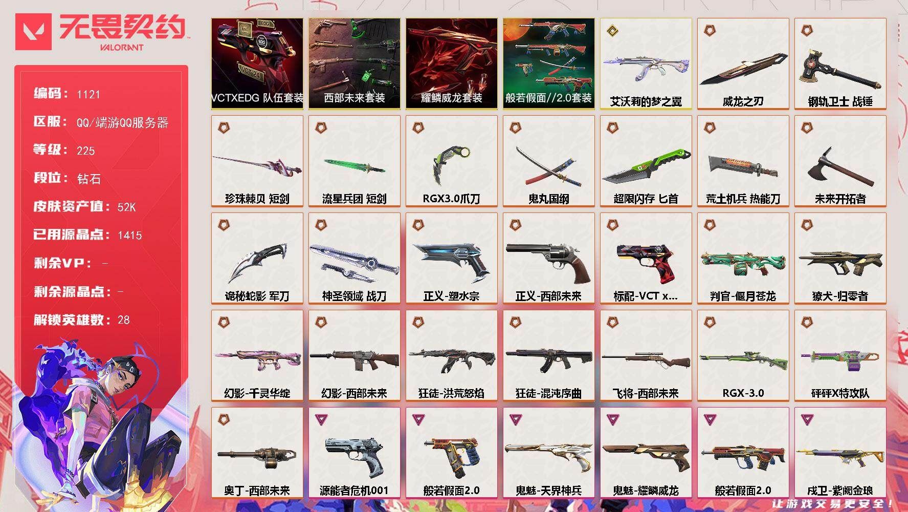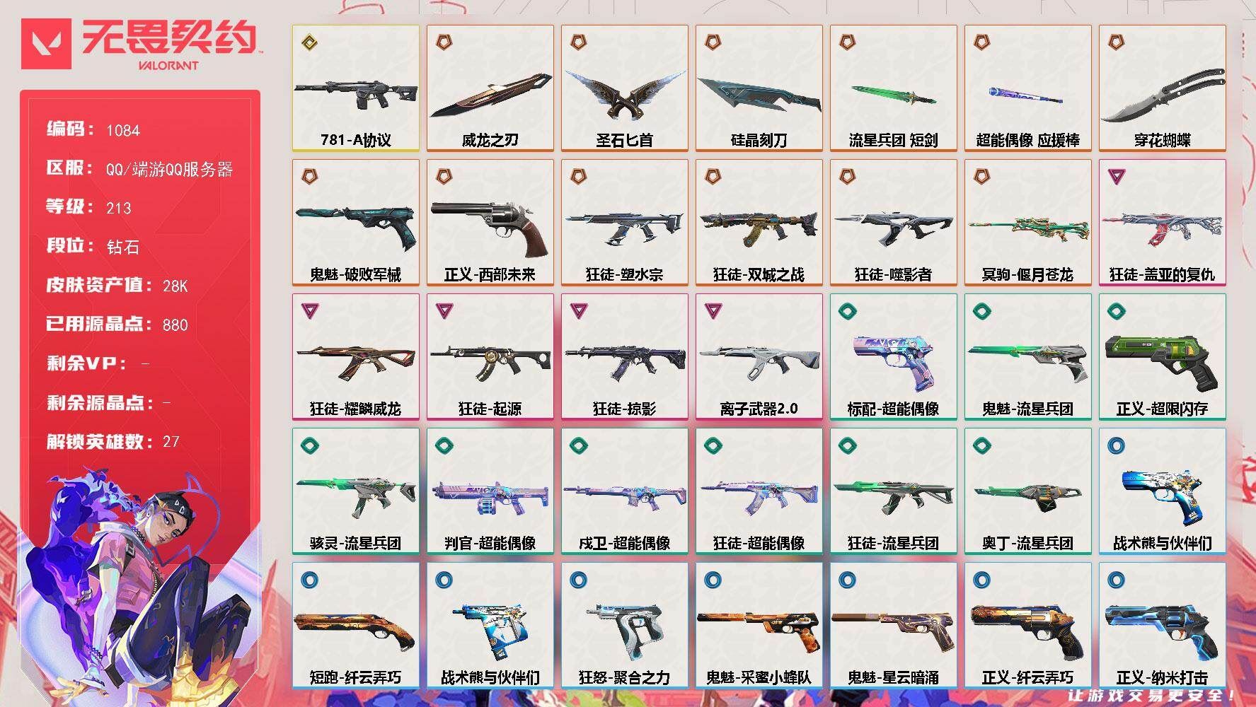 【游戏多多】 【可二次实名】可二次QQ 【无畏端游】【段位:钻石】【套装】:西部未来套装,VCTxEDG 队伍套装,耀鳞威龙套装,般若假面//2.0套装【英雄】:幻棱,炼狱,维斯,暮蝶,钛狐,壹决,铁臂,捷风,雷兹,幽影,不死鸟,贤者,猎枭,蝰蛇,零,芮娜,奇乐,尚勃勒,霓虹,斯凯,夜露,星礈,K/O,海神,盖可,黑梦,钢锁【近战武器】:近战武器-RGX 11z Pro//3.0 爪刀,近战武器-威龙之刃,近战武器-鬼丸国纲,近战武器-未来开拓者,近战武器-珍珠棘贝 短剑,近战武器-流星兵团 短剑,近战武器-超限闪存 匕首,近战武器-钢轨卫士 战锤,近战武器-荒土机兵 热能刀,近战武器-诡秘蛇影 军刀,近战武器-神圣领域 战刀【狂徒】:狂徒-艾沃莉的梦之翼,狂徒-洪荒怒焰,狂徒-混沌序曲,狂徒-般若假面//2.0,狂徒-掠影,狂徒-盖亚的复仇,狂徒-耀鳞威龙,狂徒-钢轨卫士,狂徒-荒土机兵,狂徒-流星兵团,狂徒-诡秘蛇影【幻影】:幻影-千灵华绽,幻影-西部未来,幻影-侦察力量,幻影-超限闪存,幻影-珍珠棘贝,幻影-神圣领域,幻影-纳米打击,幻影-战术小伙伴,幻影-末日之翼,幻影-西部未来【戍卫】:戍卫-紫阙金琅,戍卫-钢轨卫士,戍卫-珍珠棘贝,戍卫-浮光跃金,戍卫-逆冲蛮牛,戍卫-战术熊与伙伴们,戍卫-月球哨兵,戍卫-折光棱晶【獠犬】:獠犬-归零者,獠犬-般若假面//2.0,獠犬-神圣领域,獠犬-复古浪潮,獠犬-模拟赫兹,獠犬-逆冲蛮牛,獠犬-战术小伙伴【冥驹】:冥驹-起源,冥驹-荒土机兵,冥驹-复古浪潮,冥驹-模拟赫兹,冥驹-星云暗涌【飞将】:飞将-西部未来,飞将-光导纤维,飞将-战术熊与伙伴们,飞将-末日之翼【莽侠】:莽侠-RGX 11z Pro//3.0,莽侠-超限闪存,莽侠-诡秘蛇影,莽侠-深海水族,莽侠-纤云弄巧,莽侠-月球哨兵【战神】:战神-般若假面//2.0,战神-神圣领域,战神-浮光跃金,战神-深海水族【奥丁】:奥丁-砰砰X特攻队,奥丁-西部未来,奥丁-流星兵团,奥丁-纳米打击,奥丁-战术小伙伴,奥丁-末日之翼【判官】:判官-偃月苍龙,判官-诡秘蛇影,判官-纳米打击x【雄鹿】:雄鹿-复古浪潮,雄鹿-模拟赫兹,雄鹿-逆冲蛮牛,雄鹿-月球哨兵【骇灵】:骇灵-荒土机兵,骇灵-流星兵团,骇灵-珍珠棘贝,骇灵-浮光跃金,骇灵-光导纤维,骇灵-星云暗涌【蜂刺】:蜂刺-超限闪存,蜂刺-深海水族,蜂刺-纤云弄巧,蜂刺-战术小伙伴,蜂刺-星云暗涌,蜂刺-折光棱晶【标配】:标配-源能者危机001,标配-超能偶像,标配-荒土机兵,标配-浮光跃金,标配-光导纤维,标配-战术熊与伙伴们,标配-折光棱晶【VCT手枪】:标配-VCT x EDG【正义】:正义-塑水宗,正义-西部未来,正义-超限闪存,正义-复古浪潮,正义-纳米打击,正义-纤云弄巧,正义-游戏结束,正义-月球哨兵【鬼魅】:鬼魅-天界神兵,鬼魅-耀鳞威龙,鬼魅-流星兵团,鬼魅-诡秘蛇影,鬼魅-光导纤维,鬼魅-模拟赫兹,鬼魅-星云暗涌【狂怒】:狂怒-般若假面//2.0,狂怒-钢轨卫士,狂怒-珍珠棘贝,狂怒-神圣领域,狂怒-逆冲蛮牛,狂怒-喷火式,狂怒-战术熊与伙伴们【短炮】:短炮-钢轨卫士,短炮-蛇吻,短炮-深海水族,短炮-纤云弄巧,短炮-末日之翼【卡面】:终章:激斗汉堡 卡面,进入射程 卡面,分崩离析 卡面,纳米打击 卡面,抑制技术 卡面,激斗汉堡 卡面,瓦娃脸雪糕 P2 卡面,从黄昏到黎明 卡面,荒土机兵 卡面,银弹猎手 卡面,逆冲蛮牛 卡面,《双城之战》拥抱 卡面,精灵大战 卡面,欢迎来到底城 卡面,南瓜盛典 卡面,VCT CN首冠 卡面,唱片的故事 卡面,钢弓与箭弦 卡面,无畏契约:暮蝶 卡面,排除故障 卡面,战术桌游 卡面,悠享食光 卡面,修车达人 卡面,热舞环节 卡面,模拟赫兹 卡面,浮光跃金 卡面,超限闪存 卡面,维斯工牌 卡面,正义的化身 卡面,至黑之夜 卡面,终章:生意人麦宝 卡面,铁之华 卡面,时间到 卡面,最高舞台 卡面,RGX 11z Pro//3.0 卡面,声感陷阱设计图 卡面,霓帧牛蛙 卡面,梦幻奶茶 卡面,终章:打造专属狂徒 卡面,趁热吃 卡面,西装暴徒 卡面,失控边缘 卡面,哨卫者之领域 卡面,暮蝶工牌 卡面,战术熊与伙伴们 卡面,源能反应 卡面,流星兵团 卡面,纤云弄巧 卡面,暂别喧嚣 卡面,打造专属狂徒 卡面,零点嗅探设计图 卡面,无畏契约:蝰蛇 卡面,表象之下 卡面,虹吸式咖啡壶 卡面,源能者美容 卡面,脚踝终结者 卡面 ,夜班 卡面,瓦娃脸雪糕 卡面 ,沙雕爆能器 卡面,无畏契约GO!第一卷:芮娜 卡面,深海水族 卡面,珍珠棘贝 卡面,复古浪潮 卡面,盖可工牌 卡面,清除名单 卡面,无畏契约GO!第一卷:零 卡面