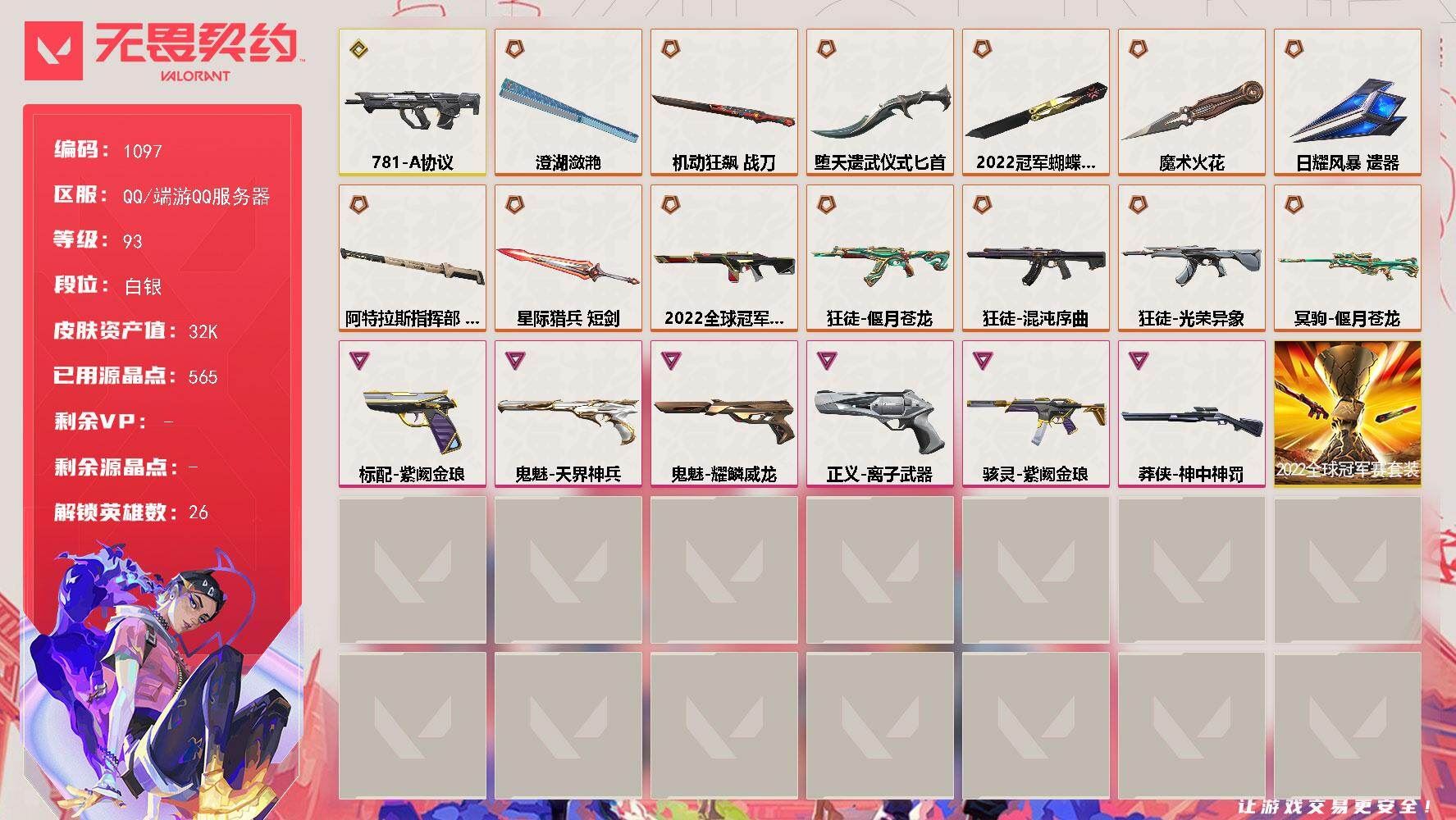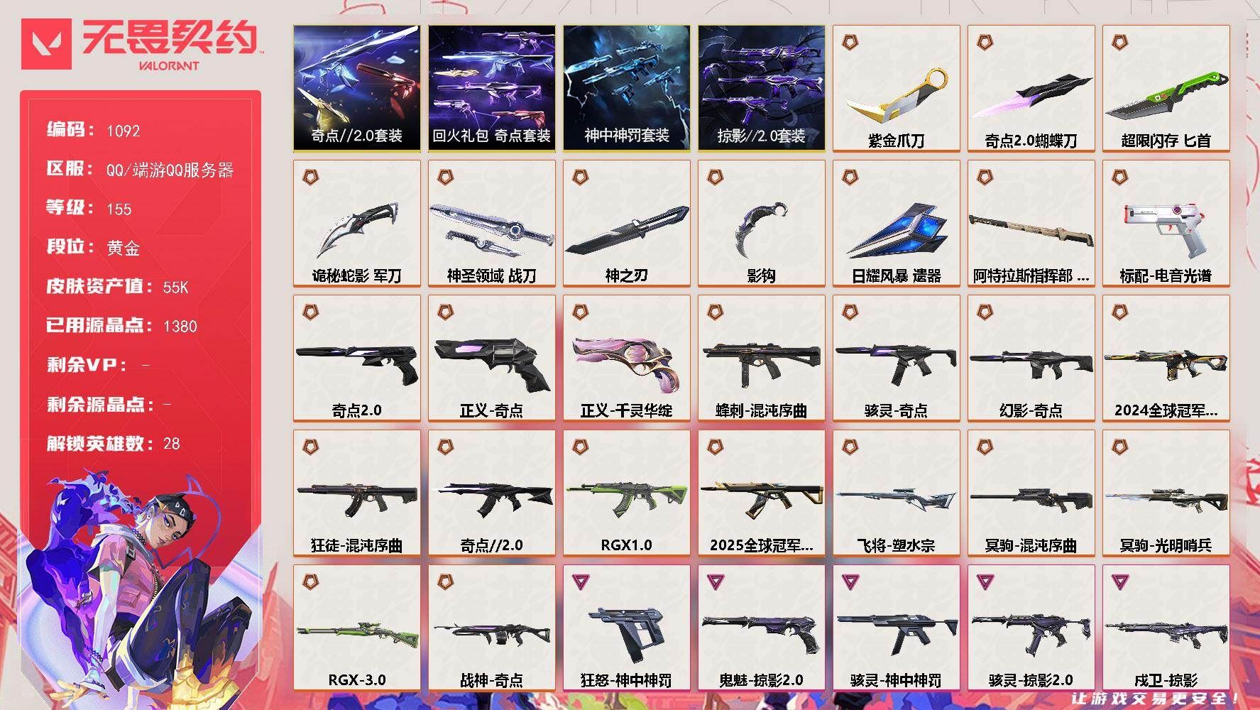 【游戏多多】 【可二次实名】可二次QQ 【无畏端游】【段位:铂金】【套装】:2025全球冠军赛套装,无畏契约季前邀请赛套装,千灵华绽套装【英雄】:幻棱,炼狱,维斯,暮蝶,钛狐,壹决,铁臂,捷风,雷兹,幽影,不死鸟,贤者,猎枭,蝰蛇,零,芮娜,奇乐,尚勃勒,霓虹,斯凯,夜露,星礈,K/O,海神,盖可,黑梦,钢锁【近战武器】:近战武器-2025全球冠军赛 蝴蝶刀,近战武器-无畏契约季前邀请赛 悲悯之刃,近战武器-侦察力量 蝴蝶刀,近战武器-落英飞旋,近战武器-珍珠棘贝 短剑,近战武器-流星兵团 短剑,近战武器-超能偶像 应援棒,近战武器-钢轨卫士 战锤【狂徒】:狂徒-2025全球冠军赛,狂徒-洪荒怒焰,狂徒-混沌序曲,狂徒-机动狂飙,狂徒-塑水宗,狂徒-多弥尔的复仇,狂徒-掠影,狂徒-盖亚的复仇,狂徒-超能偶像,狂徒-钢轨卫士,狂徒-流星兵团【幻影】:幻影-千灵华绽,幻影-侦察力量,幻影-珍珠棘贝,幻影-聚合之力,幻影-战术小伙伴【戍卫】:戍卫-掠影,戍卫-超能偶像,戍卫-钢轨卫士,戍卫-珍珠棘贝,戍卫-战术熊与伙伴们【獠犬】:獠犬-采蜜小蜂队,獠犬-复古浪潮,獠犬-战术小伙伴【冥驹】:冥驹-千灵华绽,冥驹-复古浪潮【飞将】:飞将-西部未来,飞将-聚合之力,飞将-光导纤维,飞将-战术熊与伙伴们【莽侠】:莽侠-深海水族,莽侠-纤云弄巧【战神】:战神-采蜜小蜂队,战神-深海水族【奥丁】:奥丁-流星兵团,奥丁-战术小伙伴【判官】:判官-千灵华绽,判官-超能偶像,判官-采蜜小蜂队【雄鹿】:雄鹿-复古浪潮【骇灵】:骇灵-流星兵团,骇灵-珍珠棘贝,骇灵-无限竞技,骇灵-光导纤维【蜂刺】:蜂刺-聚合之力,蜂刺-深海水族,蜂刺-纤云弄巧,蜂刺-战术小伙伴【标配】:标配-超能偶像,标配-光导纤维,标配-战术熊与伙伴们【VCT手枪】:标配-VCT x PRX【正义】:正义-千灵华绽,正义-超限闪存,正义-复古浪潮,正义-纳米打击,正义-纤云弄巧【鬼魅】:鬼魅-源能者娱乐系统,鬼魅-流星兵团,鬼魅-诡秘蛇影,鬼魅-采蜜小蜂队,鬼魅-光导纤维,鬼魅-星云暗涌【狂怒】:狂怒-钢轨卫士,狂怒-珍珠棘贝,狂怒-聚合之力,狂怒-战术熊与伙伴们【短炮】:短炮-钢轨卫士,短炮-深海水族,短炮-纤云弄巧【卡面】:终章:激斗汉堡 卡面,进入射程 卡面,《双城之战》拥抱 卡面,精灵大战 卡面,欢迎来到底城 卡面,南瓜盛典 卡面,修车达人 卡面,热舞环节 卡面,正义的化身 卡面,终章:生意人麦宝 卡面,铁之华 卡面,失而复得 卡面,时间到 卡面,最高舞台 卡面,复活专家 卡面,归乡 // 蝰蛇 卡面,超能偶像 卡面,生意人麦宝 卡面,音熊登场 卡面,树懒大作战 卡面,声感陷阱设计图 卡面,Clutch 卡面,霓帧牛蛙 卡面,钢锁工牌 卡面,战术小伙伴的夏日 卡面,采蜜小蜂队 卡面,聚合之力 卡面,梦幻奶茶 卡面,终章:打造专属狂徒 卡面,趁热吃 卡面,西装暴徒 卡面,失控边缘 卡面,哨卫者之领域 卡面,暮蝶工牌 卡面,战术熊与伙伴们 卡面,源能反应 卡面,流星兵团 卡面,纤云弄巧 卡面,暂别喧嚣 卡面,打造专属狂徒 卡面,零点嗅探设计图 卡面,终章:瓦娃脸雪糕 卡面,表象之下 卡面,虹吸式咖啡壶 卡面,源能者美容 卡面,脚踝终结者 卡面 ,夜班 卡面,瓦娃脸雪糕 卡面 ,沙雕爆能器 卡面,无畏契约GO!第一卷:芮娜 卡面,深海水族 卡面,珍珠棘贝 卡面,复古浪潮 卡面,盖可工牌 卡面,清除名单 卡面,无畏契约GO!第一卷:零 卡面,终章:同步耍酷 卡面,龍记 卡面,化茧成蝶 卡面,比比看谁快? 卡面,《双城之战》金克丝 卡面,蝰蛇vs幽影 卡面,势不可挡//盖可 卡面,逆向独行 卡面 ,同步耍酷 卡面,完美调谐 卡面 ,没有什么能逃过我的眼睛 卡面,光导纤维 卡面,战术小伙伴 卡面,钢轨卫士 卡面,暗枪 卡面,无畏契约GO!第一卷:贤者 卡面,铁臂vs雷兹 卡面,钢锁vs盖可 卡面,别冒尖 卡面,一击全倒 卡面,黑影先生的咖啡! 卡面,代号红色 卡面,新兵报到 卡面,V契约 卡面,无畏契约 卡面【喷漆】:嗨宝南瓜灯 喷漆,嘭! 喷漆,都算到了 喷漆,控场勿近 喷漆,像素星礈 喷漆,小丑猫 喷漆,熊抱 喷漆,又被闪了 喷漆,终极羞辱 喷漆,超级粉丝 喷漆,黯兽卖萌 喷漆,捷风差距 喷漆,惊声尖叫 喷漆,五人成星 喷漆,超能偶像 喷漆,放我出去 喷漆,战术熊的巴拉莱卡琴 喷漆,掩护我 喷漆,大佬发枪 喷漆,边缘试探 喷漆,拼一枪 喷漆,聚合之力 喷漆,采蜜小蜂队 喷漆,梦幻小队 喷漆,五个全都齐了 喷漆,加油!加油! 喷漆,开心到爆炸 喷漆,皮蛋萌舞 喷漆,我觉得不行 喷漆,头号粉丝 喷漆,吸一口快乐 喷漆,永远的答案 喷漆,再来一次? 喷漆,