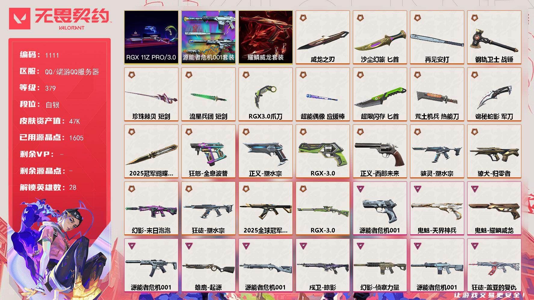 【游戏多多】 【可二次实名】可二次QQ【段位:白银】【套装】:2025全球冠军赛套装,RGX 11z Pro//3.0套装,源能者危机001套装,耀鳞威龙套装【英雄】:幻棱,炼狱,维斯,暮蝶,钛狐,壹决,铁臂,捷风,雷兹,幽影,不死鸟,贤者,猎枭,蝰蛇,零,芮娜,奇乐,尚勃勒,霓虹,斯凯,夜露,星礈,K/O,海神,盖可,黑梦,钢锁【近战武器】:近战武器-2025全球冠军赛 蝴蝶刀,近战武器-RGX 11z Pro//3.0 爪刀,近战武器-威龙之刃,近战武器-珍珠棘贝 短剑,近战武器-流星兵团 短剑,近战武器-超能偶像 应援棒,近战武器-超限闪存 匕首,近战武器-钢轨卫士 战锤,近战武器-荒土机兵 热能刀,近战武器-沙尘幻旅 匕首,近战武器-再见安打,近战武器-诡秘蛇影 军刀【狂徒】:狂徒-2025全球冠军赛,狂徒-塑水宗,狂徒-掠影,狂徒-盖亚的复仇,狂徒-耀鳞威龙,狂徒-紫阙金琅,狂徒-超能偶像,狂徒-钢轨卫士,狂徒-荒土机兵,狂徒-流星兵团,狂徒-沙尘幻旅,狂徒-诡秘蛇影【幻影】:幻影-末日泡泡,幻影-源能者危机001,幻影-侦察力量,幻影-超限闪存,幻影-珍珠棘贝,幻影-聚合之力,幻影-纳米打击,幻影-战术小伙伴,幻影-末日之翼【戍卫】:戍卫-掠影,戍卫-超能偶像,戍卫-钢轨卫士,戍卫-珍珠棘贝,戍卫-浮光跃金,戍卫-萌彩剪影,戍卫-逆冲蛮牛,戍卫-战术熊与伙伴们,戍卫-折光棱晶【獠犬】:獠犬-归零者,獠犬-采蜜小蜂队,獠犬-复古浪潮,獠犬-胡桃狂想,獠犬-模拟赫兹,獠犬-逆冲蛮牛,獠犬-战术小伙伴【冥驹】:冥驹-堕天遗武,冥驹-荒土机兵,冥驹-复古浪潮,冥驹-胡桃狂想,冥驹-模拟赫兹【飞将】:飞将-沙尘幻旅,飞将-聚合之力,飞将-光导纤维,飞将-战术熊与伙伴们,飞将-末日之翼【莽侠】:莽侠-RGX 11z Pro//3.0,莽侠-超限闪存,莽侠-诡秘蛇影,莽侠-深海水族,莽侠-纤云弄巧【战神】:战神-采蜜小蜂队,战神-浮光跃金,战神-萌彩剪影,战神-深海水族【奥丁】:奥丁-流星兵团,奥丁-纳米打击,奥丁-战术小伙伴,奥丁-末日之翼【判官】:判官-超能偶像,判官-诡秘蛇影,判官-采蜜小蜂队,判官-萌彩剪影,判官-纳米打击x【雄鹿】:雄鹿-起源,雄鹿-源能者危机001,雄鹿-复古浪潮,雄鹿-模拟赫兹,雄鹿-逆冲蛮牛【骇灵】:骇灵-塑水宗,骇灵-源能者危机001,骇灵-荒土机兵,骇灵-流星兵团,骇灵-沙尘幻旅,骇灵-珍珠棘贝,骇灵-无限竞技,骇灵-浮光跃金,骇灵-光导纤维【蜂刺】:蜂刺-超限闪存,蜂刺-胡桃狂想,蜂刺-聚合之力,蜂刺-深海水族,蜂刺-纤云弄巧,蜂刺-战术小伙伴,蜂刺-折光棱晶【标配】:标配-源能者危机001,标配-超能偶像,标配-荒土机兵,标配-浮光跃金,标配-光导纤维,标配-战术熊与伙伴们,标配-折光棱晶【正义】:正义-RGX 11z Pro//3.0,正义-塑水宗,正义-西部未来,正义-超限闪存,正义-沙尘幻旅,正义-复古浪潮,正义-纳米打击,正义-纤云弄巧【鬼魅】:鬼魅-天界神兵,鬼魅-耀鳞威龙,鬼魅-流星兵团,鬼魅-诡秘蛇影,鬼魅-采蜜小蜂队,鬼魅-光导纤维,鬼魅-胡桃狂想,鬼魅-模拟赫兹,鬼魅-星云暗涌【狂怒】:狂怒-全息波普,狂怒-钢轨卫士,狂怒-珍珠棘贝,狂怒-聚合之力,狂怒-萌彩剪影,狂怒-逆冲蛮牛,狂怒-战术熊与伙伴们【短炮】:短炮-钢轨卫士,短炮-蛇吻,短炮-深海水族,短炮-天才少女,短炮-纤云弄巧,短炮-末日之翼,各种道具详情看截图、低价出售找回包 赔、截图展示段位不代 表实际段位,如赛季更新等不可抗拒因素发生变化、时限道具不保证所剩时间、标题未写送点劵默认不送【卖号买号首选亿梦】