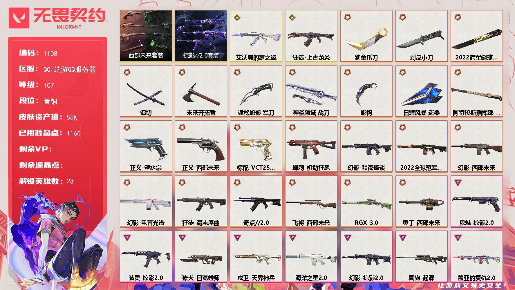 【游戏多多】 【可二次实名】可二次QQ 【无畏端游】【段位:青铜 】【套装】:2022全球冠军赛套装,西部未来套装,掠影//2.0套装【英雄】:幻棱,炼狱,维斯,暮蝶,钛狐,壹决,铁臂,捷风,雷兹,幽影,不死鸟,贤者,猎枭,蝰蛇,零,芮娜,奇乐,尚勃勒,霓虹,斯凯,夜露,星礈,K/O,海神,盖可,黑梦,钢锁【近战武器】:近战武器-2022全球冠军赛 蝴蝶刀,近战武器-影钩,近战武器-剥皮小刀,近战武器-紫金爪刀,近战武器-镭切,近战武器-未来开拓者,近战武器-诡秘蛇影 军刀,近战武器-神圣领域 战刀,近战武器-日耀风暴 遗器,近战武器-阿特拉斯指挥部 甩棍【狂徒】:狂徒-艾沃莉的梦之翼,狂徒-上古龙炎,狂徒-混沌序曲,狂徒-奇点//2.0,狂徒-荒土机兵,狂徒-诡秘蛇影【幻影】:幻影-2022全球冠军赛,幻影-黯夜怪谈,幻影-西部未来,幻影-电音光谱,幻影-海洋之星//2.0,幻影-掠影//2.0,幻影-神圣领域,幻影-末日之翼,幻影-西部未来,幻影-电音光谱【戍卫】:戍卫-天界神兵,戍卫-逆冲蛮牛,戍卫-月球哨兵,戍卫-折光棱晶【獠犬】:獠犬-日冕雄师,獠犬-神圣领域,獠犬-逆冲蛮牛【冥驹】:冥驹-起源,冥驹-荒土机兵,冥驹-星云暗涌【飞将】:飞将-西部未来,飞将-末日之翼【莽侠】:莽侠-RGX 11z Pro//3.0,莽侠-诡秘蛇影,莽侠-月球哨兵【战神】:战神-盖亚的复仇//2.0,战神-神圣领域【奥丁】:奥丁-西部未来,奥丁-掠影//2.0,奥丁-纳米打击,奥丁-末日之翼【判官】:判官-诡秘蛇影,判官-纳米打击x【雄鹿】:雄鹿-逆冲蛮牛,雄鹿-月球哨兵【骇灵】:骇灵-掠影//2.0,骇灵-荒土机兵,骇灵-星云暗涌【蜂刺】:蜂刺-机动狂飙,蜂刺-星云暗涌,蜂刺-折光棱晶【标配】:标配-荒土机兵,标配-折光棱晶【VCT手枪】:标配-VCT25 x BBL【正义】:正义-塑水宗,正义-西部未来,正义-月球哨兵【鬼魅】:鬼魅-掠影//2.0,鬼魅-诡秘蛇影,鬼魅-星云暗涌【狂怒】:狂怒-神圣领域,狂怒-逆冲蛮牛【短炮】:短炮-蛇吻,短炮-末日之翼【卡面】:纳米打击 卡面,抑制技术 卡面,激斗汉堡 卡面,瓦娃脸雪糕 P2 卡面,从黄昏到黎明 卡面,荒土机兵 卡面,银弹猎手 卡面,逆冲蛮牛 卡面,精灵大战 卡面,欢迎来到底城 卡面,南瓜盛典 卡面,正义的化身 卡面,至黑之夜 卡面,树懒大作战 卡面,无畏契约:蝰蛇 卡面,无畏契约GO!第一卷:芮娜 卡面,清除名单 卡面,无畏契约GO!第一卷:零 卡面,《双城之战》金克丝 卡面,暗枪 卡面,无畏契约GO!第一卷:贤者 卡面,代号红色 卡面,新兵报到 卡面,V契约 卡面,无畏契约 卡面【喷漆】:请求重启 喷漆,逆冲蛮牛 喷漆,纳米打击 喷漆,鼻尖上的蝴蝶 喷漆,简笔画黯兽 喷漆,独守蝰腹 喷漆,他们将落荒而逃 喷漆,通缉:战术企鹅 喷漆,荒土机兵 喷漆,别挡我吃球! 喷漆,嗨宝南瓜灯 喷漆,控场勿近 喷漆,审判之爪 喷漆,蝰蛇 喷漆,致命毒素 喷漆,喜欢哪种毒? 喷漆,买装还是存钱 喷漆,无畏契约GO!第一卷:芮娜 喷漆,自信满满 喷漆,胜利属于无畏契约 喷漆,GLHF 喷漆,无畏契约 喷漆【挂饰】:猫猫木乃伊 挂饰,水壶 挂饰,纳米打击 挂饰,逆冲蛮牛 挂饰,可爱糖糖 挂饰,伞绳 挂饰,第九季//第三幕 纪念币 挂饰,无畏契约GO!第一卷 芮娜 挂饰,无畏契约GO!第一卷 零 挂饰,第九季//第二幕 纪念币 挂饰,化学容器 挂饰,天外飞客 挂饰,《双城之战》魄罗 挂饰,无畏契约 纪念币 挂饰,,各种道具详情看截图、低价出售找回包 赔、截图展示段位不代 表实际段位,如赛季更新等不可抗拒因素发生变化、时限道具不保证所剩时间、标题未写送点劵默认不送【卖号买号首选亿梦】