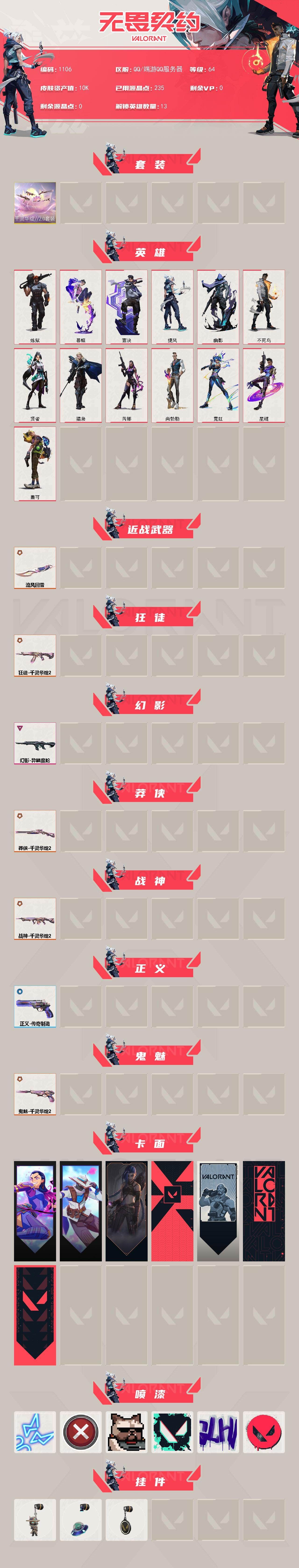 【游戏多多】 【可二次实名】可二次QQ 【无畏端游】【段位:青铜】【套装】:千灵华绽//2.0套装【英雄】:炼狱,暮蝶,壹决,捷风,幽影,不死鸟,贤者,猎枭,芮娜,尚勃勒,霓虹,星礈,盖可【近战武器】:近战武器-流风回雪【狂徒】:狂徒-千灵华绽//2.0【幻影】:幻影-异鳞魔蛇【莽侠】:莽侠-千灵华绽//2.0【战神】:战神-千灵华绽//2.0【正义】:正义-传奇制造【鬼魅】:鬼魅-千灵华绽//2.0【卡面】:无畏契约GO!第一卷:芮娜 卡面,无畏契约GO!第一卷:零 卡面,《双城之战》金克丝 卡面,代号红色 卡面,新兵报到 卡面,V契约 卡面,无畏契约 卡面【喷漆】:霓光四射 喷漆,买装还是存钱 喷漆,关门放狗 喷漆,胜利属于无畏契约 喷漆,GLHF 喷漆,无畏契约 喷漆【挂饰】:无畏契约GO!第一卷 零 挂饰,天外飞客 挂饰,无畏契约 纪念币 挂饰,各种道具详情看截图、低价出售找回包 赔、截图展示段位不代 表实际段位,如赛季更新等不可抗拒因素发生变化、时限道具不保证所剩时间、标题未写送点劵默认不送【卖号买号首选亿梦】