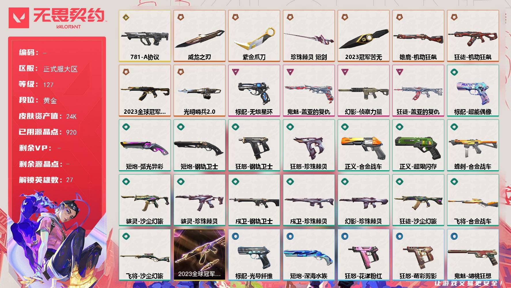 【游戏多多】 【可二次实名】正式服大区 等级127 27英雄 60皮肤 8限定 1终极 4卓越 【套装】:2023全球冠军赛套装【英雄】:幻棱,炼狱,维斯,暮蝶,壹决,铁臂,捷风,雷兹,幽影,不死鸟,贤者,猎枭,蝰蛇,零,芮娜,奇乐,尚勃勒,霓虹,斯凯,夜露,星礈,K/O,海神,盖可,黑梦,钢锁【近战武器】:近战武器-2023全球冠军赛 苦无,近战武器-紫金爪刀,近战武器-威龙之刃,近战武器-珍珠棘贝 短剑【狂徒】:狂徒-2023全球冠军赛,狂徒-机动狂飙,狂徒-盖亚的复仇,狂徒-沙尘幻旅【幻影】:幻影-侦察力量,幻影-珍珠棘贝,幻影-白日幻梦,幻影-战术小伙伴【戍卫】:戍卫-钢轨卫士,戍卫-珍珠棘贝,戍卫-花漾粉红,戍卫-萌彩剪影【獠犬】:獠犬-781-A协议,獠犬-复古浪潮,獠犬-胡桃狂想,獠犬-数码咒术【冥驹】:冥驹-复古浪潮,冥驹-胡桃狂想,冥驹-花漾粉红,冥驹-沙场老兵【飞将】:飞将-合金战车,飞将-沙尘幻旅,飞将-光导纤维【莽侠】:莽侠-深海水族【战神】:战神-萌彩剪影,战神-深海水族,战神-数码咒术【奥丁】:奥丁-光明哨兵//2.0,奥丁-战术小伙伴【判官】:判官-萌彩剪影,判官-数码咒术【雄鹿】:雄鹿-机动狂飙,雄鹿-复古浪潮【骇灵】:骇灵-沙尘幻旅,骇灵-珍珠棘贝,骇灵-光导纤维,骇灵-花漾粉红【蜂刺】:蜂刺-合金战车,蜂刺-胡桃狂想,蜂刺-深海水族,蜂刺-战术小伙伴【标配】:标配-无垠星环,标配-光导纤维,标配-超能偶像【正义】:正义-超限闪存,正义-合金战车,正义-复古浪潮【鬼魅】:鬼魅-盖亚的复仇,鬼魅-胡桃狂想【狂怒】:狂怒-钢轨卫士,狂怒-珍珠棘贝,狂怒-花漾粉红,狂怒-萌彩剪影【短炮】:短炮-钢轨卫士,短炮-弧光异彩,短炮-深海水族【详情请看截图,皮肤可能含有某些特权皮肤,具体以游戏内实际拥有为准】