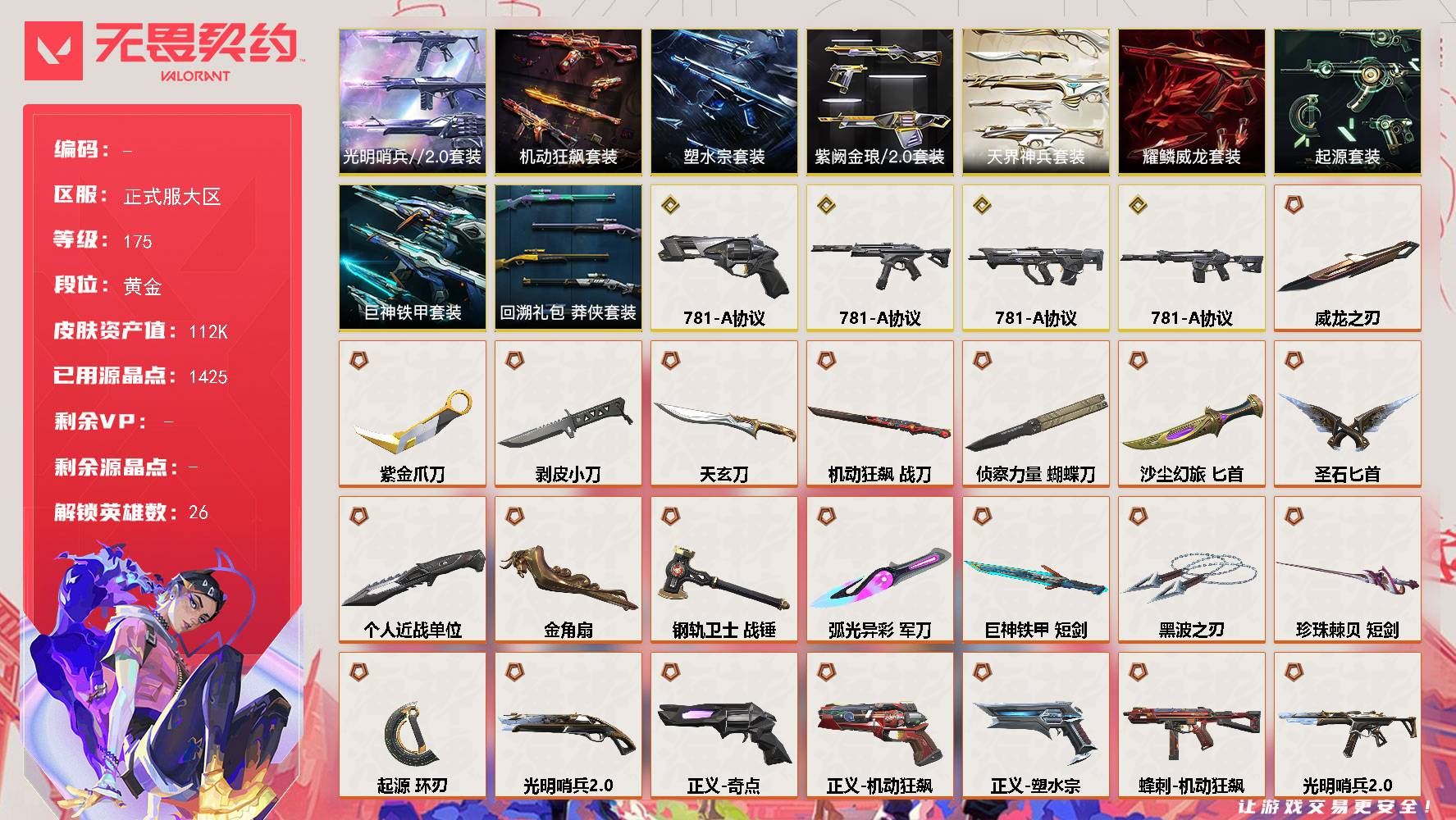 【游戏多多】 【可包人脸】正式服大区 等级175 26英雄 124皮肤 38限定 4终极 24卓越 【套装】:781-A协议套装,光明哨兵//2.0套装,机动狂飙套装,起源套装,塑水宗套装,天界神兵套装,耀鳞威龙套装,紫阙金琅//2.0套装,回溯礼包:莽侠套装,巨神铁甲套装【英雄】:炼狱,维斯,暮蝶,钛狐,壹决,铁臂,捷风,雷兹,幽影,不死鸟,贤者,猎枭,蝰蛇,零,芮娜,奇乐,尚勃勒,霓虹,斯凯,夜露,星礈,K/O,海神,盖可,黑梦,钢锁【近战武器】:近战武器-侦察力量 蝴蝶刀,近战武器-剥皮小刀,近战武器-紫金爪刀,近战武器-黑波之刃,近战武器-威龙之刃,近战武器-巨神铁甲 短剑,近战武器-珍珠棘贝 短剑,近战武器-钢轨卫士 战锤,近战武器-个人近战单位,近战武器-弧光异彩 军刀【狂徒】:狂徒-归零者,狂徒-机动狂飙,狂徒-塑水宗,狂徒-偃月苍龙,狂徒-冰点凝冻,狂徒-盖亚的复仇,狂徒-起源,狂徒-耀鳞威龙,狂徒-紫阙金琅,狂徒-钢轨卫士【幻影】:幻影-781-A协议,幻影-光明哨兵//2.0,幻影-砰砰X特攻队,幻影-奇点,幻影-紫阙金琅//2.0,幻影-巨神铁甲,幻影-噬源兽防卫工程,幻影-珍珠棘贝,幻影-战术小伙伴【戍卫】:戍卫-天界神兵,戍卫-侦察力量,戍卫-钢轨卫士,戍卫-珍珠棘贝,戍卫-彩梦之城,戍卫-萌彩剪影【獠犬】:獠犬-781-A协议,獠犬-归零者,獠犬-弧光异彩,獠犬-复古浪潮,獠犬-胡桃狂想,獠犬-战术小伙伴【冥驹】:冥驹-归零者,冥驹-偃月苍龙,冥驹-冰点凝冻,冥驹-起源,冥驹-复古浪潮,冥驹-胡桃狂想【飞将】:飞将-塑水宗,飞将-天界神兵,飞将-沙尘幻旅,飞将-信手涂鸦,飞将-光导纤维【莽侠】:莽侠-无人之境,莽侠-异彩晶棱//回溯,莽侠-深海水族【战神】:战神-奇点,战神-盖亚的复仇//2.0,战神-萌彩剪影,战神-深海水族【奥丁】:奥丁-光明哨兵//2.0,奥丁-紫阙金琅//2.0,奥丁-巨神铁甲,奥丁-信手涂鸦,奥丁-战术小伙伴【判官】:判官-偃月苍龙,判官-萌彩剪影【雄鹿】:雄鹿-机动狂飙,雄鹿-盖亚的复仇//2.0,雄鹿-起源,雄鹿-紫阙金琅//2.0,雄鹿-彩梦之城,雄鹿-复古浪潮【骇灵】:骇灵-781-A协议,骇灵-光明哨兵//2.0,骇灵-塑水宗,骇灵-沙尘幻旅,骇灵-珍珠棘贝,骇灵-光导纤维,骇灵-信手涂鸦【蜂刺】:蜂刺-机动狂飙,蜂刺-天界神兵,蜂刺-弧光异彩,蜂刺-胡桃狂想,蜂刺-深海水族,蜂刺-战术小伙伴【标配】:标配-紫阙金琅,标配-彩梦之城,标配-光导纤维,标配-超能偶像【正义】:正义-781-A协议,正义-机动狂飙,正义-奇点,正义-塑水宗,正义-超限闪存,正义-沙尘幻旅,正义-复古浪潮,正义-纳米打击【鬼魅】:鬼魅-盖世英雄,鬼魅-天界神兵,鬼魅-耀鳞威龙,鬼魅-光导纤维,鬼魅-胡桃狂想,鬼魅-信手涂鸦【狂怒】:狂怒-起源,狂怒-紫阙金琅//2.0,狂怒-钢轨卫士,狂怒-巨神铁甲,狂怒-珍珠棘贝,狂怒-萌彩剪影,狂怒-喷火式【短炮】:短炮-光明哨兵//2.0,短炮-钢轨卫士,短炮-弧光异彩,短炮-深海水族【详情请看截图,皮肤可能含有某些特权皮肤,具体以游戏内实际拥有为准】