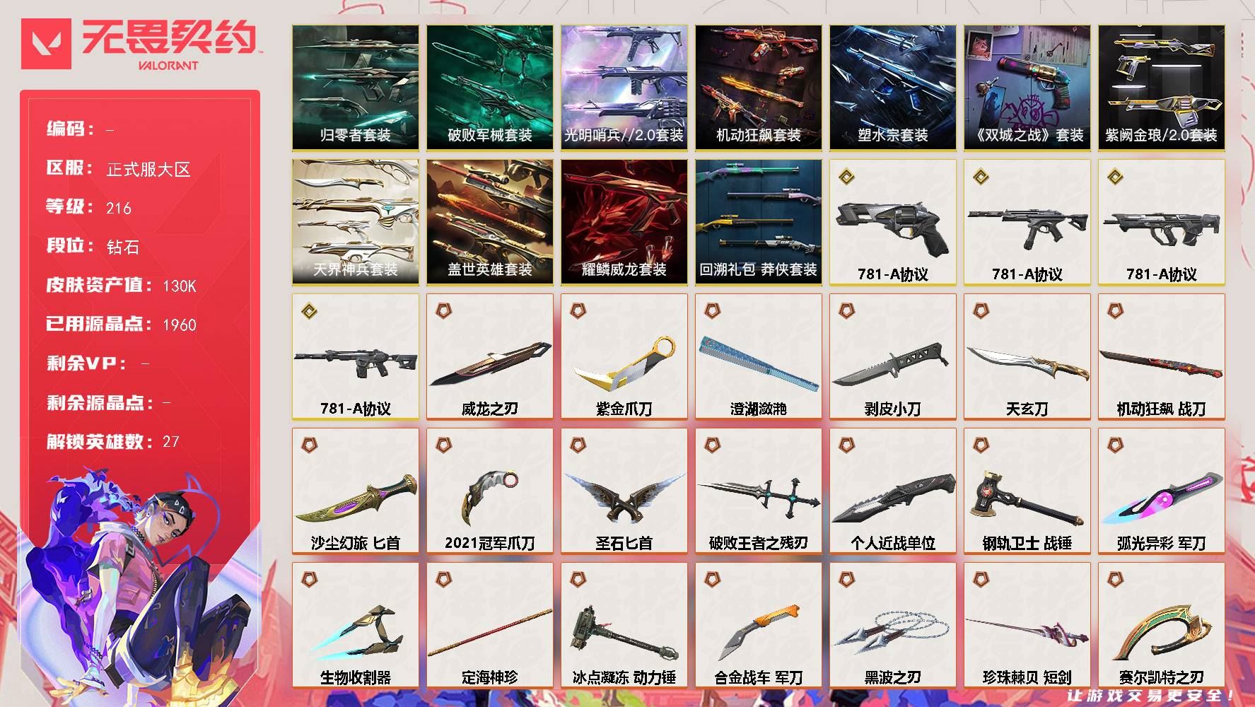 【游戏多多】 【可包人脸】正式服大区 等级216 27英雄 181皮肤 52限定 4终极 23卓越 【套装】:2021全球冠军赛套装,781-A协议套装,光明哨兵//2.0套装,归零者套装,盖世英雄套装,机动狂飙套装,破败军械套装,塑水宗套装,天界神兵套装,耀鳞威龙套装【英雄】:幻棱,炼狱,维斯,暮蝶,钛狐,壹决,铁臂,捷风,雷兹,幽影,不死鸟,贤者,猎枭,蝰蛇,零,芮娜,奇乐,尚勃勒,霓虹,斯凯,夜露,星礈,K/O,海神,盖可,黑梦,钢锁【近战武器】:近战武器-2021全球冠军赛 爪刀,近战武器-剥皮小刀,近战武器-紫金爪刀,近战武器-黑波之刃,近战武器-威龙之刃,近战武器-澄湖潋滟,近战武器-冰点凝冻 动力锤,近战武器-珍珠棘贝 短剑,近战武器-流星兵团 短剑,近战武器-定海神珍【狂徒】:狂徒-2023全球冠军赛,狂徒-2021全球冠军赛,狂徒-归零者,狂徒-机动狂飙,狂徒-塑水宗,狂徒-偃月苍龙,狂徒-冰点凝冻,狂徒-盖世英雄,狂徒-盖亚的复仇,狂徒-耀鳞威龙【幻影】:幻影-781-A协议,幻影-光明哨兵//2.0,幻影-破败军械,幻影-奇点,幻影-紫阙金琅//2.0,幻影-合金战车,幻影-噬源兽防卫工程,幻影-珍珠棘贝,幻影-战术小伙伴,幻影-聚合之力【戍卫】:戍卫-破败军械,戍卫-天界神兵,戍卫-钢轨卫士,戍卫-珍珠棘贝,戍卫-彩梦之城,戍卫-花漾粉红,戍卫-萌彩剪影,戍卫-超能偶像,戍卫-逆冲蛮牛,戍卫-战术熊与伙伴们【獠犬】:獠犬-781-A协议,獠犬-归零者,獠犬-冰点凝冻,獠犬-弧光异彩,獠犬-复古浪潮,獠犬-胡桃狂想,獠犬-数码咒术,獠犬-战术小伙伴,獠犬-采蜜小蜂队,獠犬-逆冲蛮牛【冥驹】:冥驹-归零者,冥驹-偃月苍龙,冥驹-冰点凝冻,冥驹-盖世英雄,冥驹-起源,冥驹-无垠星环,冥驹-复古浪潮,冥驹-胡桃狂想,冥驹-花漾粉红,冥驹-沙场老兵【飞将】:飞将-塑水宗,飞将-天界神兵,飞将-合金战车,飞将-沙尘幻旅,飞将-信手涂鸦,飞将-光导纤维,飞将-聚合之力,飞将-战术熊与伙伴们【莽侠】:莽侠-无人之境,莽侠-异彩晶棱//回溯,莽侠-深海水族,莽侠-纤云弄巧【战神】:战神-奇点,战神-盖世英雄,战神-采蜜小蜂队,战神-萌彩剪影,战神-深海水族,战神-数码咒术【奥丁】:奥丁-光明哨兵//2.0,奥丁-紫阙金琅//2.0,奥丁-巨神铁甲,奥丁-信手涂鸦,奥丁-战术小伙伴,奥丁-流星兵团,奥丁-纳米打击【判官】:判官-偃月苍龙,判官-萌彩剪影,判官-数码咒术,判官-超能偶像,判官-采蜜小蜂队,判官-纳米打击x【雄鹿】:雄鹿-机动狂飙,雄鹿-紫阙金琅//2.0,雄鹿-彩梦之城,雄鹿-复古浪潮,雄鹿-逆冲蛮牛【骇灵】:骇灵-781-A协议,骇灵-光明哨兵//2.0,骇灵-破败军械,骇灵-塑水宗,骇灵-沙尘幻旅,骇灵-珍珠棘贝,骇灵-光导纤维,骇灵-花漾粉红,骇灵-信手涂鸦,骇灵-荒土机兵【蜂刺】:蜂刺-机动狂飙,蜂刺-天界神兵,蜂刺-合金战车,蜂刺-弧光异彩,蜂刺-胡桃狂想,蜂刺-深海水族,蜂刺-战术小伙伴,蜂刺-聚合之力,蜂刺-纤云弄巧【标配】:标配-冰点凝冻,标配-彩梦之城,标配-光导纤维,标配-超能偶像,标配-荒土机兵,标配-战术熊与伙伴们【正义】:正义-781-A协议,正义-机动狂飙,正义-双城之战,正义-塑水宗,正义-超限闪存,正义-合金战车,正义-沙尘幻旅,正义-复古浪潮,正义-纳米打击,正义-纤云弄巧【鬼魅】:鬼魅-破败军械,鬼魅-盖世英雄,鬼魅-天界神兵,鬼魅-耀鳞威龙,鬼魅-光导纤维,鬼魅-胡桃狂想,鬼魅-数码咒术,鬼魅-信手涂鸦,鬼魅-流星兵团,鬼魅-采蜜小蜂队【狂怒】:狂怒-全息波普,狂怒-紫阙金琅//2.0,狂怒-钢轨卫士,狂怒-珍珠棘贝,狂怒-花漾粉红,狂怒-萌彩剪影,狂怒-聚合之力,狂怒-逆冲蛮牛,狂怒-战术熊与伙伴们【短炮】:短炮-光明哨兵//2.0,短炮-归零者,短炮-钢轨卫士,短炮-弧光异彩,短炮-好搭档,短炮-深海水族,短炮-纤云弄巧【详情请看截图,皮肤可能含有某些特权皮肤,具体以游戏内实际拥有为准】