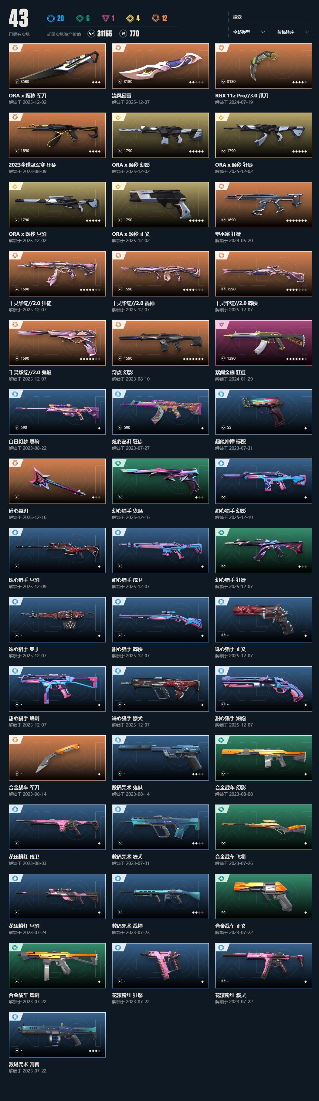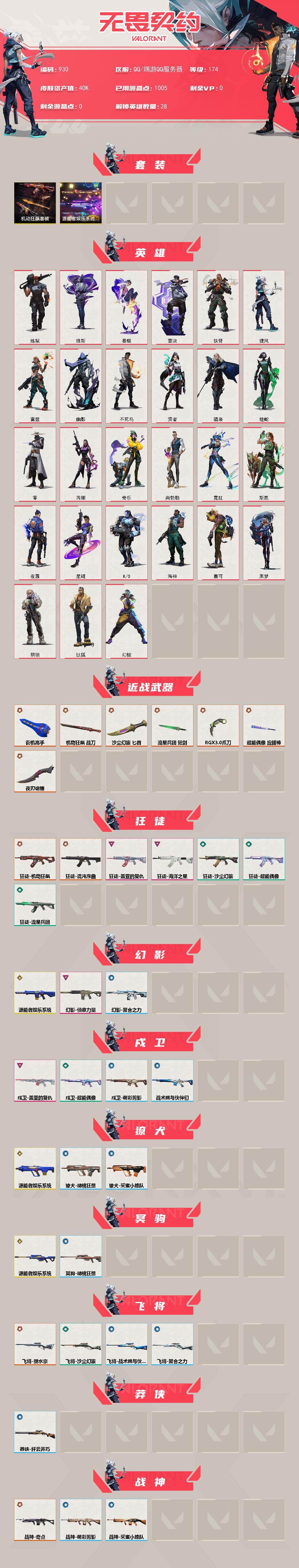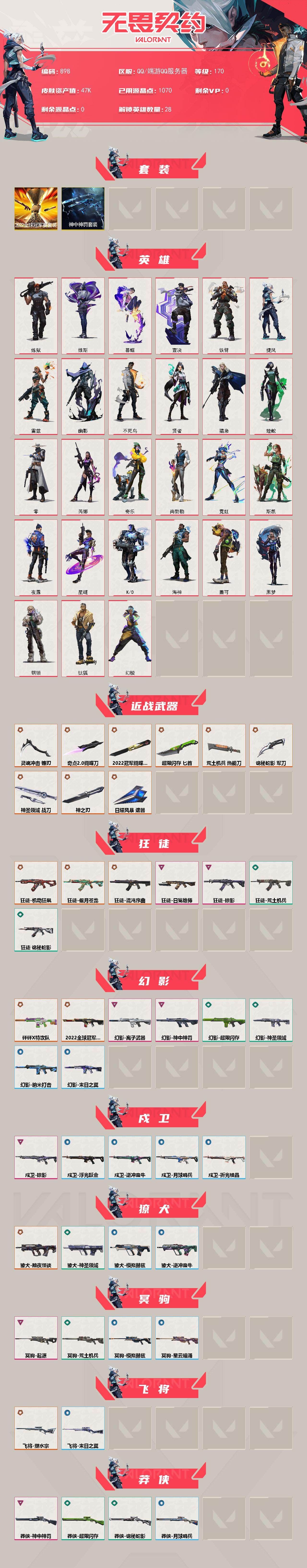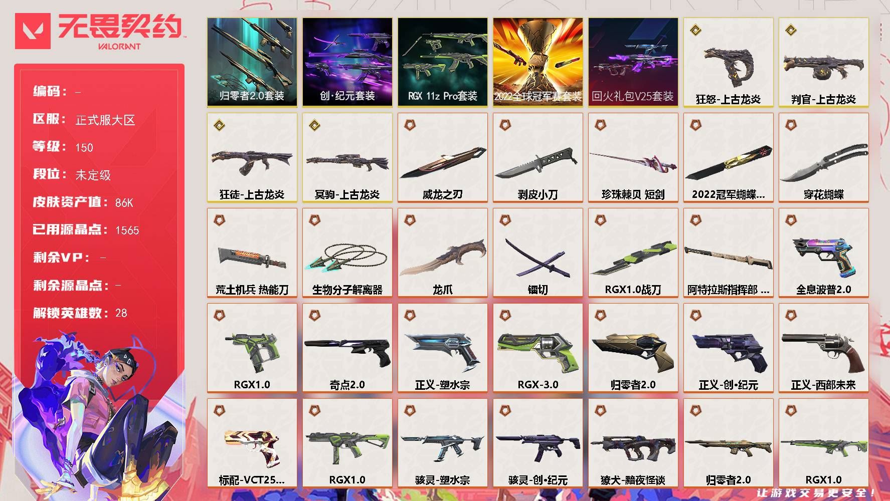 【游戏多多】 【可二次实名】正式服大区 等级150 28英雄 107皮肤 35限定 4终极 10卓越 【套装】:2022全球冠军赛套装,上古龙炎套装,回火礼包// V25套装,RGX 11z Pro套装,创·纪元套装,归零者//2.0套装【英雄】:幻棱,炼狱,维斯,暮蝶,钛狐,壹决,铁臂,捷风,雷兹,幽影,不死鸟,贤者,猎枭,蝰蛇,零,芮娜,奇乐,尚勃勒,霓虹,斯凯,夜露,星礈,K/O,海神,盖可,黑梦,钢锁【近战武器】:近战武器-剥皮小刀,近战武器-威龙之刃,近战武器-珍珠棘贝 短剑,近战武器-2022全球冠军赛 蝴蝶刀,近战武器-RGX 11z Pro 战刀,近战武器-穿花蝴蝶,近战武器-镭切,近战武器-龙爪,近战武器-荒土机兵 热能刀,近战武器-生物分子解离器【狂徒】:狂徒-堕天遗武,狂徒-日冕雄师,狂徒-紫阙金琅,狂徒-上古龙炎,狂徒-光明哨兵,狂徒-混沌序曲,狂徒-创·纪元,狂徒-RGX 11z Pro,狂徒-荒土机兵,狂徒-诡秘蛇影【幻影】:幻影-天界神兵//2.0,幻影-珍珠棘贝,幻影-2022全球冠军赛,幻影-归零者//2.0,幻影-神圣领域,幻影-纳米打击【戍卫】:戍卫-紫阙金琅,戍卫-珍珠棘贝,戍卫-归零者//2.0,戍卫-RGX 11z Pro,戍卫-逆冲蛮牛,戍卫-月球哨兵,戍卫-折光棱晶【獠犬】:獠犬-复古浪潮,獠犬-黯夜怪谈,獠犬-神圣领域,獠犬-逆冲蛮牛,獠犬-星航勇进【冥驹】:冥驹-堕天遗武,冥驹-复古浪潮,冥驹-上古龙炎,冥驹-荒土机兵,冥驹-星云暗涌【飞将】:飞将-塑水宗,飞将-末日之翼【莽侠】:莽侠-深海水族,莽侠-归零者//2.0,莽侠-创·纪元,莽侠-月球哨兵【战神】:战神-神圣领域,战神-深海水族【奥丁】:奥丁-纳米打击【判官】:判官-上古龙炎,判官-诡秘蛇影,判官-纳米打击x【雄鹿】:雄鹿-般若假面,雄鹿-复古浪潮,雄鹿-逆冲蛮牛,雄鹿-月球哨兵【骇灵】:骇灵-塑水宗,骇灵-珍珠棘贝,骇灵-创·纪元,骇灵-荒土机兵,骇灵-星云暗涌【蜂刺】:蜂刺-深海水族,蜂刺-RGX 11z Pro,蜂刺-星云暗涌,蜂刺-折光棱晶【标配】:标配-全息波普//2.0,标配-荒土机兵,标配-折光棱晶【VCT手枪】:标配-VCT25 x G2【正义】:正义-RGX 11z Pro//3.0,正义-归零者//2.0,正义-塑水宗,正义-创·纪元,正义-西部未来,正义-复古浪潮,正义-纳米打击,正义-月球哨兵【鬼魅】:鬼魅-盖亚的复仇,鬼魅-奇点//2.0,鬼魅-扑棱扑棱【狂怒】:狂怒-珍珠棘贝,狂怒-上古龙炎,狂怒-RGX 11z Pro,狂怒-神圣领域,狂怒-逆冲蛮牛【短炮】:短炮-盖亚的复仇//2.0,短炮-海洋之星,短炮-深海水族,短炮-末日之翼【详情请看截图,皮肤可能含有某些特权皮肤,具体以游戏内实际拥有为准】