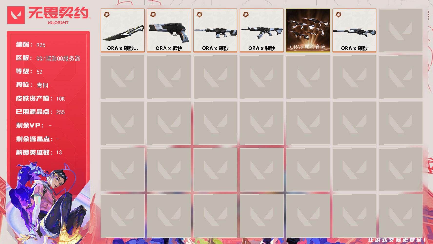 【游戏多多】 【可二次实名】r51994 可二次qq,段位超凡【套装】:2025全球冠军赛套装,无畏契约季前邀请赛套装,ORA x 颗秒套装,RGX 11z Pro//3.0套装,般若假面//2.0套装【英雄】:幻棱,炼狱,维斯,暮蝶,钛狐,壹决,铁臂,捷风,雷兹,幽影,不死鸟,贤者,猎枭,蝰蛇,零,芮娜,奇乐,尚勃勒,霓虹,斯凯,夜露,星礈,K/O,海神,盖可,黑梦,钢锁【近战武器】:近战武器-2025全球冠军赛 蝴蝶刀,近战武器-无畏契约季前邀请赛 悲悯之刃,近战武器-ORA x 颗秒 军刀,近战武器-穿花蝴蝶,近战武器-侦察力量 蝴蝶刀,近战武器-剥皮小刀,近战武器-RGX 11z Pro//3.0 爪刀,近战武器-鬼丸国纲,近战武器-荒土机兵 热能刀,近战武器-金角扇,近战武器-神圣领域 战刀,近战武器-星际猎兵 短剑【狂徒】:狂徒-2025全球冠军赛,狂徒-混沌序曲,狂徒-塑水宗,狂徒-偃月苍龙,狂徒-ORA x 颗秒,狂徒-般若假面//2.0,狂徒-盖亚的复仇,狂徒-日冕雄师,狂徒-荒土机兵【幻影】:幻影-黯夜怪谈,幻影-ORA x 颗秒,幻影-紫阙金琅//2.0,幻影-神圣领域,幻影-纳米打击【戍卫】:戍卫-天界神兵,戍卫-逆冲蛮牛,戍卫-月球哨兵【獠犬】:獠犬-般若假面//2.0,獠犬-神圣领域,獠犬-逆冲蛮牛【冥驹】:冥驹-ORA x 颗秒,冥驹-堕天遗武,冥驹-荒土机兵,冥驹-沙场老兵,冥驹-星云暗涌【飞将】:飞将-塑水宗【莽侠】:莽侠-RGX 11z Pro//3.0,莽侠-月球哨兵【战神】:战神-般若假面//2.0,战神-神圣领域【奥丁】:奥丁-天界神兵//2.0,奥丁-纳米打击【判官】:判官-纳米打击x【雄鹿】:雄鹿-起源,雄鹿-逆冲蛮牛,雄鹿-月球哨兵【骇灵】:骇灵-荒土机兵,骇灵-星云暗涌【蜂刺】:蜂刺-星云暗涌【追猎】:追猎-掠影//3.0【标配】:标配-荒土机兵【VCT手枪】:标配-VCT25 x EDG【正义】:正义-RGX 11z Pro//3.0,正义-西部未来,正义-ORA x 颗秒,正义-纳米打击,正义-月球哨兵【鬼魅】:鬼魅-奇幻朋克,鬼魅-流星兵团,鬼魅-星云暗涌【狂怒】:狂怒-般若假面//2.0,狂怒-神圣领域,狂怒-逆冲蛮牛,各种道具详情看截图、低价出售找回包 赔、截图展示段位不代 表实际段位,如赛季更新等不可抗拒因素发生变化、时限道具不保证所剩时间、标题未写送点劵默认不送【卖号买号首选亿梦】