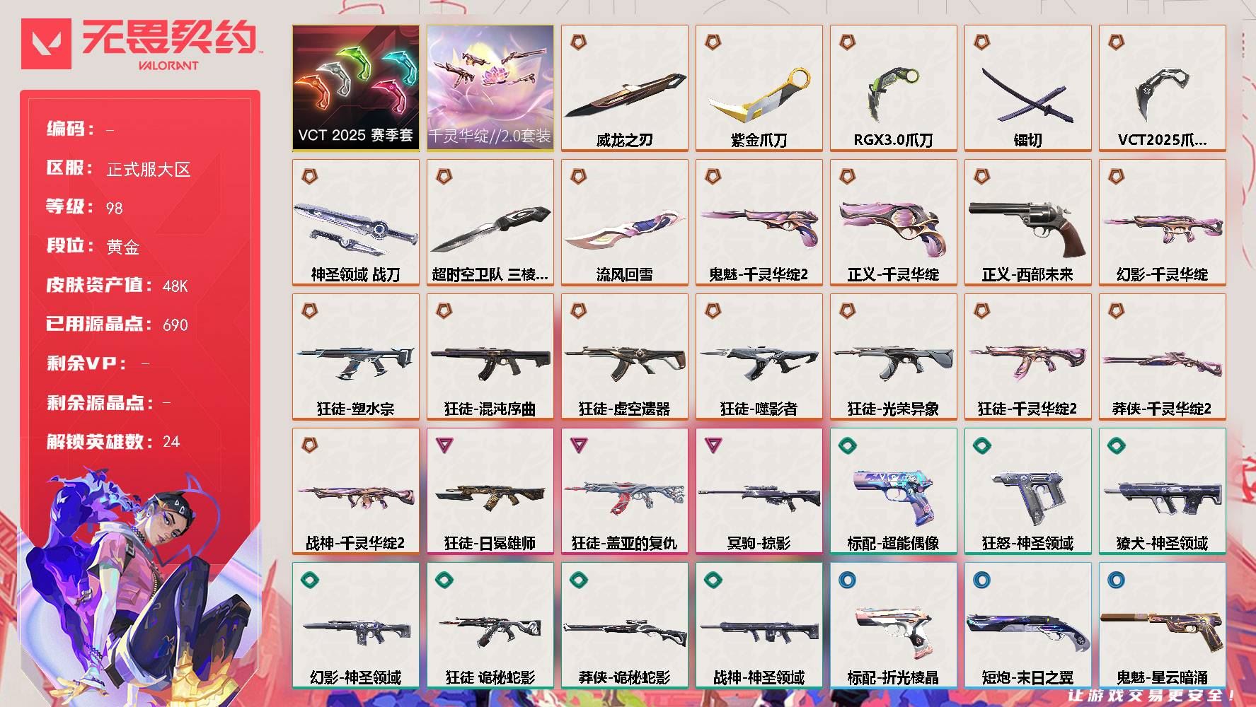 【游戏多多】 【可二次实名】老虎哥2702正式服大区 等级98 24英雄 71皮肤 23限定 0终极 3卓越 【套装】:千灵华绽//2.0套装,VCT 2025 赛季套装【英雄】:幻棱,炼狱,维斯,暮蝶,钛狐,壹决,铁臂,捷风,雷兹,幽影,不死鸟,贤者,猎枭,零,芮娜,奇乐,尚勃勒,霓虹,夜露,星礈,K/O,盖可,黑梦,钢锁【近战武器】:近战武器-紫金爪刀,近战武器-威龙之刃,近战武器-流风回雪,近战武器-超时空卫队 三棱军刺,近战武器-VCT 2025 爪刀,近战武器-RGX 11z Pro//3.0 爪刀,近战武器-镭切,近战武器-神圣领域 战刀【狂徒】:狂徒-塑水宗,狂徒-盖亚的复仇,狂徒-日冕雄师,狂徒-混沌序曲,狂徒-虚空遗器,狂徒-噬影者,狂徒-光荣异象,狂徒-千灵华绽//2.0,狂徒-诡秘蛇影【幻影】:幻影-千灵华绽,幻影-神圣领域【戍卫】:戍卫-月球哨兵,戍卫-折光棱晶【獠犬】:獠犬-神圣领域【冥驹】:冥驹-掠影,冥驹-星云暗涌【飞将】:飞将-末日之翼【莽侠】:莽侠-千灵华绽//2.0,莽侠-诡秘蛇影,莽侠-月球哨兵【战神】:战神-千灵华绽//2.0,战神-神圣领域【奥丁】:奥丁-末日之翼【判官】:判官-诡秘蛇影【雄鹿】:雄鹿-月球哨兵【骇灵】:骇灵-星云暗涌【蜂刺】:蜂刺-星云暗涌,蜂刺-折光棱晶【标配】:标配-超能偶像,标配-折光棱晶【正义】:正义-千灵华绽,正义-西部未来,正义-月球哨兵【鬼魅】:鬼魅-千灵华绽//2.0,鬼魅-星云暗涌【狂怒】:狂怒-神圣领域【短炮】:短炮-末日之翼【详情请看截图,皮肤可能含有某些特权皮肤,具体以游戏内实际拥有为准】